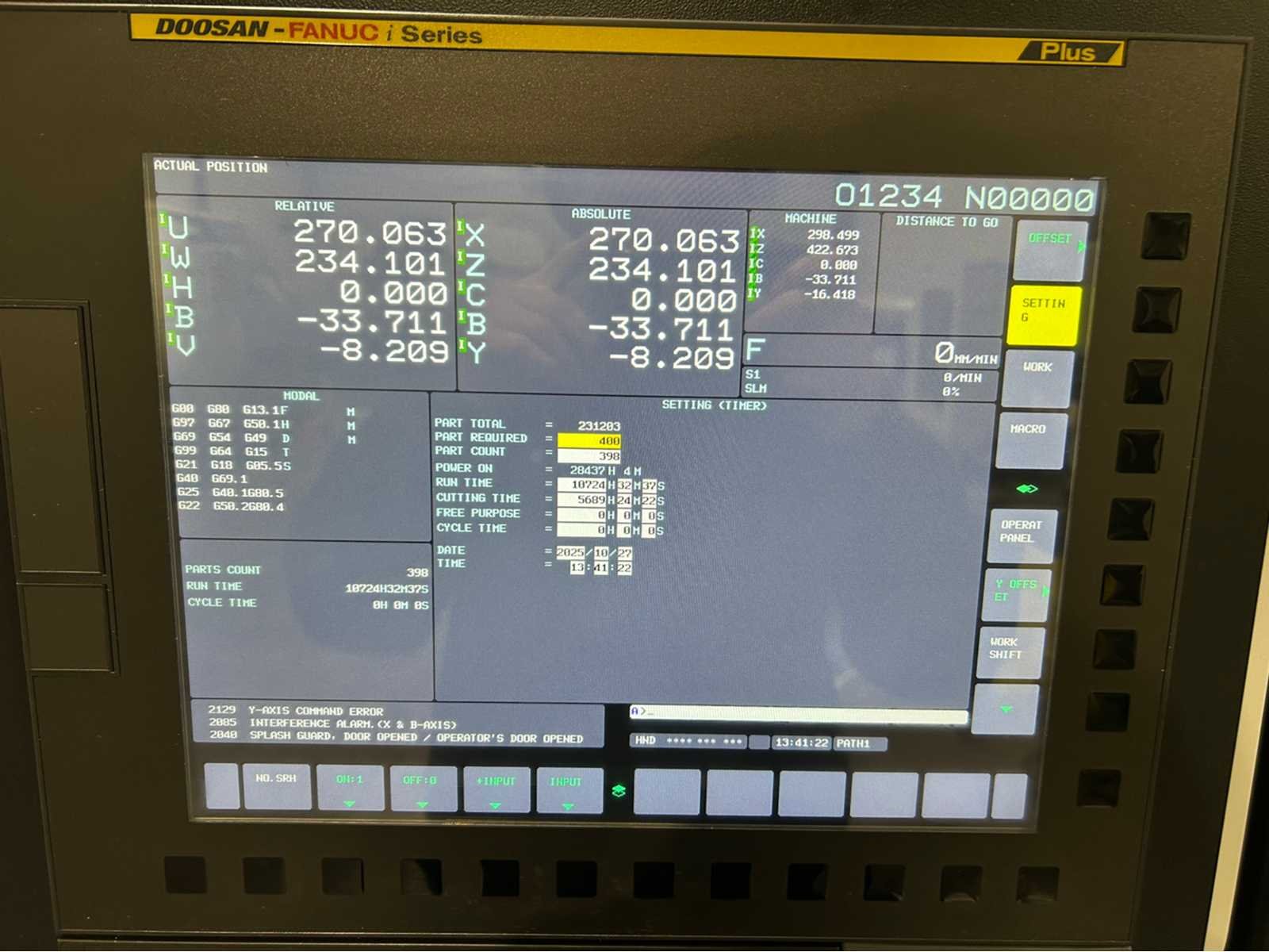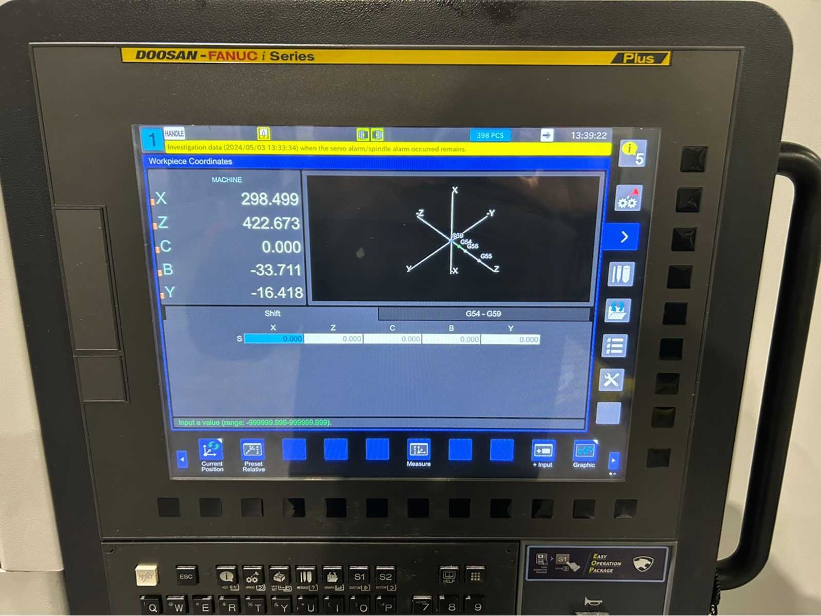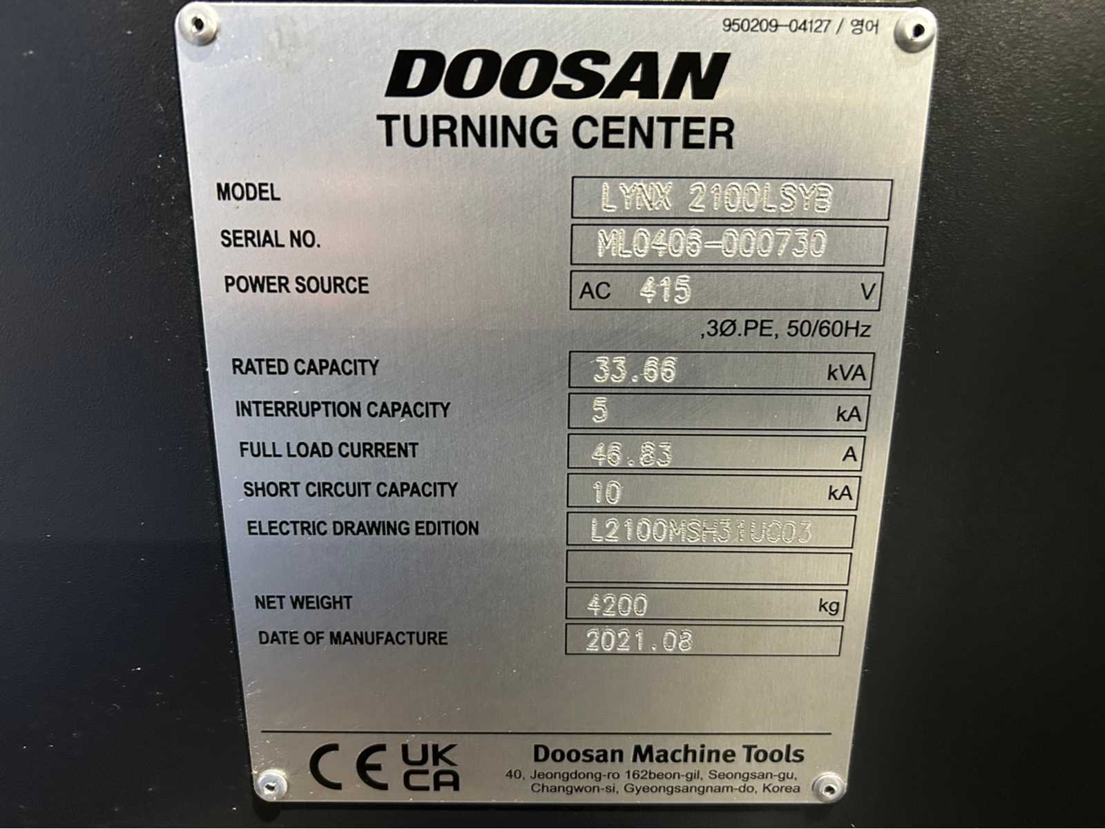 X-as: 205 mm Z-as: 560 mm Y-as: -52,5 mm ~ +52,5 mm C-as: 0,001° Live tooling: ja Live gereedschapssnelheid: 6000 tpm Live gereedschapsvermogen: 3,7kW Subspindel: ja Grootte subspindel: 5" Snelheid subspindel: 6000 tpm Vermogen subspindel: 5,5kW Machine is uitgerust met: - EZ Gids - Eenvoudig te bedienen pakket - onderdeel catcher - gereedschap voorzetter - staaf aanvoer - Doosan bewaking van de gereedschapsbelasting - 128 paar gereedschapscoördinaten - Spiraalvormige interpolatie Merk: Doosan Type: Lynx 2100LSY Bouwjaar: 2021 Serienummer: ML0406-000730 Draai: 170mm Draailengte: 600mm Holle spil Ø: 51mm Snelheid van n =: 1rpm Snelheid tot n =: 6000rpm Aantal gereedschapwisselstations: 12 Koelmiddelpomp: true Spanentransporteur: true CNC-besturing, merk, type: Fanuc i Series Afgelezen urenstand: 5689 Motorvermogen (kW): 15kW Aansluiting: 400V Handboek aanwezig: true Machinegewicht: 4150kg Afmeting l: 2880mm Afmeting b: 1711mm Afmeting h: 1921mm