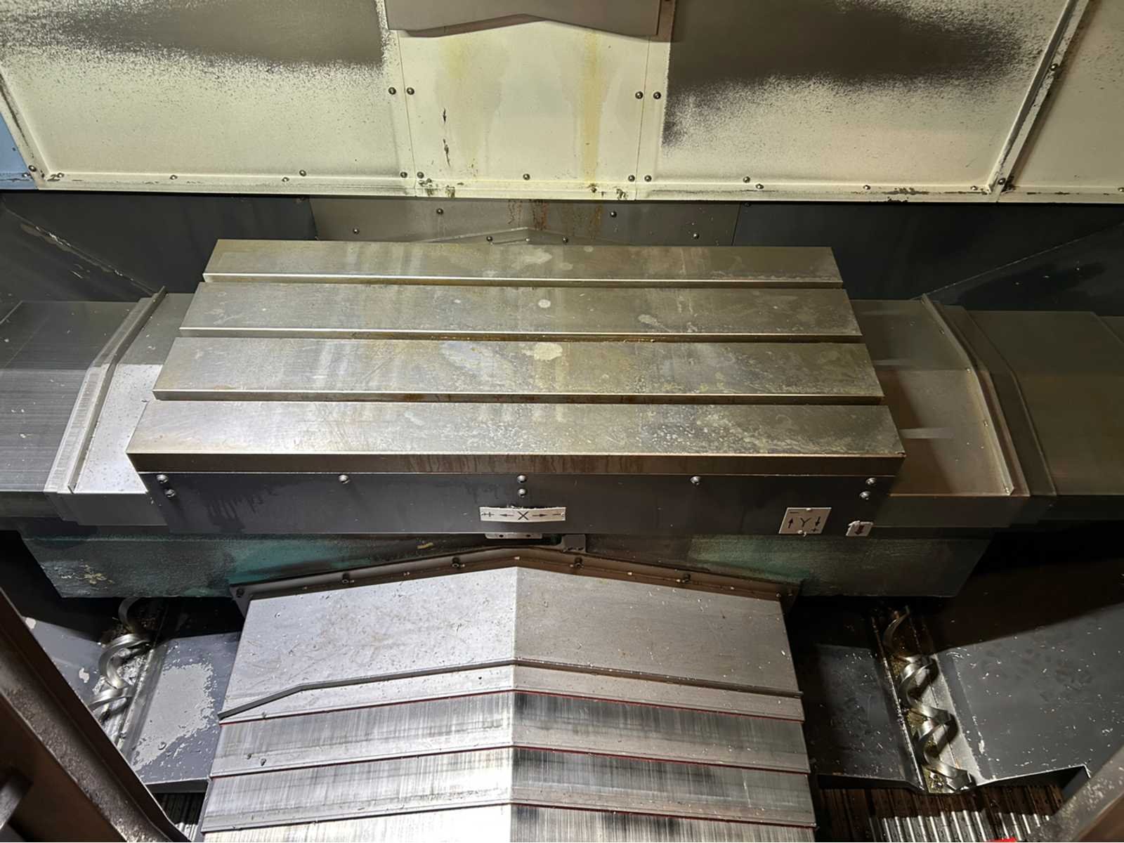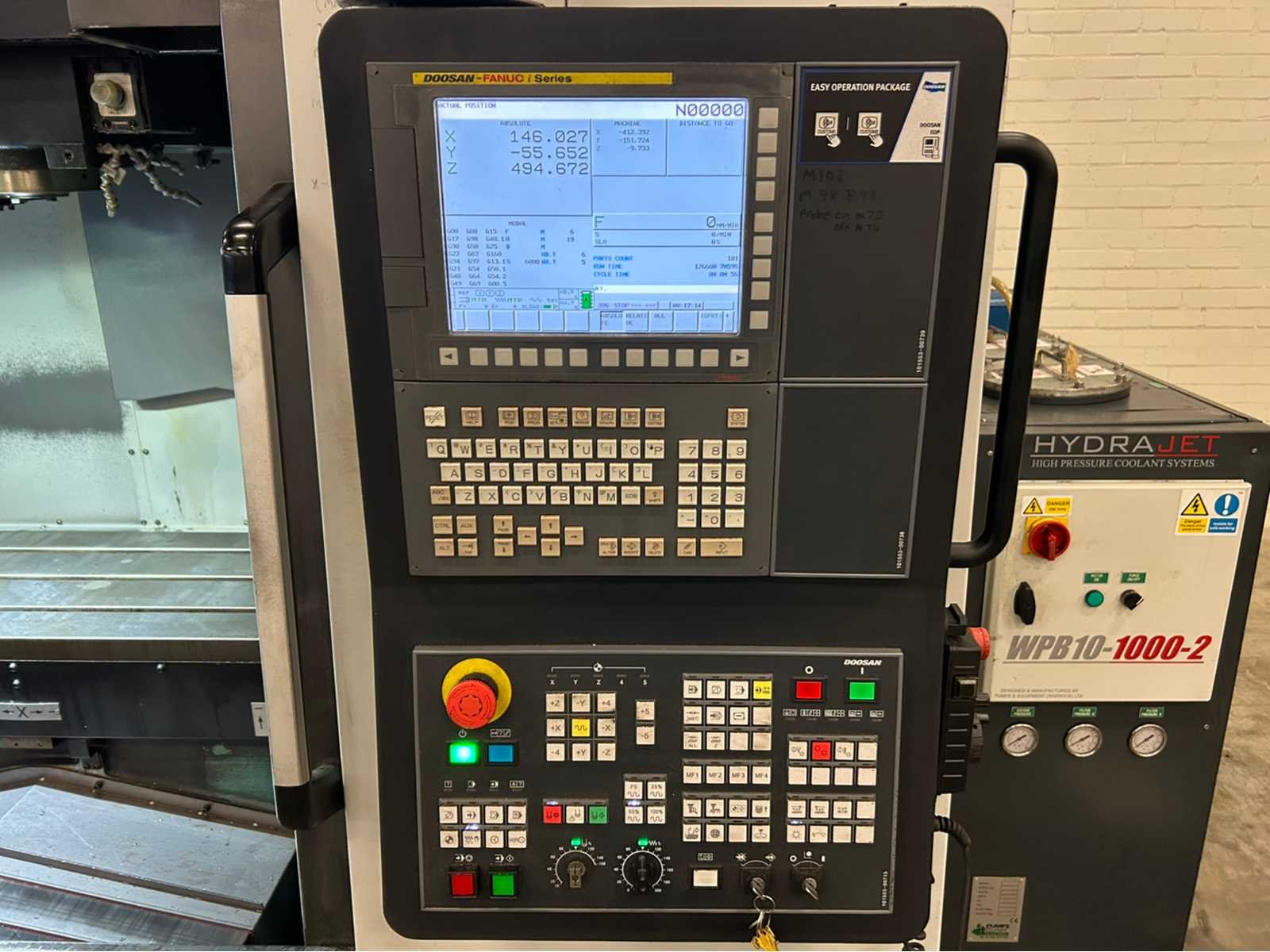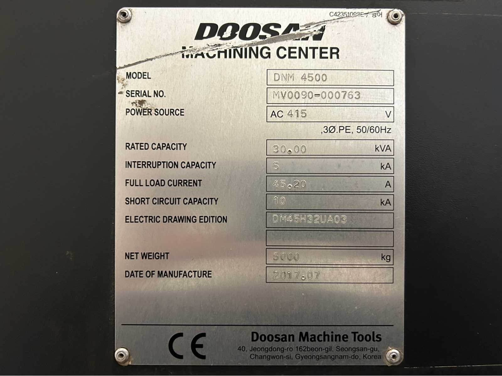 De machine is uitgerust met: ATC met 30 posities, spanentransporteur, Hydra Jet hogedruk door middel van spindelcolling, oliekoeler en nevelfilter. Merk: Doosan Type: DNM 4500 Bouwjaar: 2017 Serienummer: MV0090-000763 Opname iso: SK-40 Verplaatsing x-as: 800mm Verplaatsing y-as: 450mm Verplaatsing z-as: 510mm Snelheid van n =: 1rpm Snelheid tot n =: 12000rpm Afgelezen urenstand: 7315 CNC-besturing, merk, type: Fanuc i Series Spanentransporteur: true Koelmiddelpomp: true Werkstuk gewicht max.: 600kg T-gleuf opspantafelafmeting B: 450mm T-gleuf opspantafelafmeting L: 1000mm -assig: 3 Motorvermogen (kW): 18.5kW Handboek aanwezig: true Aansluiting: 400V Totale afmeting Hoogte: 2700mm Totale afmeting Breedte: 2200mm Totale afmeting L: 2835mm Machinegewicht: 5000kg