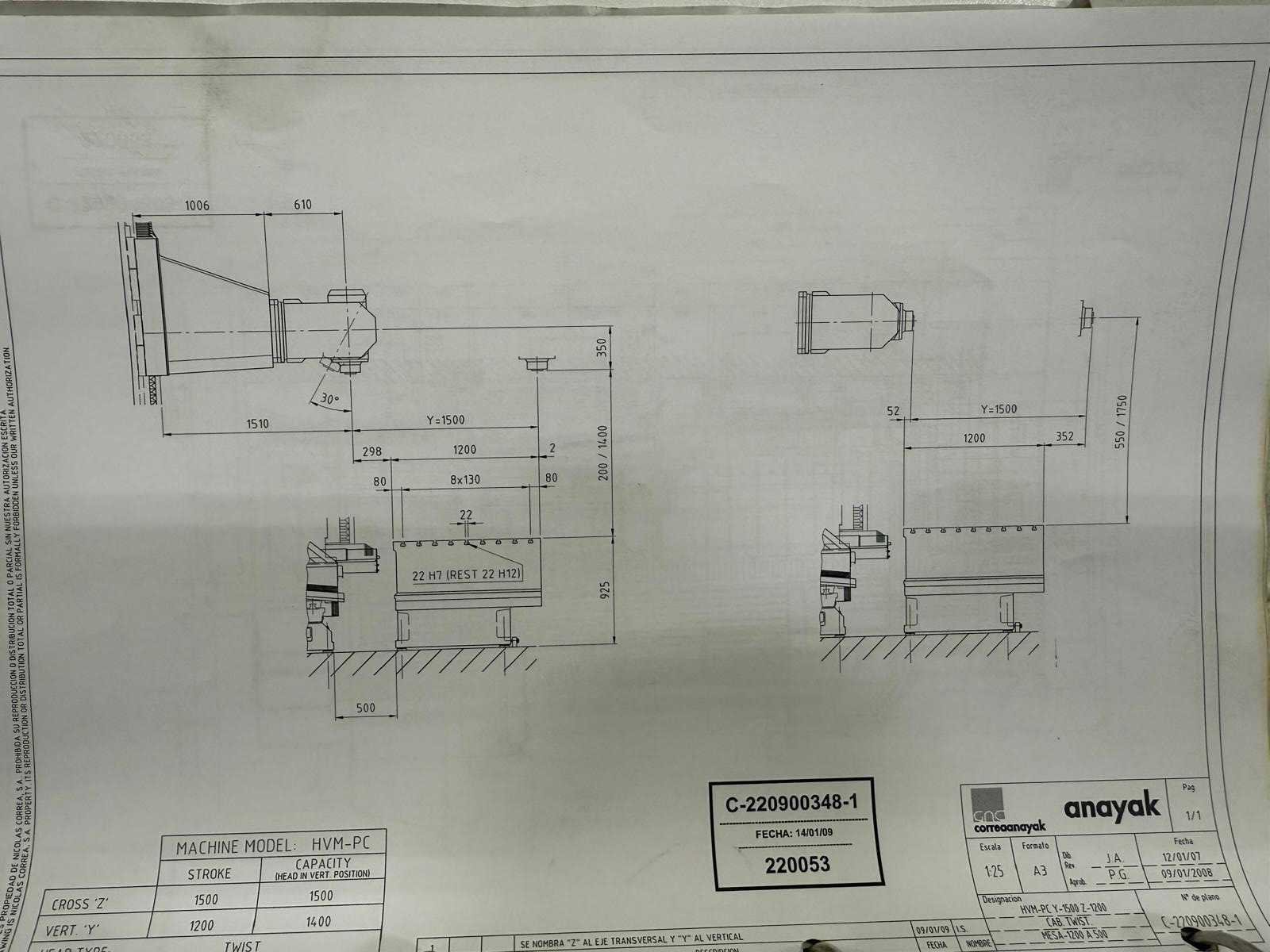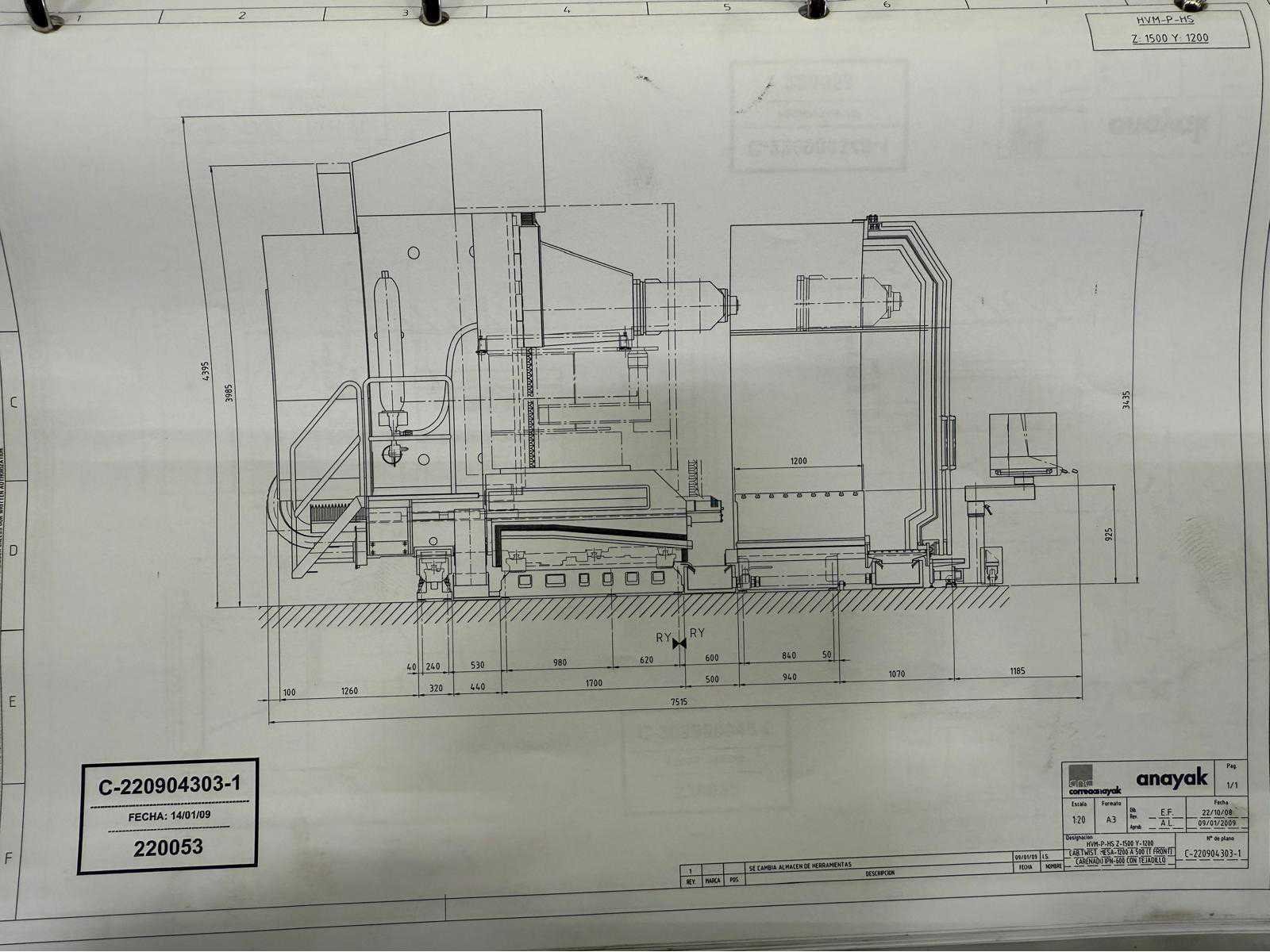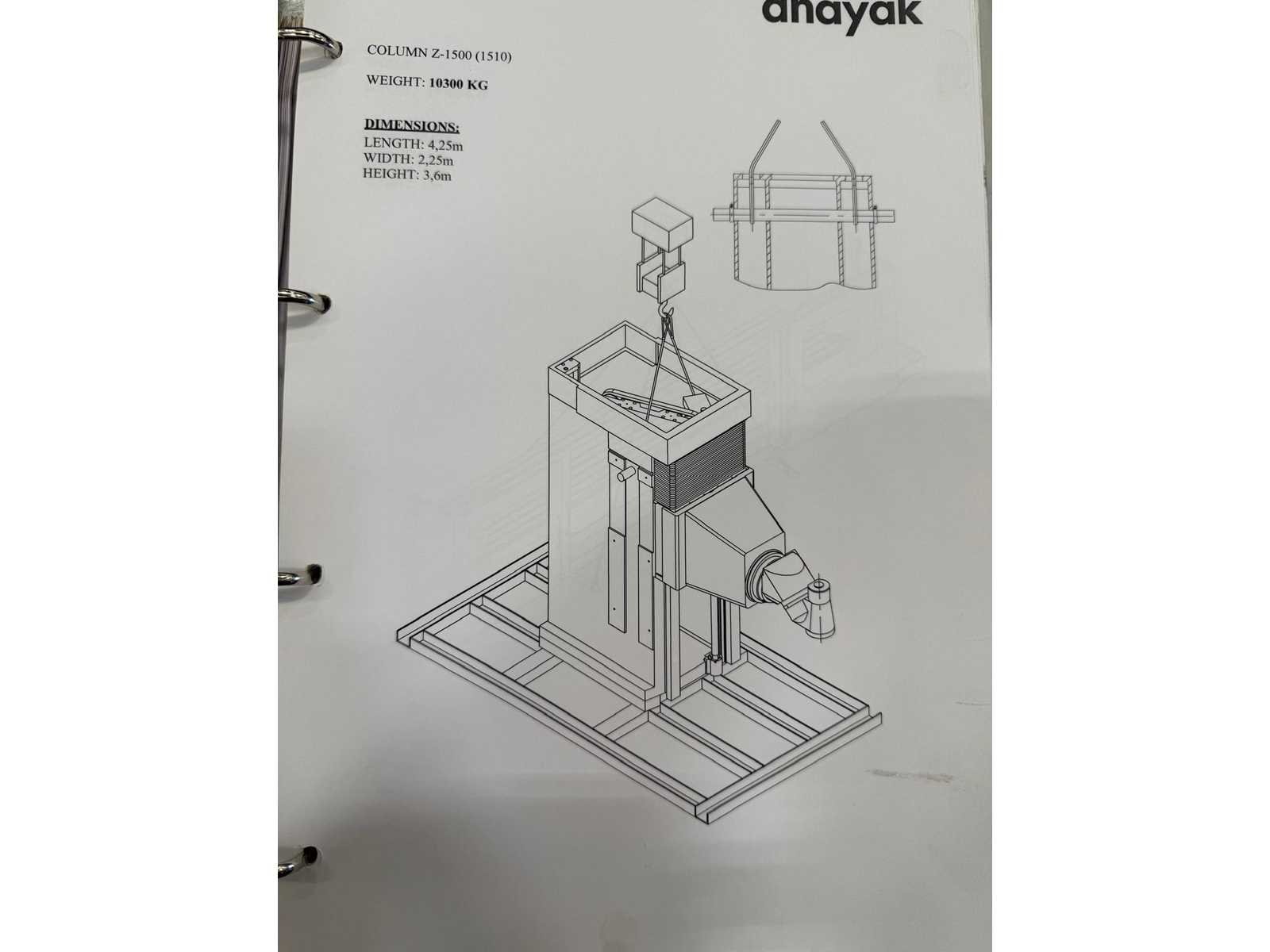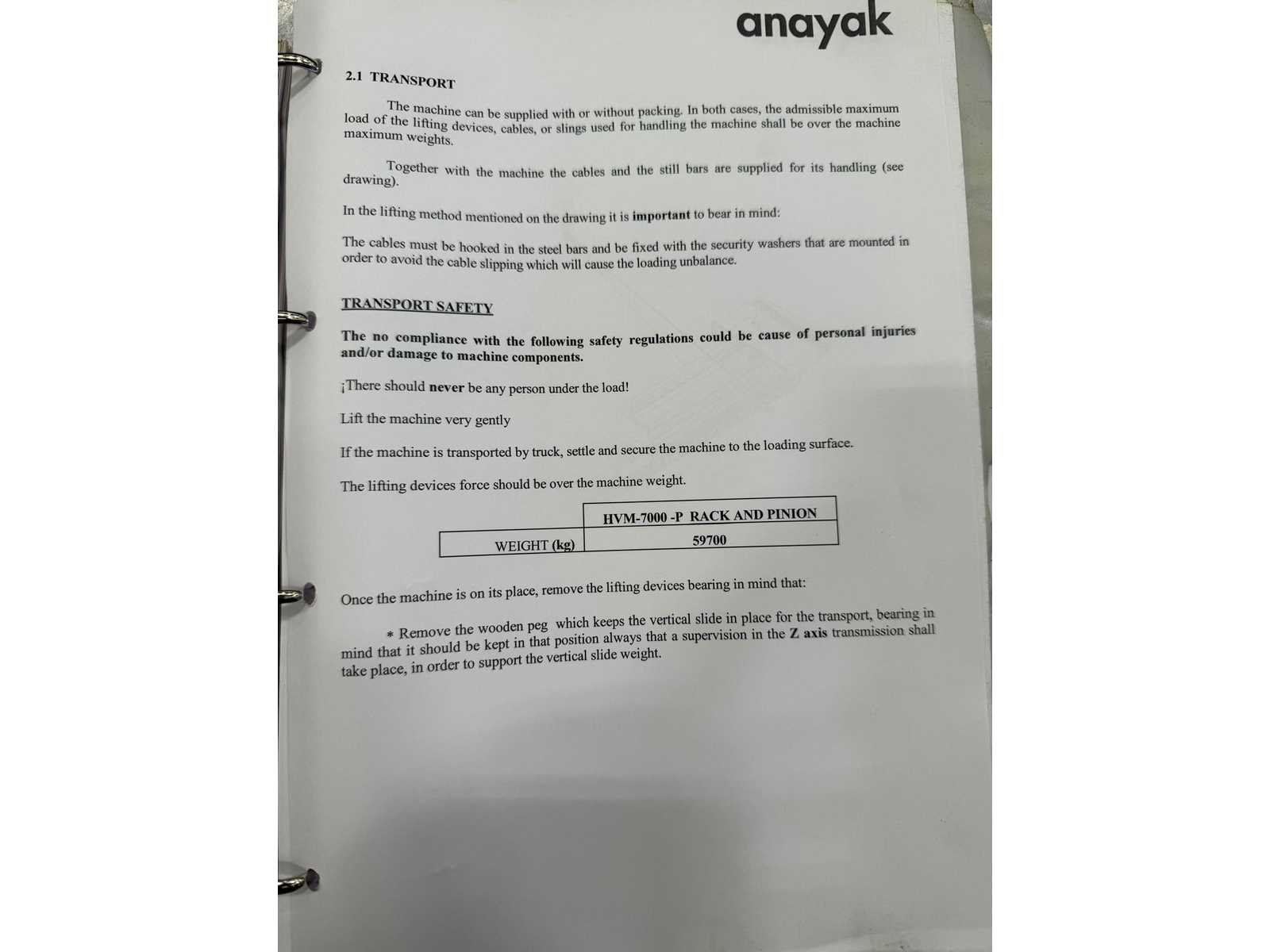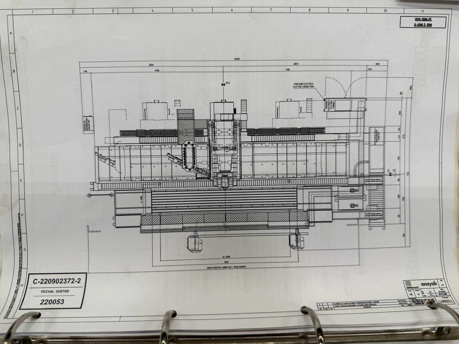 Machine is uitgerust met: NIEUWE SPIL 2025!! spanentransporteurs, door middel van spindelkoeling en oliekoeler. Geen ondeugden! Merk: Anayak Type: HVM-7000-PC Bouwjaar: 2009 Serienummer: 220053 Verplaatsing x-as: 6300mm Verplaatsing y-as: 1200mm Verplaatsing z-as: 1500mm Opname iso: HSK-63 Snelheid van n =: 1rpm Snelheid tot n =: 15000rpm T-gleuf opspantafelafmeting L: 7000mm T-gleuf opspantafelafmeting B: 1200mm Koelmiddelpomp: true Besturing, merk, type: Heidenhain iTNC 530 Aansluiting: 400V Handboek aanwezig: true Machinegewicht: 59700kg Afmeting l: 13000mm Afmeting b: 6000mm Afmeting h: 5000mm