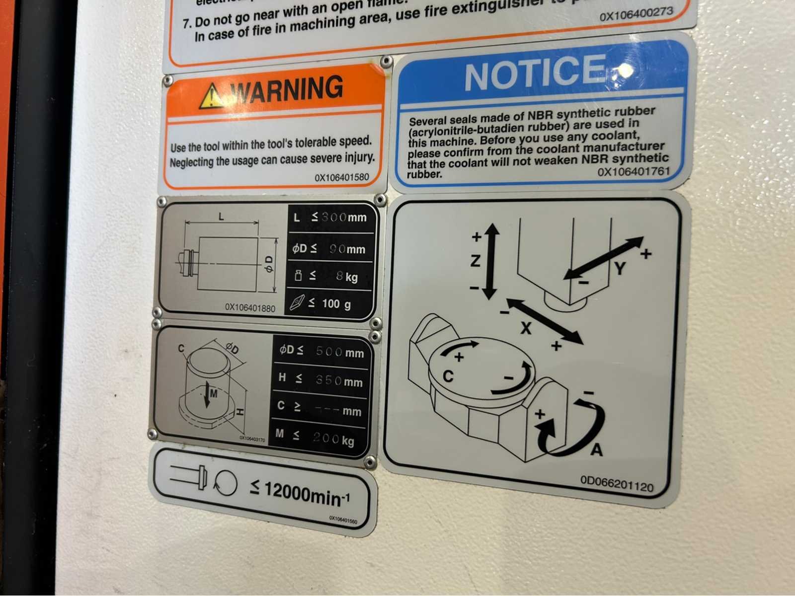 Vice niet inbegrepen Merk: Mazak Type: Variaxis J-500/5X Bouwjaar: 2017 Serienummer: 278346 Opname iso: BT-40 Verplaatsing x-as: 350mm Verplaatsing y-as: 550mm Verplaatsing z-as: 510mm Snelheid van n =: 1rpm Snelheid tot n =: 12000rpm Afgelezen urenstand: 11019 CNC-besturing, merk, type: Mazatrol Smooth Spanentransporteur: true Koelmiddelpomp: true Werkstuk gewicht max.: 200kg T-gleuf opspantafelafmeting B: 400mm T-gleuf opspantafelafmeting L: 500mm -assig: 5 Aansluiting: 400V Totale afmeting Hoogte: 2840mm Totale afmeting Breedte: 3225mm Totale afmeting L: 1900mm Machinegewicht: 6900kg