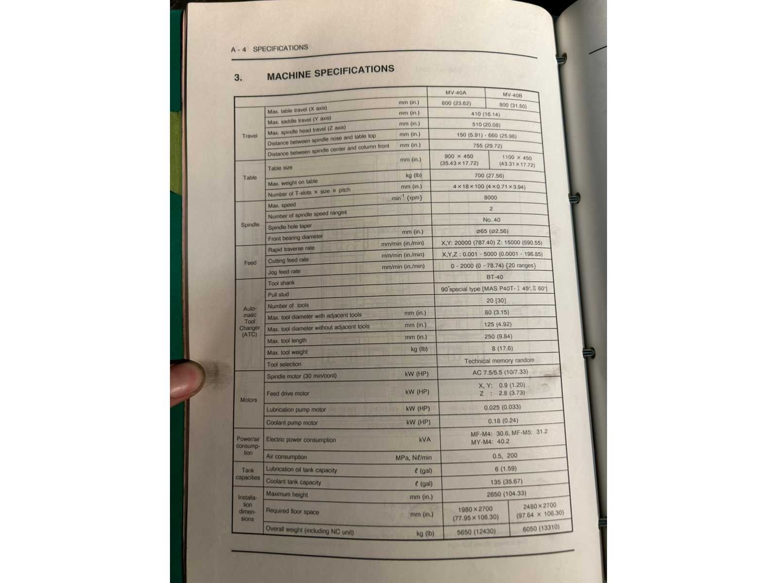Merk: Mori Seiki Type: MV-40B Bouwjaar: 1991 Serienummer: 2720 Opname iso: BT-40 Verplaatsing x-as: 800mm Verplaatsing y-as: 410mm Verplaatsing z-as: 510mm Snelheid van n =: 1rpm Snelheid tot n =: 8000rpm Afgelezen urenstand: 4696 CNC-besturing, merk, type: Fanuc MF-M4 Spanentransporteur: true Koelmiddelpomp: true Werkstuk gewicht max.: 700kg T-gleuf opspantafelafmeting B: 450mm T-gleuf opspantafelafmeting L: 1100mm -assig: 3 Motorvermogen (kW): 7.5kW Handboek aanwezig: true Aansluiting: 400V Totale afmeting Hoogte: 2650mm Totale afmeting Breedte: 2700mm Totale afmeting L: 2450mm Machinegewicht: 6050kg
