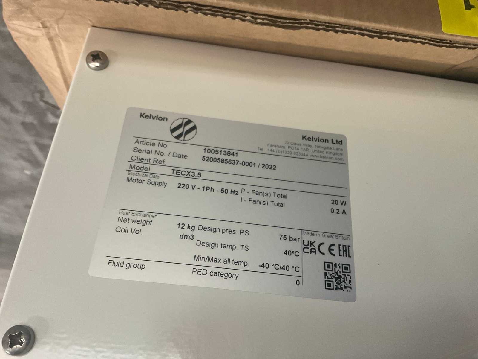Merk: Kelvion Aansluiting: 230V Eigen gewicht: 12kg Type koudemiddel: R744 Totale afmeting Breedte: 870mm Totale afmeting Hoogte: 180mm Totale afmeting L: 380mm Type: TECX 3.5 CO2