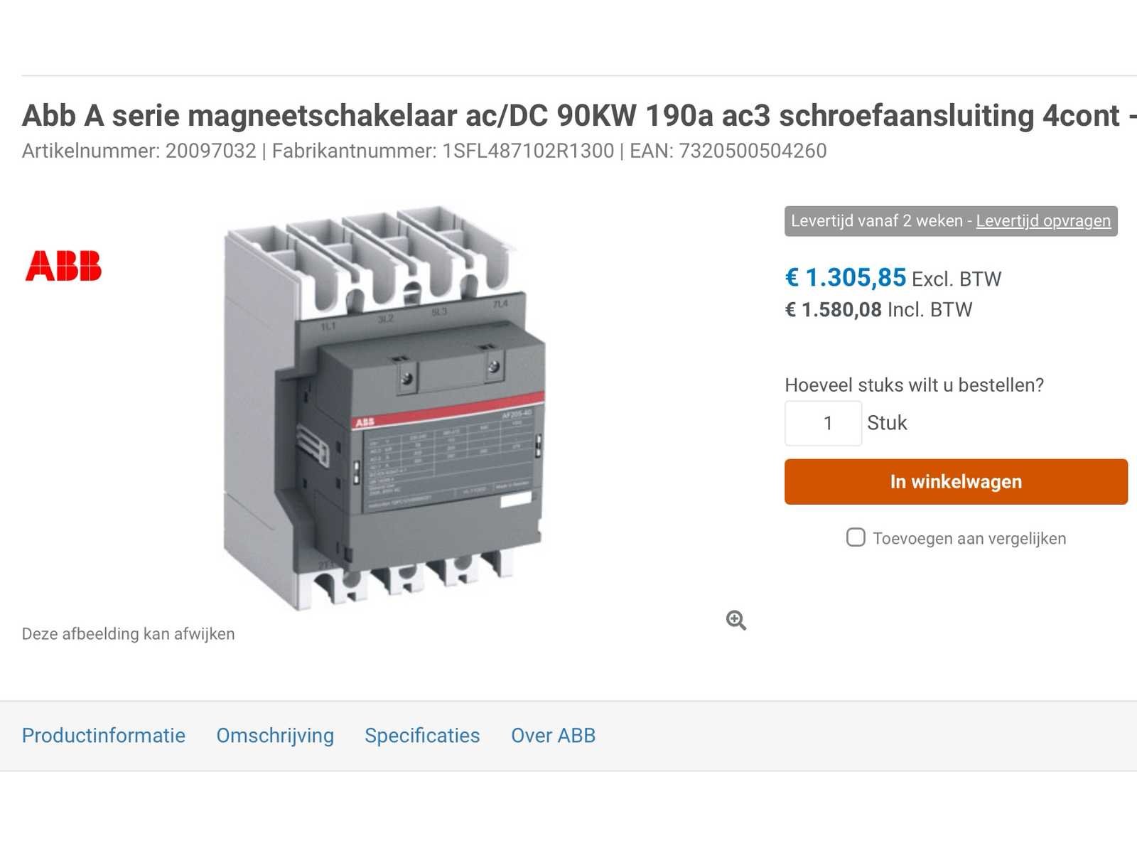 Ac/DC 190a ac3 schroefaansluiting 4cont - Merk: ABB Model: 1SFL487102R1300 A Serie