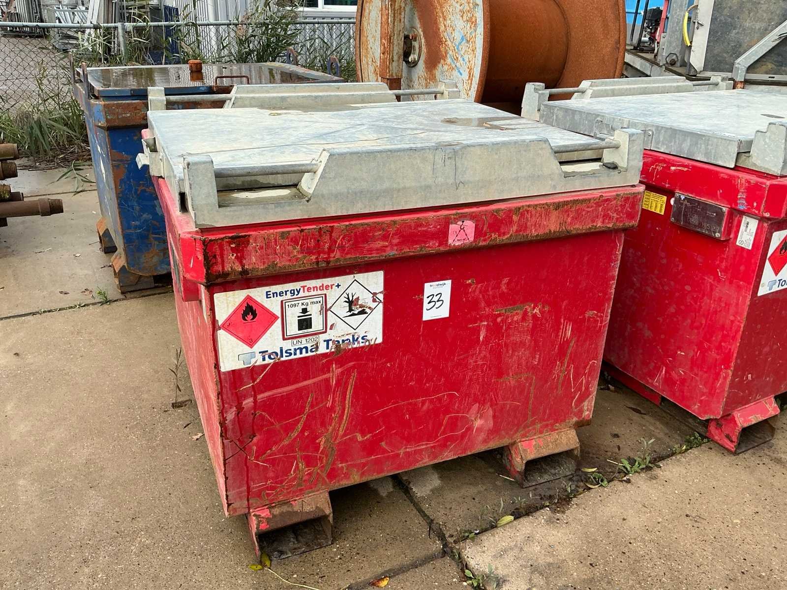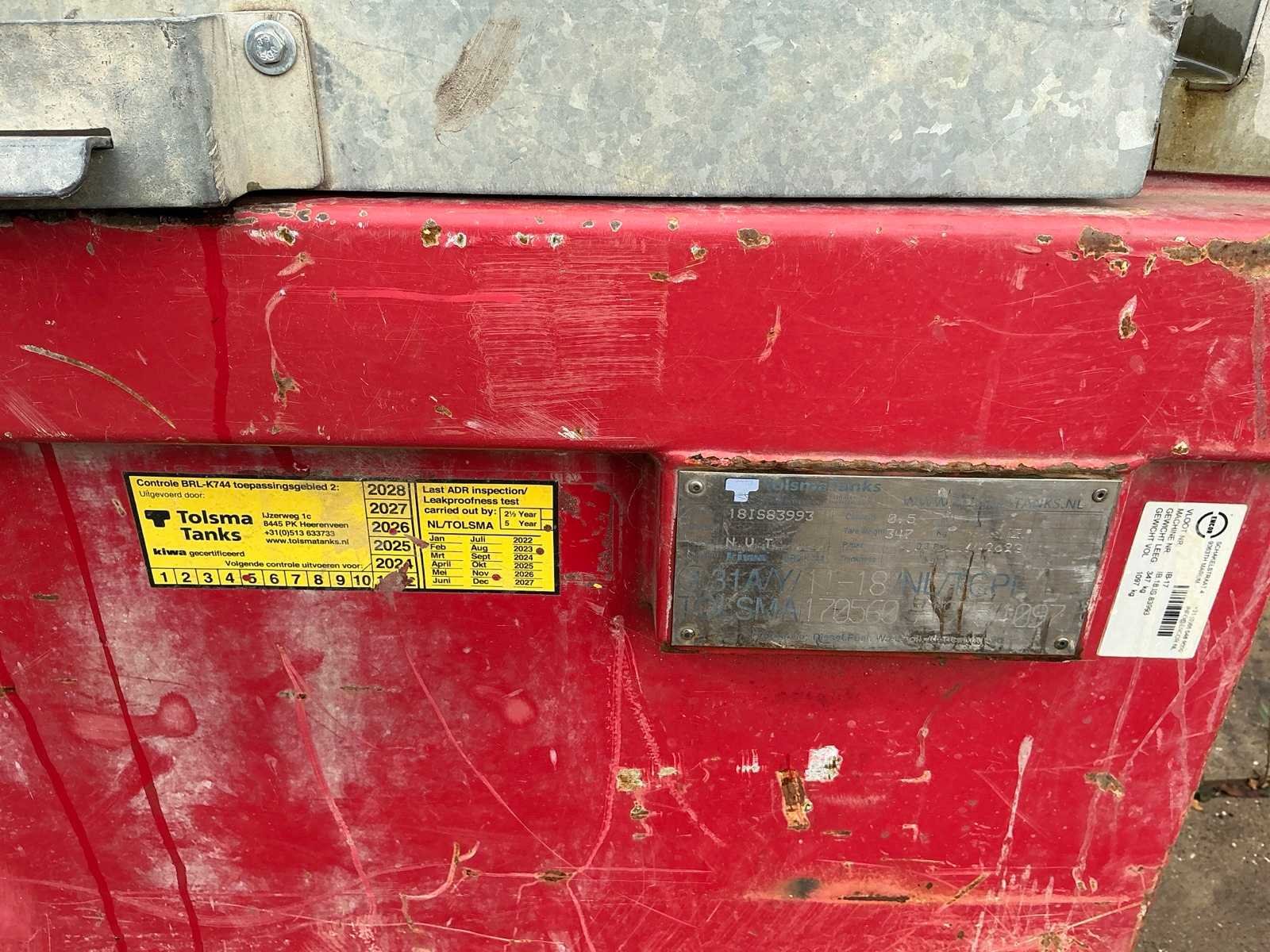 Voorzien van pomp en vulpistool met digitale teller, gekeurd tot 2026 Merk: Tolsma Eigen gewicht: 347kg Totale afmeting L: 1200mm Totale afmeting Breedte: 1200mm Totale afmeting Hoogte: 1100mm