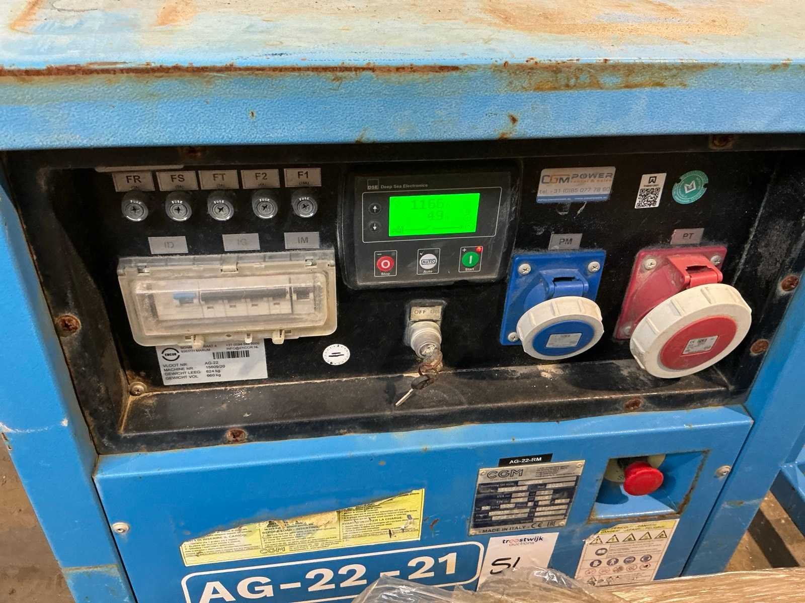 Voorzien van nieuwe accu’s Merk: CGM Type: v20KH Bouwjaar: 2020 Serienummer: 15609/20 Capaciteit.: 20kVA Diesel: true Type motor: Kohler Motorvermogen (kW): 16kW Afgelezen urenstand: 1166 Machinegewicht: 624kg Totale afmeting L: 1600mm Totale afmeting Breedte: 700mm Totale afmeting Hoogte: 1040mm
