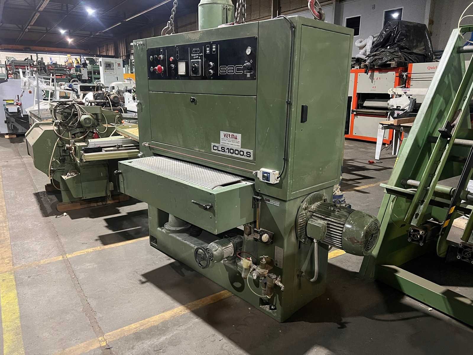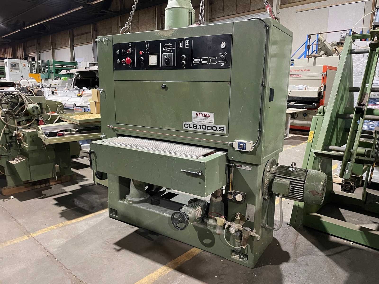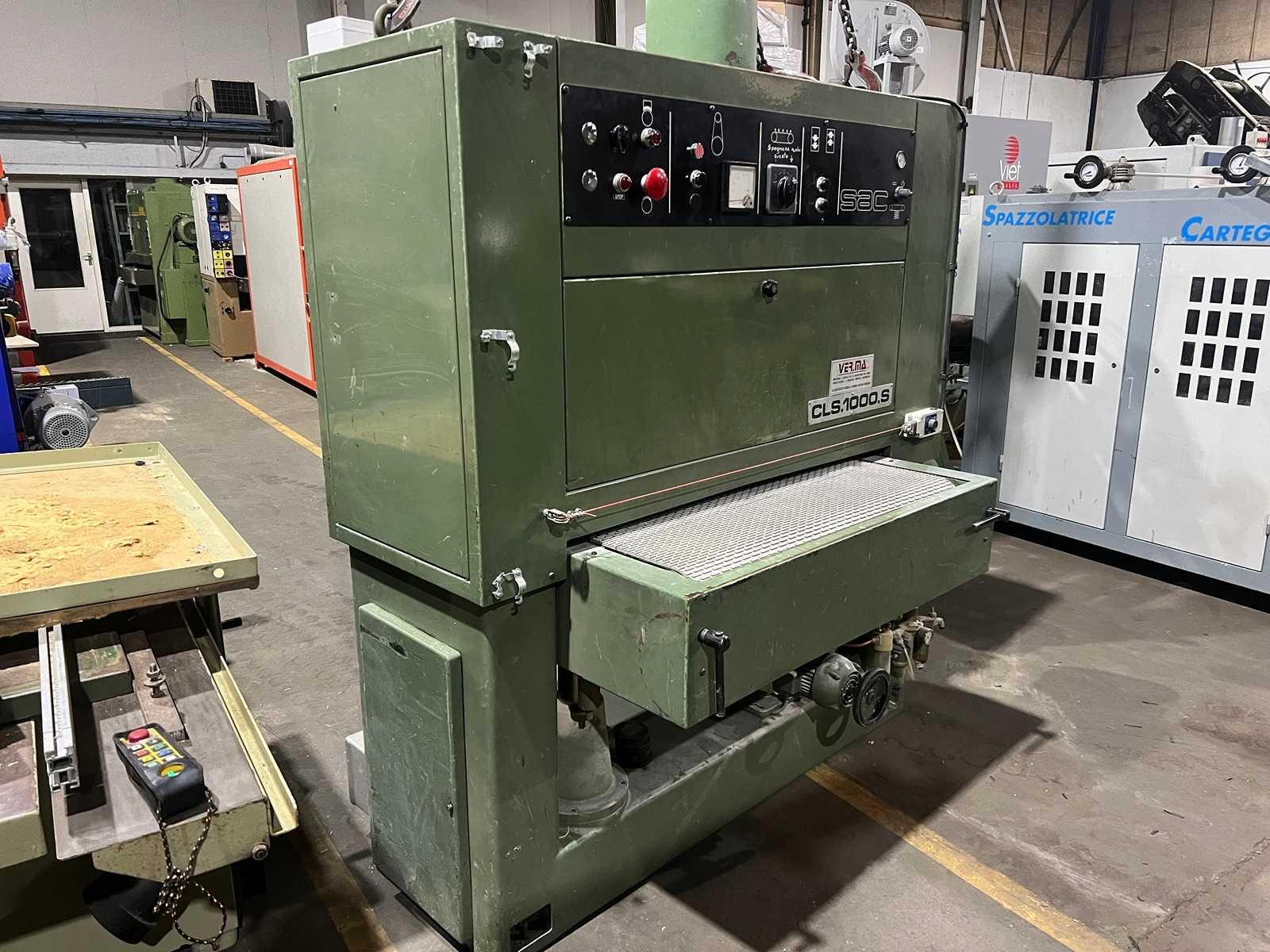 1 schuurunit 11kW motor Snelheid 22 m/sec Maximale schuurbreedte 1000mm Maximale schuurhoogte min/max 3/170mm Merk: SAC Type: CLS 1000 S Schuurband afm. l: 1030mm Schuurband afm. b: 1900mm Aansluiting: 380V Machinegewicht: 2000kg Afmeting l: 1200mm Afmeting b: 1800mm Afmeting h: 2200mm