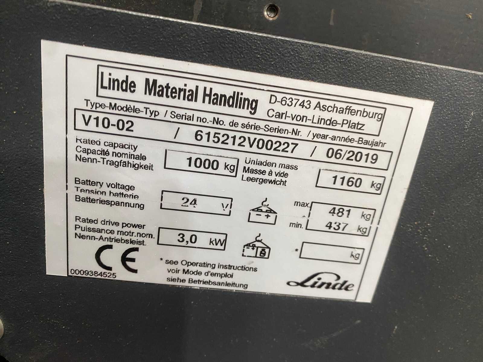 Merk: Linde Type: V10-02 Bouwjaar: 2019 Serienummer: 615212V00227 Hefvermogen: 1000kg Hefhoogte: 1070mm Lepellengte: 1150mm Accu lader: true Afgelezen urenstand: 5111 Eigen gewicht: 1641kg Totale afmeting L: 1700mm Totale afmeting Breedte: 800mm Totale afmeting Hoogte: 1620mm