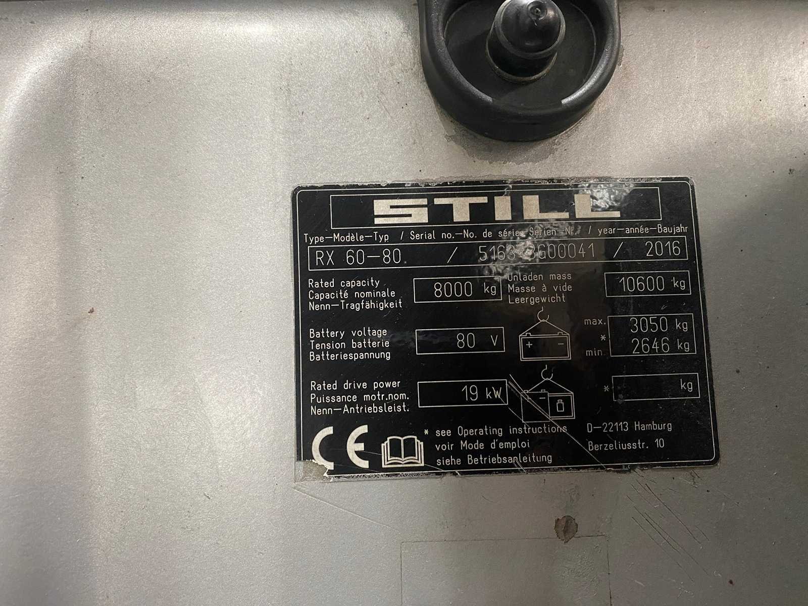 Accu test resultaat 86% Werklampen Non-marking banden Verwarming Volledige cabine Merk: Still Type: RX60-80 Bouwjaar: 2016 Serienummer: 516343G00041 Brandstof: Elektrisch Mast: Duplex Soort band: Vol rubber Aantal wielen: 6 Afgelezen urenstand: 11349 Accu lader: true Side-shift: true Duplex mast: true Eigen gewicht: 13282kg Hefvermogen: 8000kg Lepellengte: 1500mm Hefhoogte: 3230mm Vol rubber banden: true Totale afmeting L: 3600mm Totale afmeting Breedte: 2150mm Totale afmeting Hoogte: 2780mm