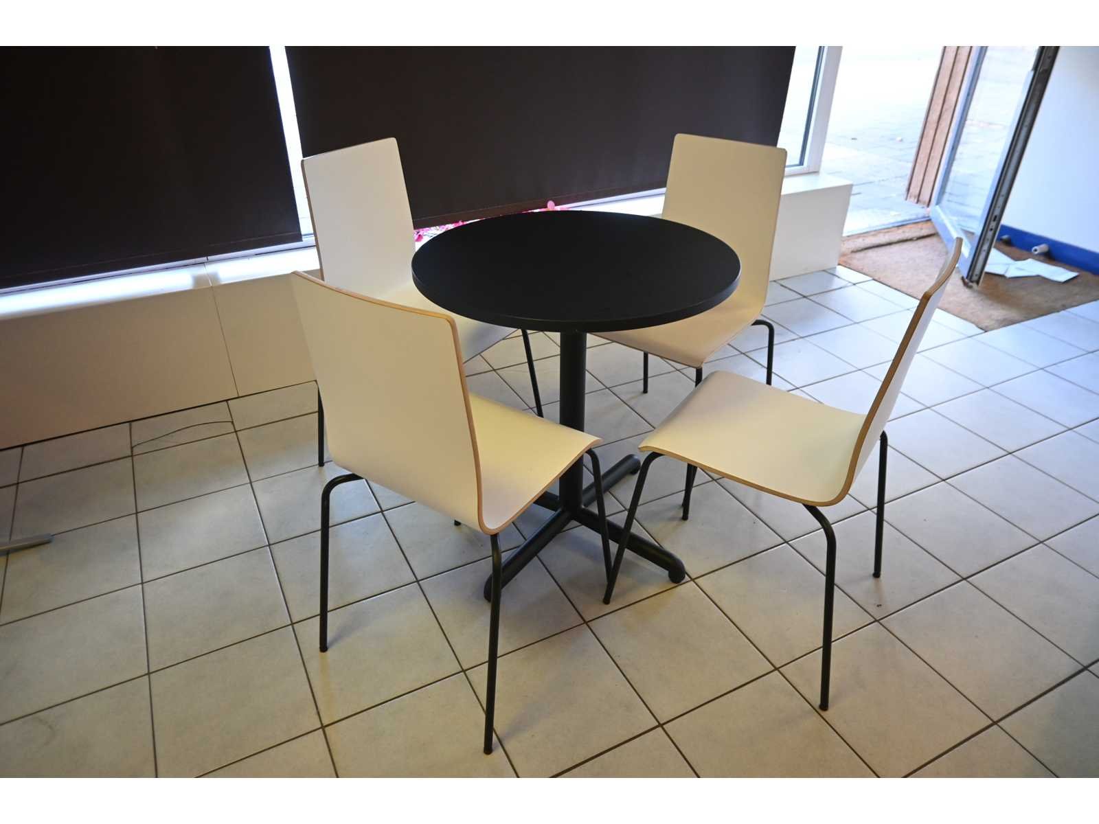 Bestaande uit 1 tafel (afmeting ca. B70 x H75 cm) en 7 stoelen.
