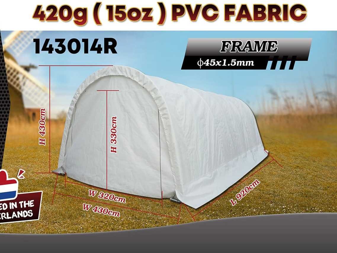 Voorzien van opslagtent / opslag shelter; singel trussen-/buizensysteem; gegalvaniseerd; beide uiteinden een deur; materiaal 420 gram PVC cover; kleur wit; inclusief montage handleiding; ongebruikt in metalen kist (transport afmetingen 282x74x44 cm) (let op af te halen vanaf circa 12 juni) Merk: Rhino-Cross-Shelter Type: 143014R - 9,2x4,3x4,3 m Bouwjaar: 2025 Eigen gewicht: 450kg Totale afmeting L: 9200mm Totale afmeting Breedte: 4300mm Totale afmeting Hoogte: 4300mm