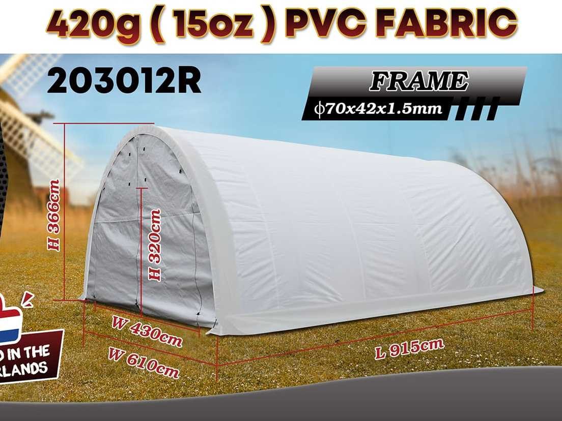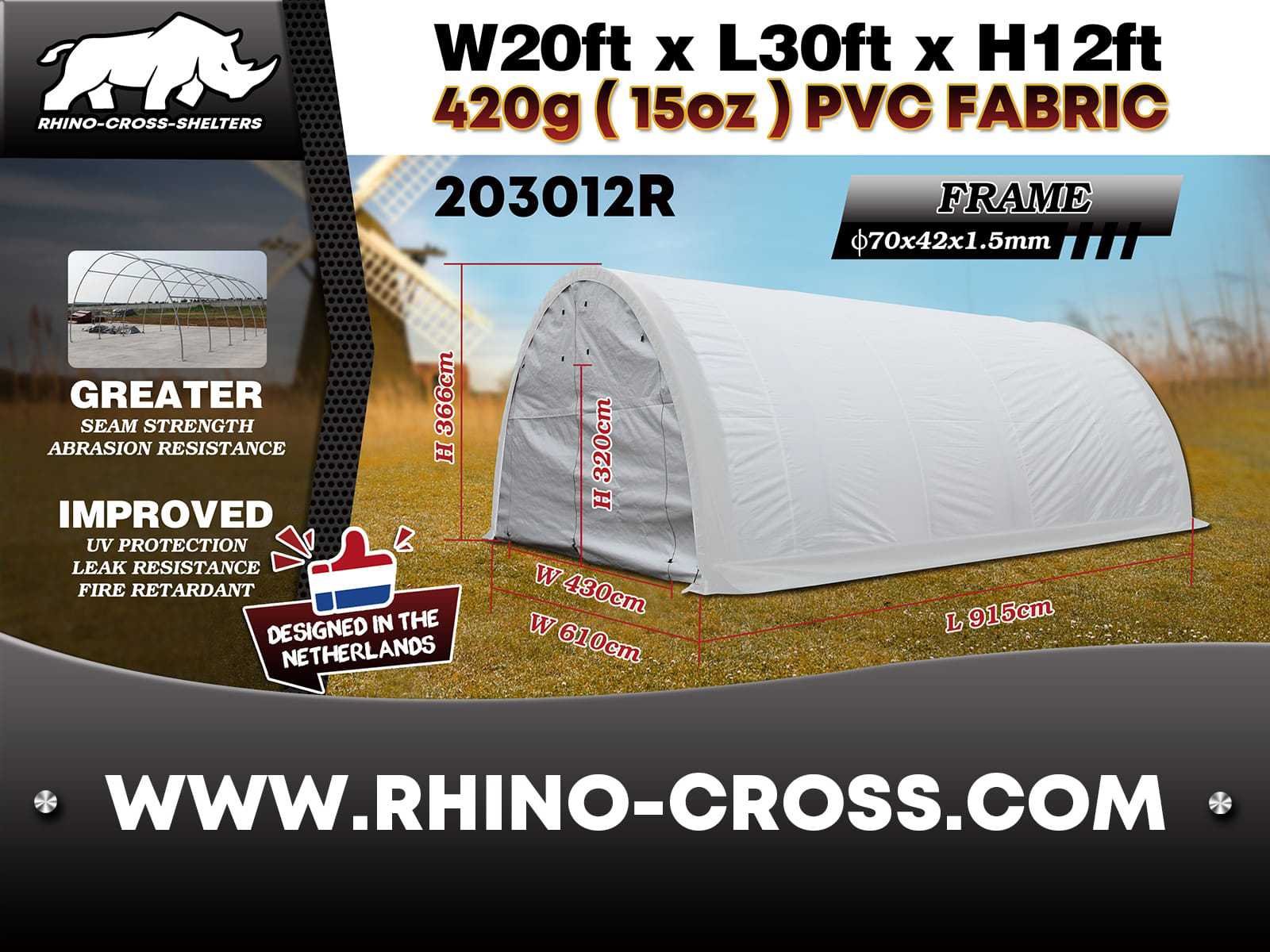 Voorzien van opslagtent / opslag shelter; singel trussen-/buizensysteem; gegalvaniseerd; beide uiteinden een deur; materiaal 420 gram PVC cover; kleur wit; inclusief montage handleiding; ongebruikt in metalen kist (transport afmetingen 216x73x50 cm) Merk: Rhino-Cross-Shelter Type: 203012R - 9,15x6,1x3,66 m Bouwjaar: 2025 Eigen gewicht: 438kg Totale afmeting L: 9150mm Totale afmeting Breedte: 6100mm Totale afmeting Hoogte: 3660mm