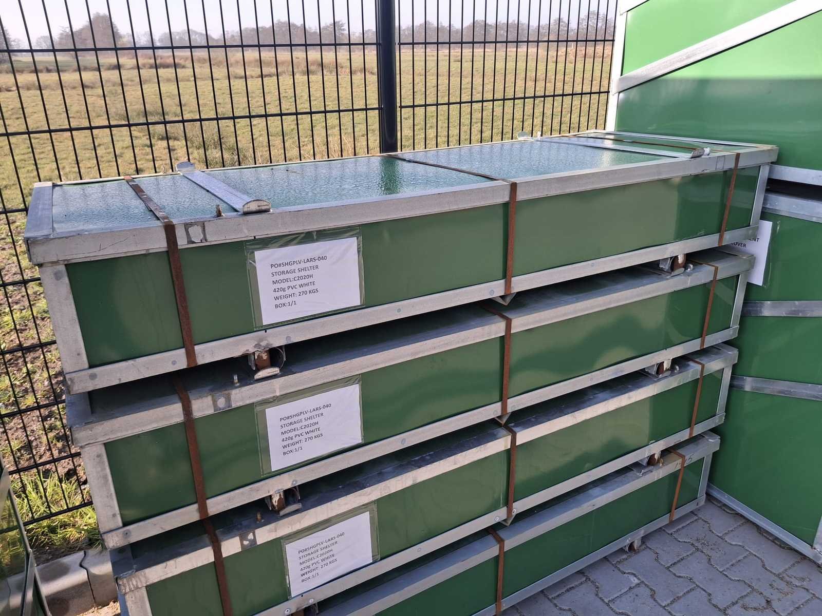 Voorzien van shelter overkapping / tent tussen 2 containers; singel trussen-/buizensysteem; gegalvaniseerd; met eind zeil zonder frame; ruimte tussen bogen 150 cm; materiaal 420 gram PVC cover; kleur wit; inclusief montage handleiding; ongebruikt in metalen kist Merk: Stahlworks Type: 20ft 6x6 meter met eind zeil Bouwjaar: 2024 Totale afmeting L: 6000mm Totale afmeting Breedte: 6000mm