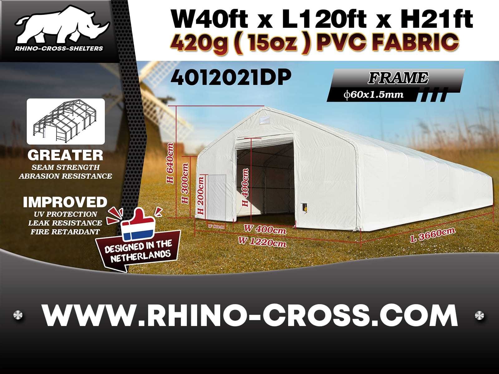 Voorzien van opslagtent / opslag shelter; dubbel trussen-/buizensysteem; gegalvaniseerd; beide uiteinden een deur; materiaal 420 gram PVC cover; kleur wit; inclusief montage handleiding; ongebruikt in metalen kist (transport afmetingen cm) Merk: Rhino-Cross-Shelter Type: 4012021DP - 36,6x12,2x6,4 m Bouwjaar: 2025 Totale afmeting L: 36600mm Totale afmeting Breedte: 12200mm Totale afmeting Hoogte: 6400mm