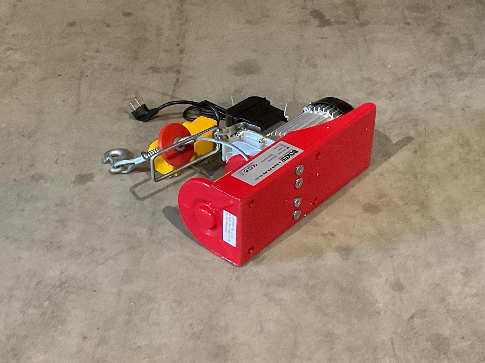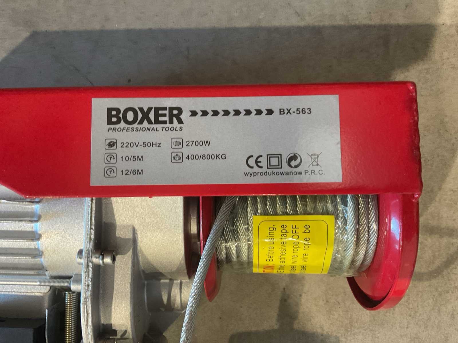 Voorzien van katrol; Motorvermogen: 2700 W; Maximale Laadcapaciteit (enkel / dubbel-kabel): ca. 400kg / 800kg; Maximale Hefhoogte (400kg / 800kg): 12m / 6m; Gem. hijssnelheid: 10 m/min;Aansluiting: 230V; 1 x elektrische lier; 1 x katrol met haak; 1 x montagebeugels; 1 x Bekabelde afstandbediening 1,45; Ongebruikt in doos (Afmeting transport verpakking 430x190x260 mm lxbxh, gewicht 18.30 kg) Merk: Boxer Type: BX-563 800kg Bouwjaar: 2025 Capaciteit.: 800kg Hijshoogte: 12m Afstandsbediening: true Aansluiting: 220V Totale afmeting L: 430mm Totale afmeting Breedte: 190mm Totale afmeting Hoogte: 260mm Eigen gewicht: 18.3kg