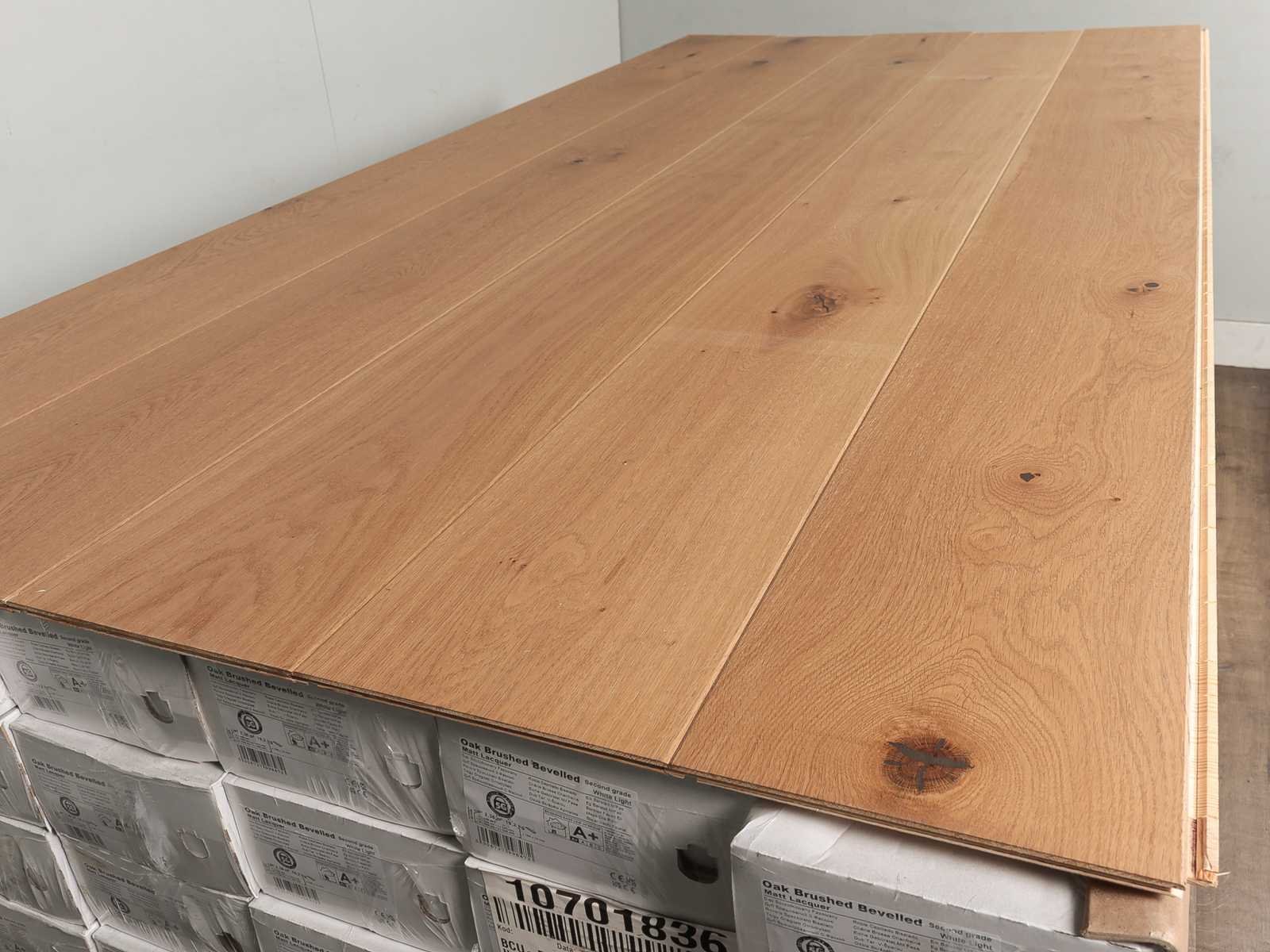 Gemakkelijk te leggen wegens 5G clicksysteem, geschikt voor alle soorten vloer en koelverwarmingen, kwaliteits parketvloer, vloer is van hoogwaardig Europees eiken hout, kant en klaar behandeld, dikte 14 mm, toplaag 3 mm, 39 pakken a 3,18 m2 Merk: Ambiance Product type: Parket Oppervlakte: 124m² Geschikt voor vloerverwarming: Ja V-groef: Ja Afwerking: Geolied, geoxideerd, geborsteld, met v-groef Aantal m² per verpakking: 3.18m² Kleur: Light smoked effect 354 Gewicht: 1015kg Lengte: 2200mm Breedte: 207mm Materiaal: Eiken multiplank