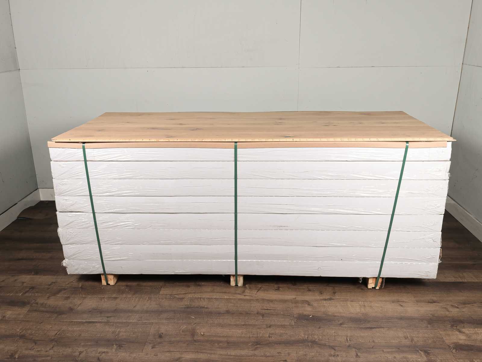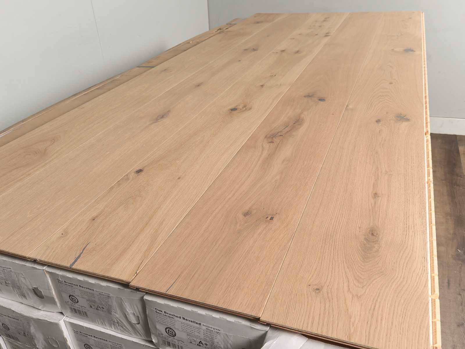 Gemakkelijk te leggen wegens 5G clicksysteem, geschikt voor alle soorten vloer en koelverwarmingen, kwaliteits parketvloer, vloer is van hoogwaardig Europees eiken hout, kant en klaar behandeld, dikte 14 mm, toplaag 3 mm, 39 pakken a 2,77 m2 Merk: Ambiance Product type: Parket Oppervlakte: 108m² Geschikt voor vloerverwarming: Ja V-groef: Ja Afwerking: Wit geolied, geoxideerd, geborsteld, met v-groef Aantal m² per verpakking: 2.77m² Kleur: White oiled oak 804 Gewicht: 895kg Lengte: 2200mm Breedte: 180mm Materiaal: Eiken multiplank