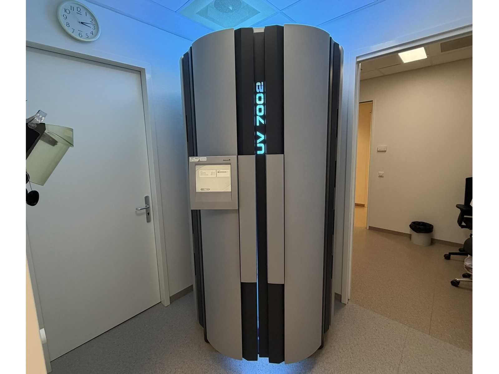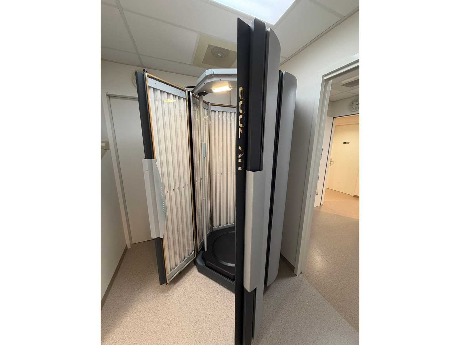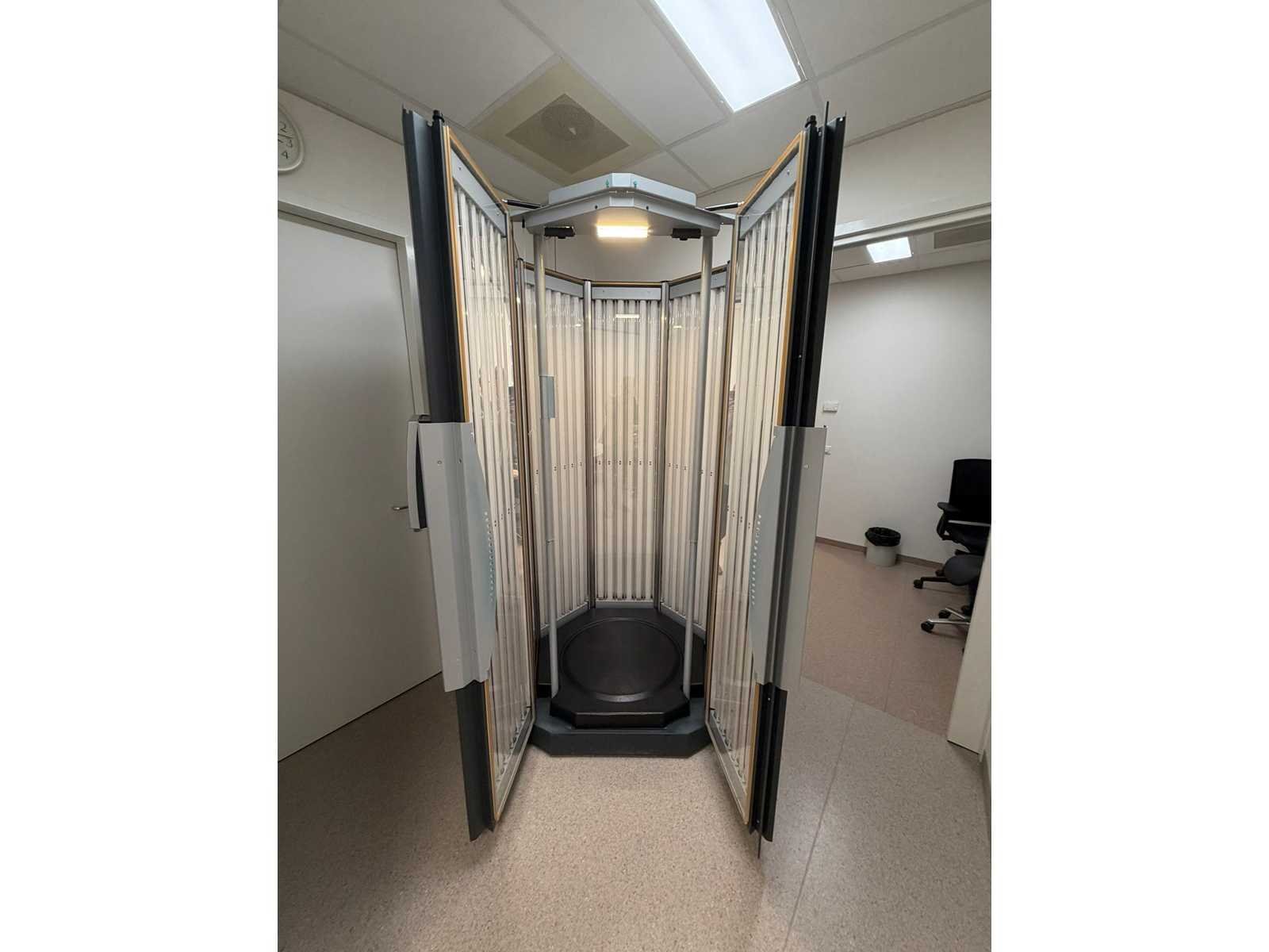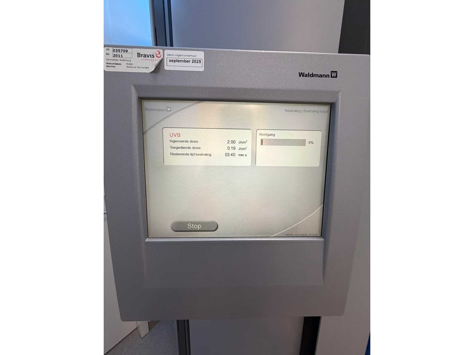 Waldmann UV 7002 – Professionele fototherapiecabine (PUVA / UVB) De Waldmann UV 7002 is een medische full-body fototherapie-unit voor de behandeling van huidaandoeningen zoals psoriasis, vitiligo en eczeem. Deze hoogwaardige cabine beschikt over 21 UV-lampen van 120 W, automatische dosisregeling en een geavanceerd reflectiesysteem voor gelijkmatige bestraling. Uitgerust met touchscreen-bediening, ingebouwde ventilatie en diverse veiligheidsvoorzieningen (automatische uitschakeling bij openen deuren, UV-intensiteitssensoren). Geschikt voor professioneel gebruik, hergebruik of onderdelen. Wordt verkocht in huidige staat, zonder garantie of certificering. Onderhoudsrapport van September 2024 aanwezig. Bouwjaar 2011 Koper verantwoordelijk is voor naleving van wetten/reguleringen rond medische hulpmiddelen (bijv. lokale medische apparaatwetgeving, inspecties, certificering) Demontage en afvoer dient door koper zelfstandig te worden uitgevoerd Merk: Waldmann Model: UV7200 Product type: UV-lampen (UVB) 21 x TL 01 120 W Kleur: Wit-aluminium (vergelijkbaar met RAL 9006) + antracietgrijs (RAL 7016) accenten Gewicht: 405kg Lengte: 126,6cm Breedte: 132,7cm Hoogte: 231,7cm Materiaal: Wit / antracietgrijs aluminium