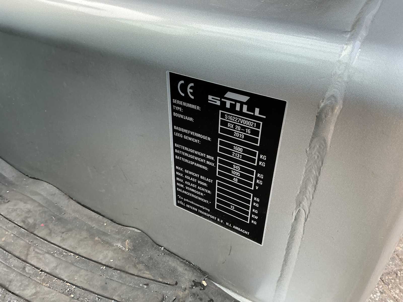Merk: STILL Type: RX20-16 Bouwjaar: 2019 Serienummer: 516227V00021 Mast: Duplex Aantal wielen: 4 Afgelezen urenstand: 3648 Free-lift: true Hefvermogen: 1600kg Lepellengte: 1000mm Hefhoogte: 3360mm Minimale doorrijhoogte: 2160mm