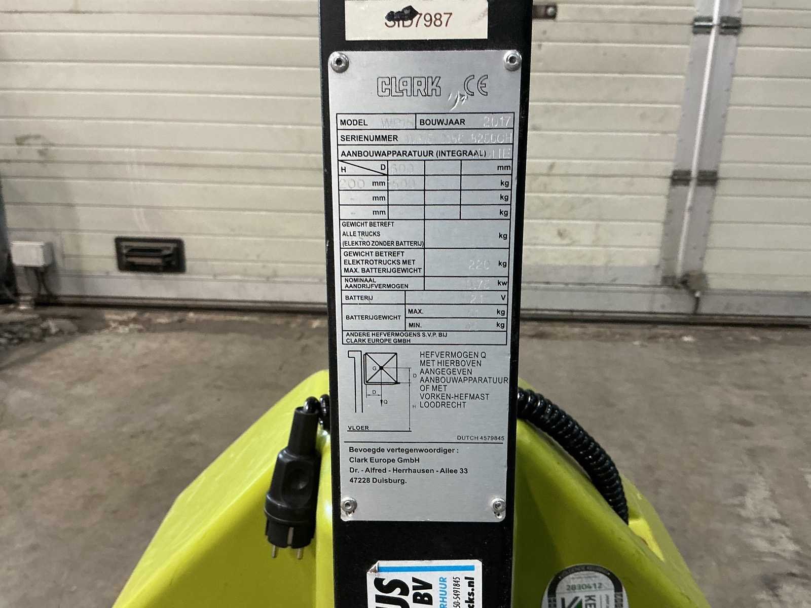 Merk: CLARK Type: WP15 Bouwjaar: 2017 Serienummer: WP15-0186-8256Ch Hefvermogen: 1500kg Lepellengte: 1150mm Accu lader: true Afgelezen urenstand: 2115