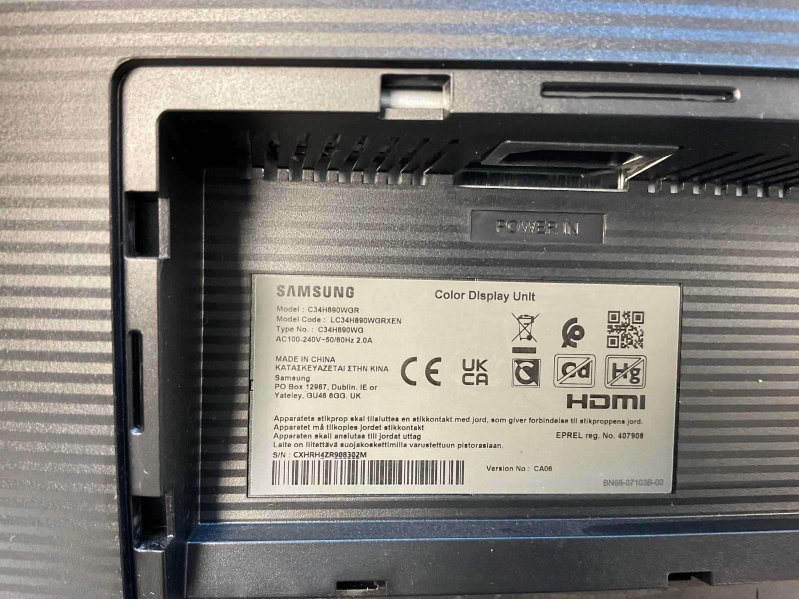 (C34H890WGR) 34”, 3440x1440 (UWQHD) LCD Curved Monitor; - Excl. Power Cable. Merk: Samsung Displaypoort: 1 HDMI: 2 USB: 2 Resolutie: 3440x1440 Beelddiagonaal: 34''