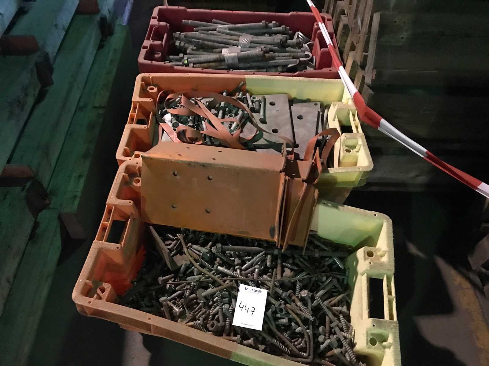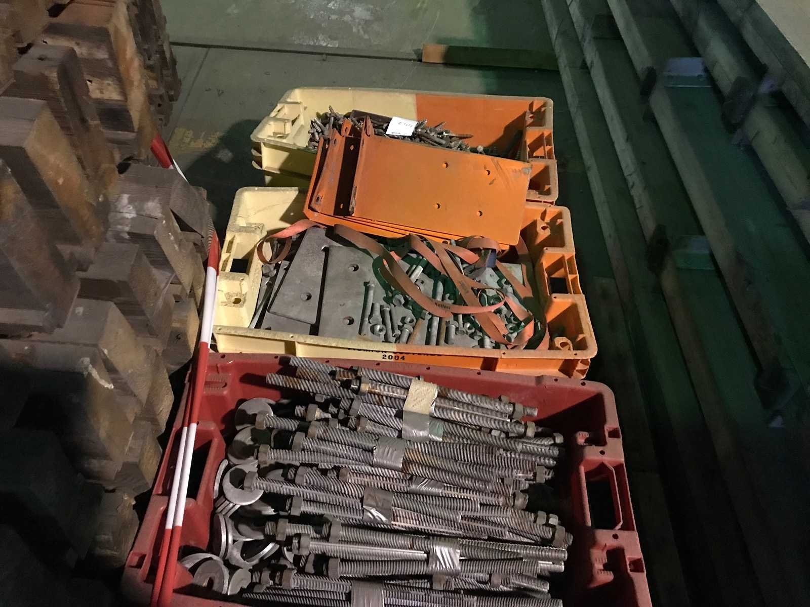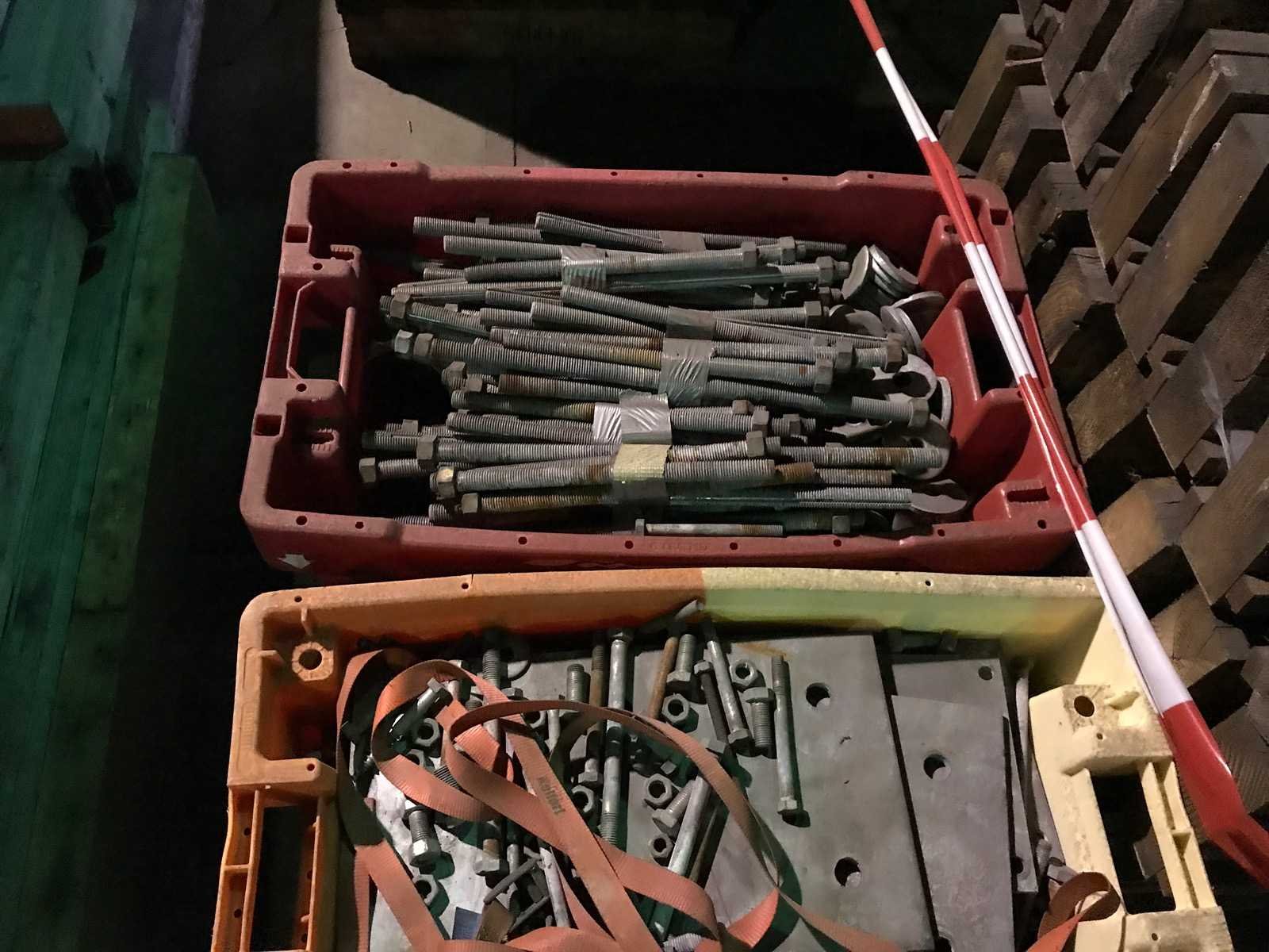 4 kratten met ijserwaren; kettingen; draadeind; ringen; platen en bouten