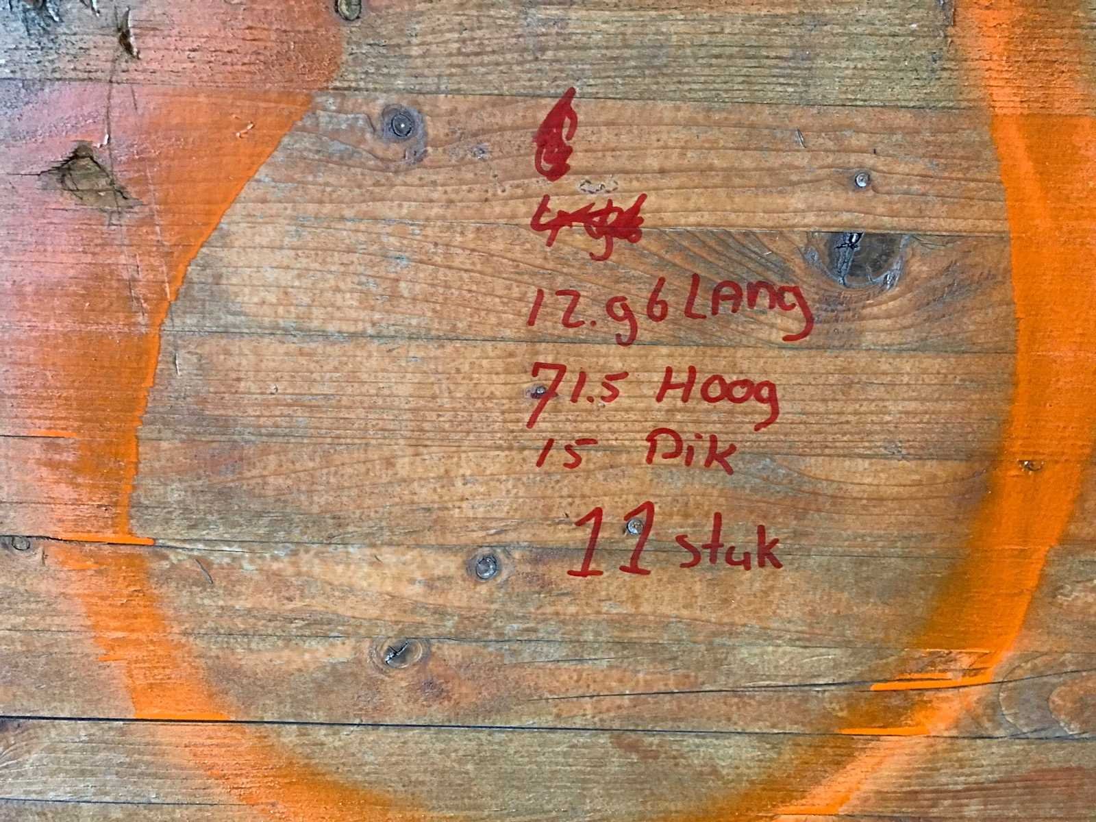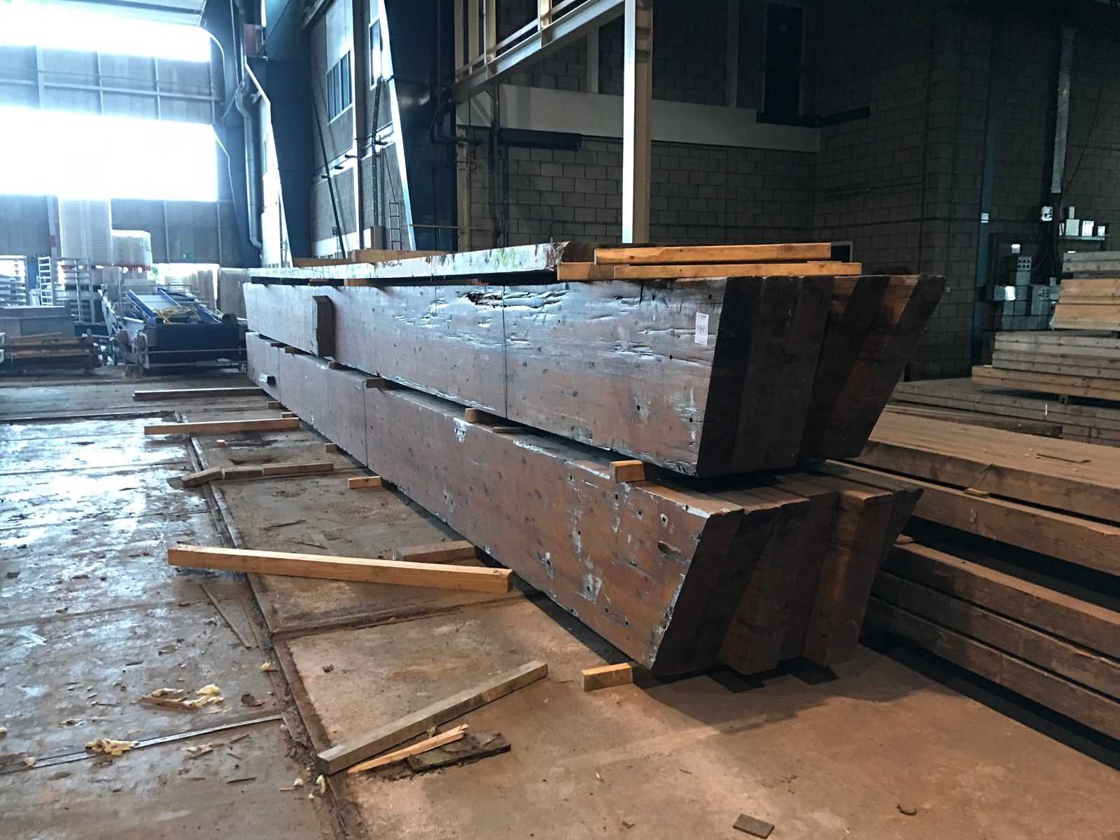 Diverse houten spanten; 150mm dik; 2 schuine kanten; kortste lengte 12 meter Lengte: 1200cm Breedte: 15cm Hoogte: 71cm