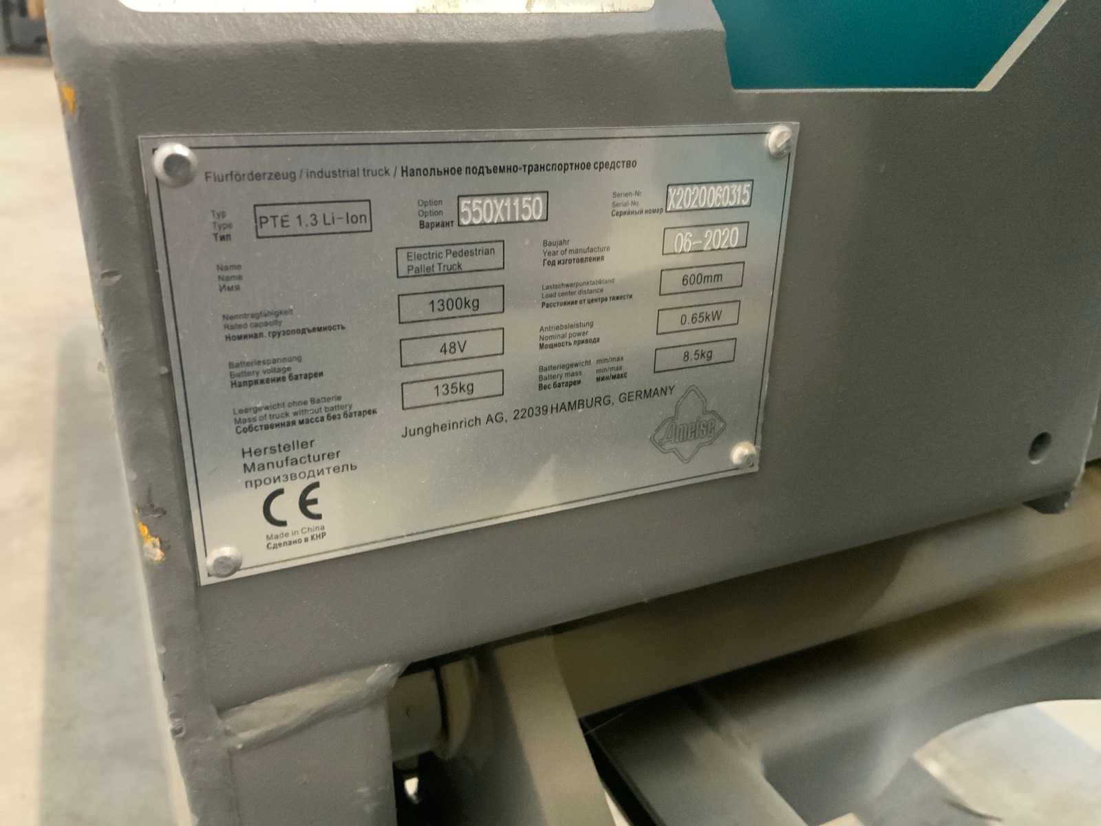 Inclusief lader; type accu Li-ion DZL482001-Q00; inclusief extra batterij; Merk: Ameise Type: PTE 1.3 Li-Ion Bouwjaar: 2020 Hefvermogen: 1300kg Lepellengte: 1150mm Accu lader: true