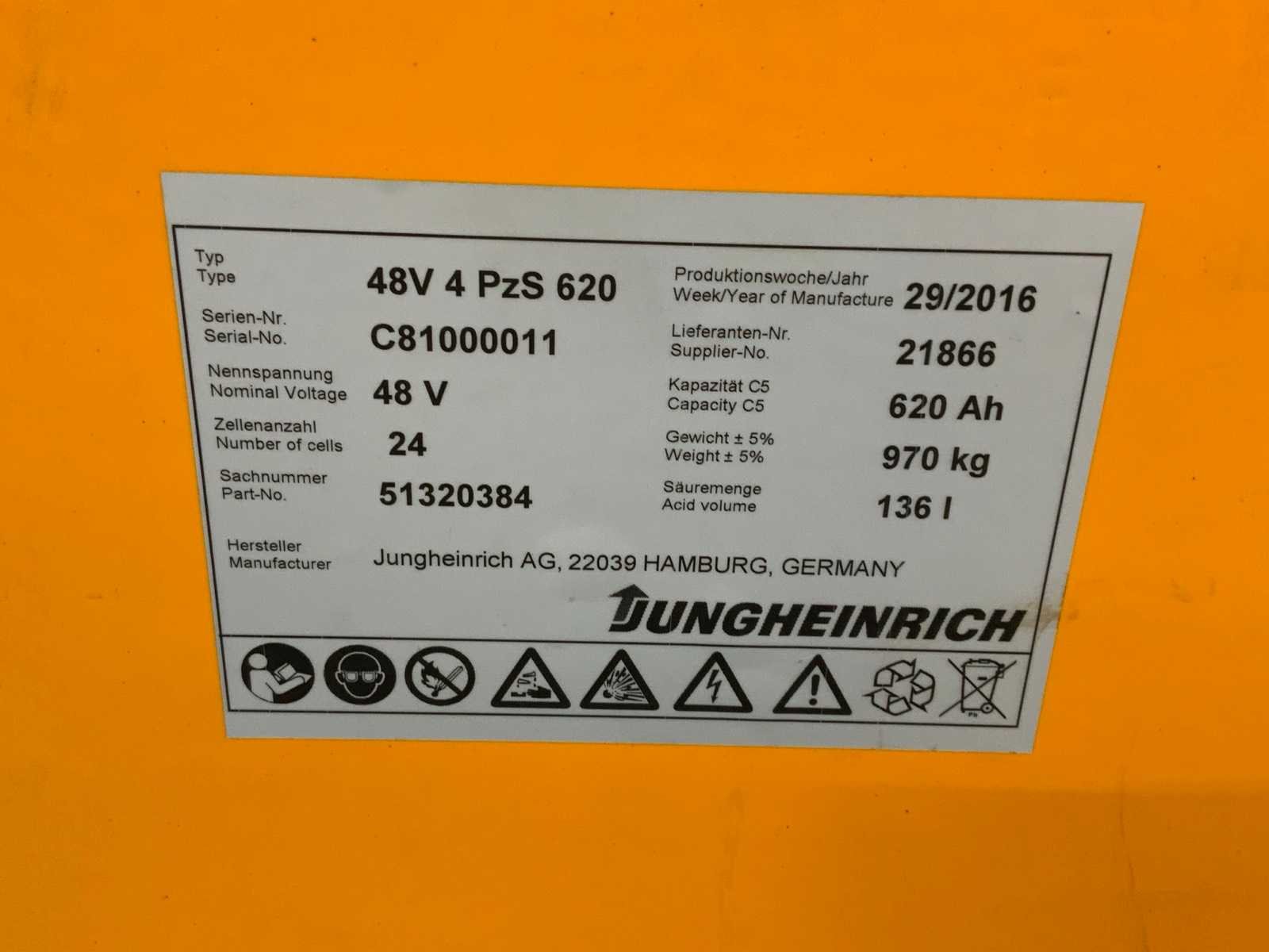 Voorzien van lepel camera; accu lader; Grammer stoel; batterij van bouwjaar 2016; Merk: Jungheinrich Type: ETV216 Serienummer: 91067323 Aantal wielen: 3 Accu lader: true Free-lift: true Side-shift: true Triple mast: true Hefvermogen: 1600kg Lepellengte: 1150mm Max. hefhoogte: 8300mm Hefhoogte: 8300mm Minimale doorrijhoogte: 3320mm Totale afmeting L: 2500mm Totale afmeting Breedte: 1300mm Totale afmeting Hoogte: 3320mm Elektrisch: true Vol rubber banden: true