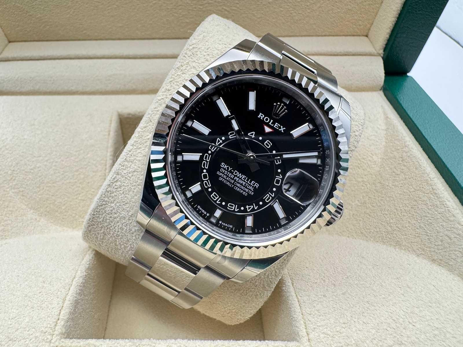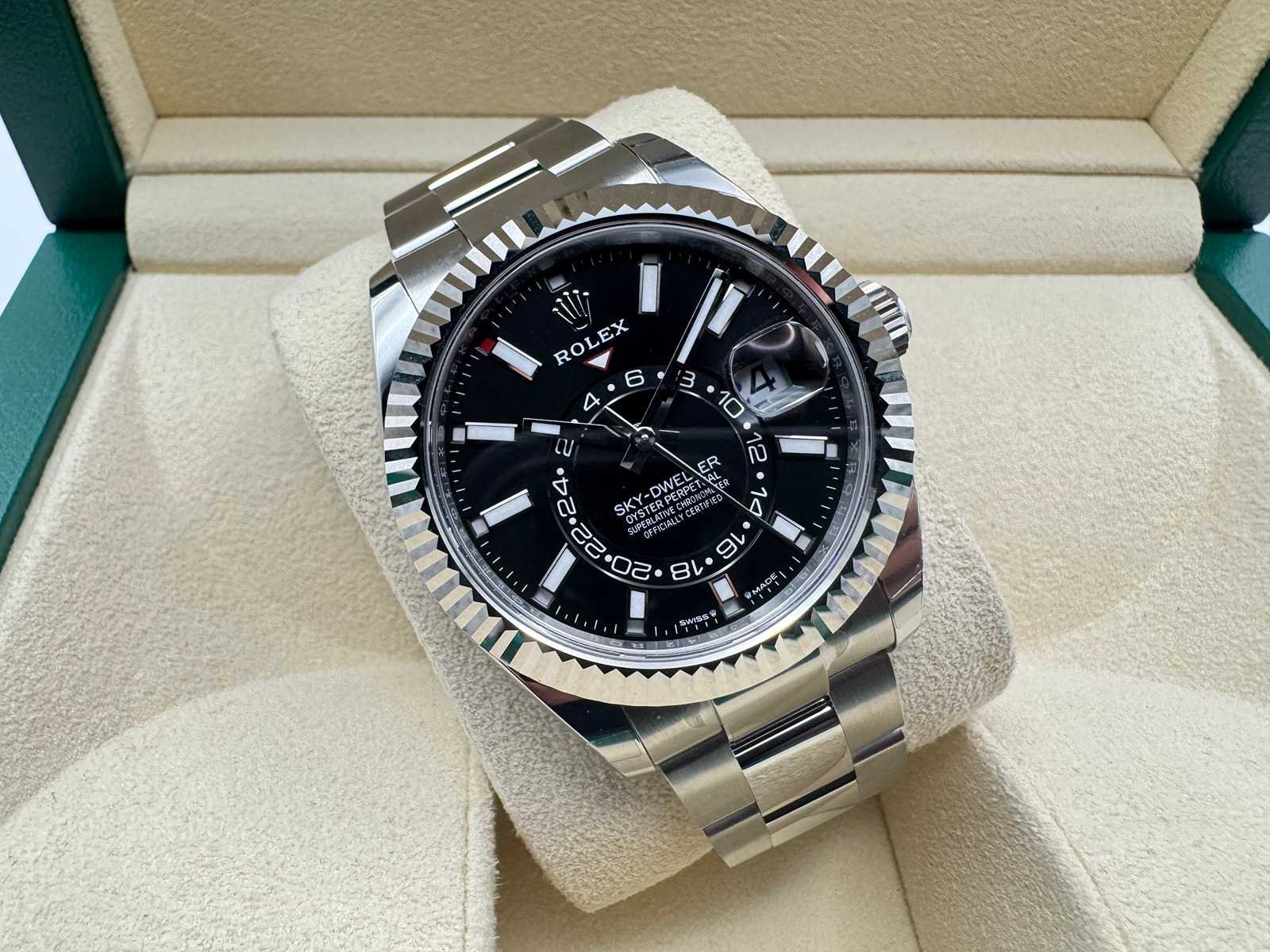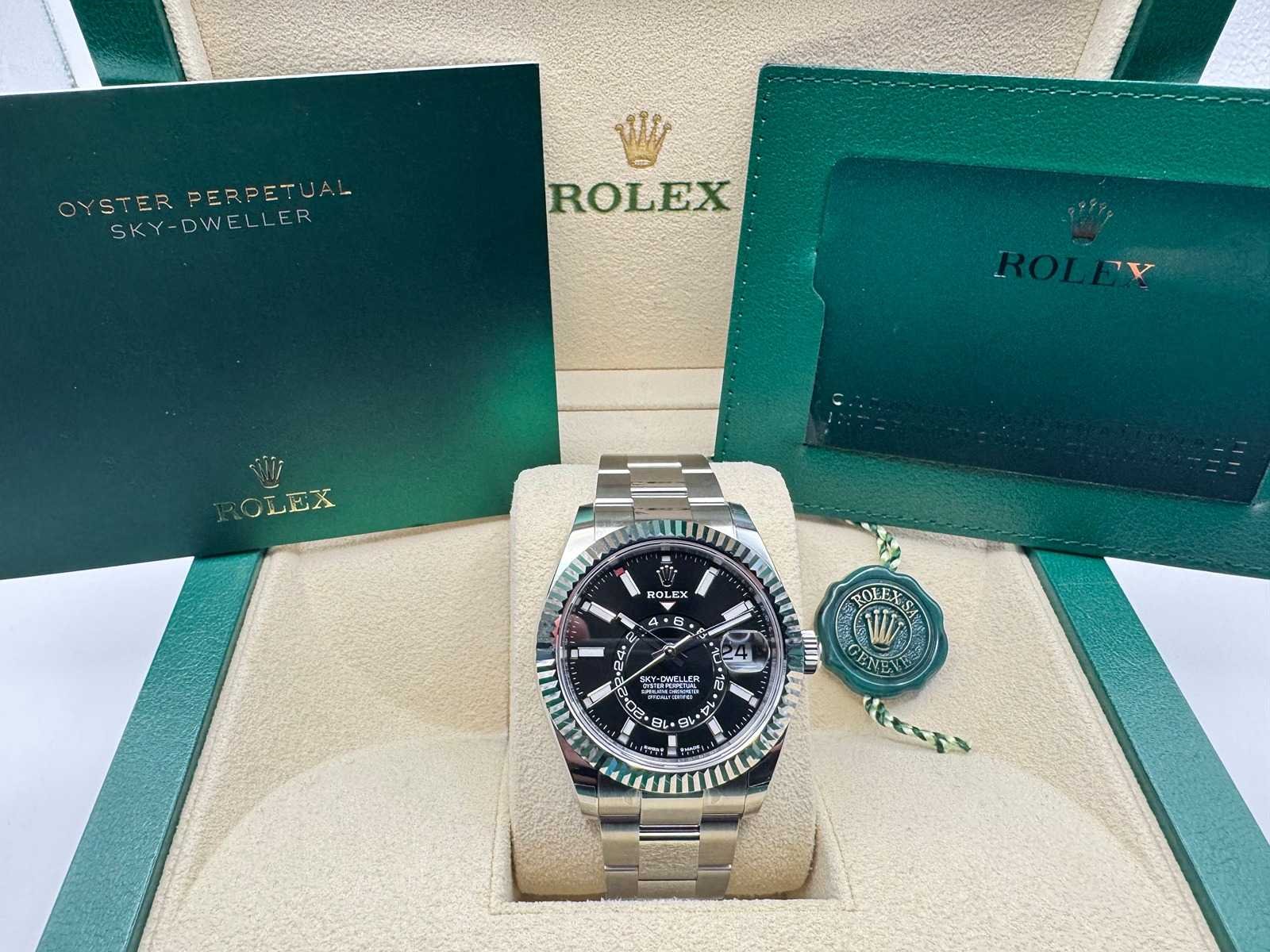 This brand-new, unworn Rolex Sky-Dweller Ref. 336934 is one of the most sought-after models in the Rolex collection. Crafted from stainless steel, it features the iconic fluted white gold bezel and the highly desirable black dial, known for its stunning depth and elegance. Designed for world travelers, the Sky-Dweller offers an annual calendar and dual time zone function, making it both a statement of luxury and a masterpiece of engineering. The watch comes as a full set, including the original Rolex box, booklets, warranty card holder, and Rolex guarantee card. It is covered by Rolex’s 5-year international warranty, ensuring complete peace of mind. Key Features: Model: Rolex Sky-Dweller Ref. 336934 Condition: Brand new, unworn Material: Stainless steel with white gold bezel Dial: Highly sought-after blue Bracelet: Oyster Functions: Dual time zone, annual calendar International warranty: 5 years remaining Full set: Includes box, papers, warranty card, and Rolex tag A true collector’s piece, the Rolex Sky-Dweller with a black dial is both rare and prestigious. Don't miss this opportunity to own a brand-new example of one of Rolex’s most coveted timepieces. Merk: Rolex Model: Sky-Dweller Bouwjaar: 2025 Referentienummer: 336934 Materiaal kast: Steel Materiaal horlogeband: Steel Oyster Materiaal sluiting: Steel Wijzerplaat: Black Kastmaat: 42MM