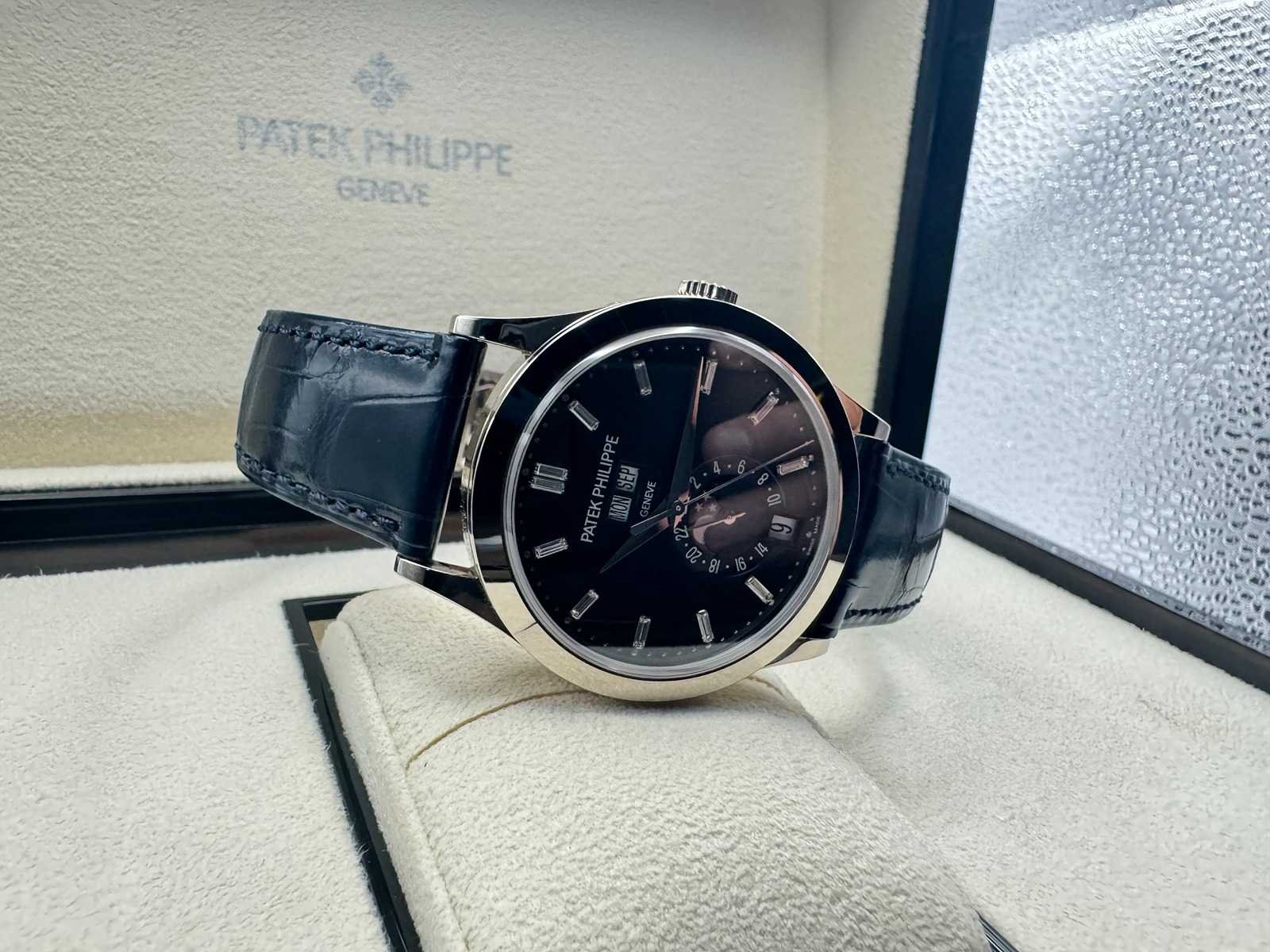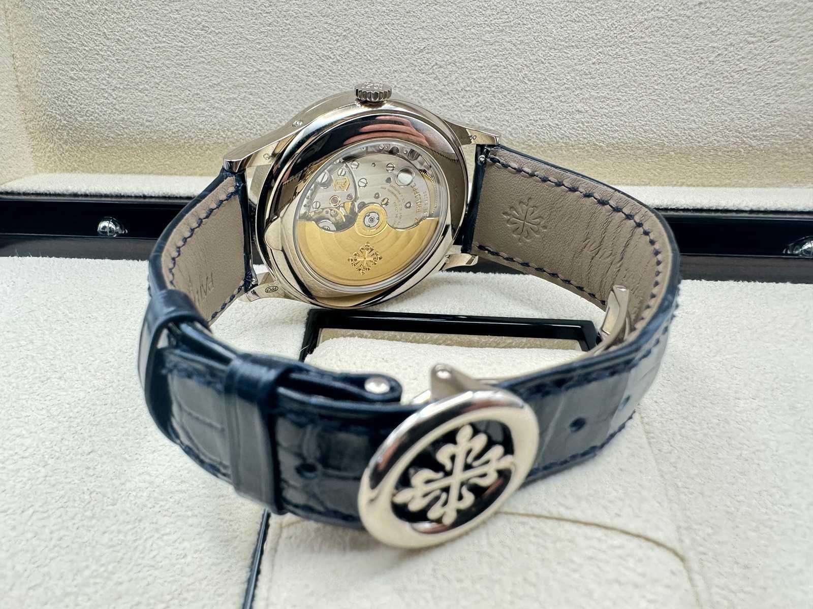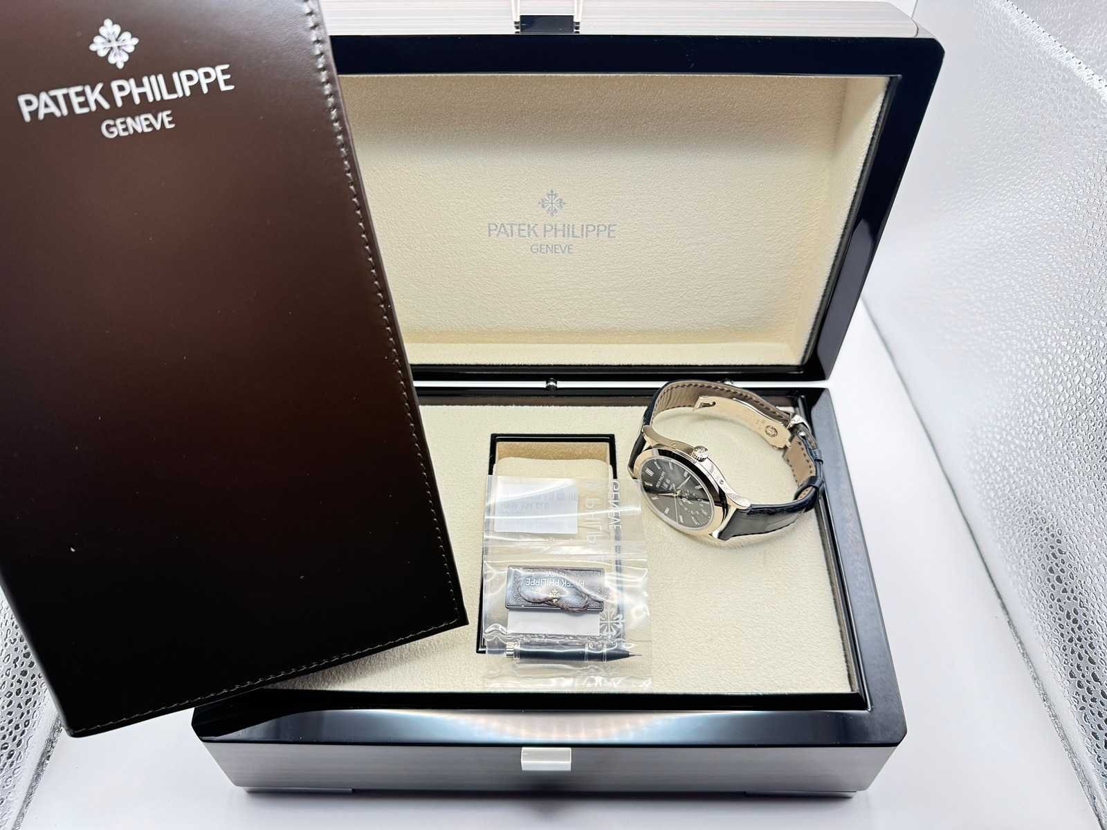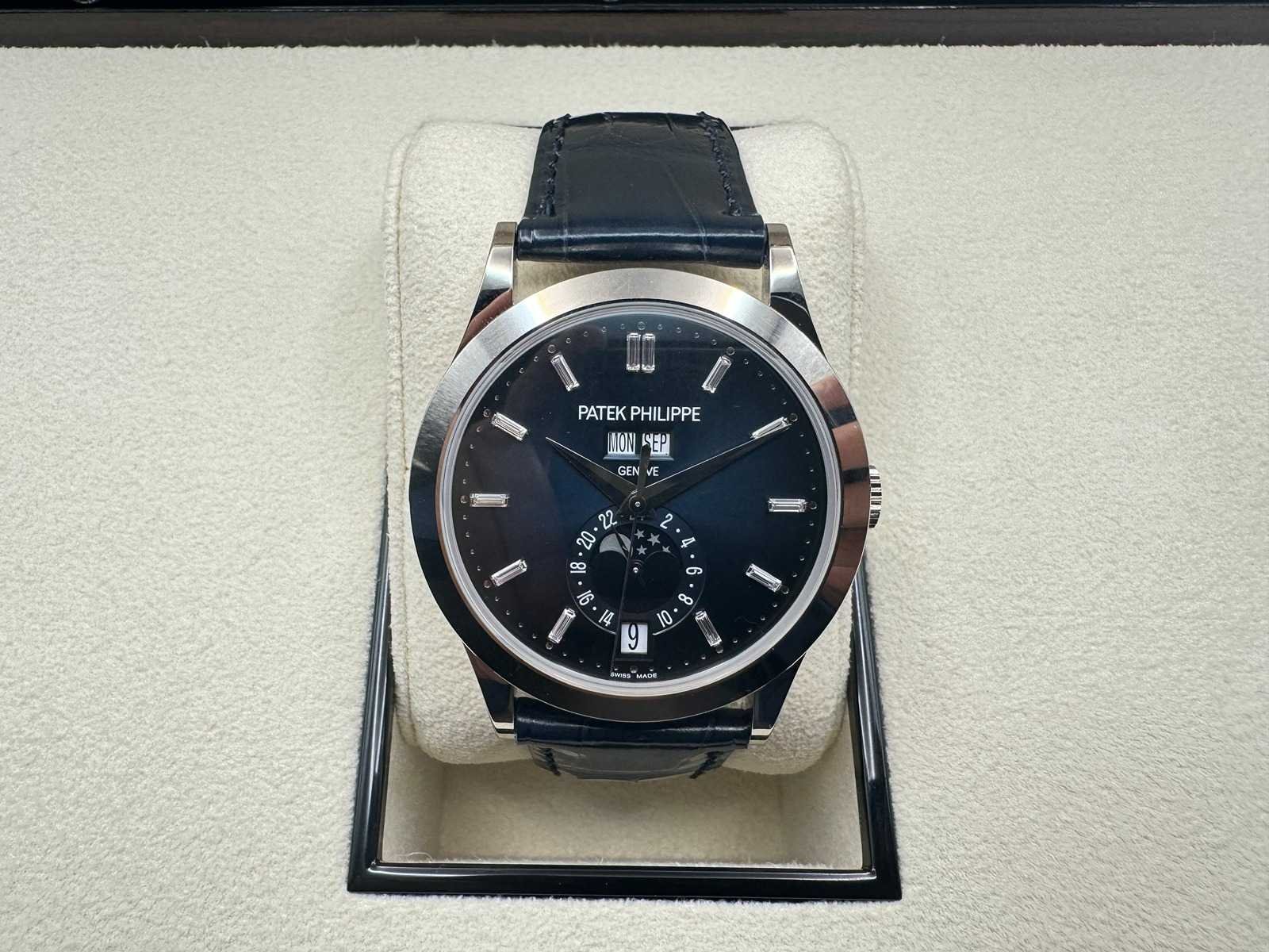 Like new Patek Philippe Annual Calendar 5396G-017, a stunning embodiment of horological excellence. Featuring a captivating blue sunburst dial with applied gold hour markers, elegantly housed in a 38.5mm white gold case, this timepiece is the pinnacle of timeless sophistication. The annual calendar complication and moonphase display highlight Patek Philippe’s legendary craftsmanship and innovation. Condition: Like new, slightly worn Set: Full set – includes original box, papers, Patek Philippe certificate, manuals, and all accessories Model: Annual Calendar (5396G-017), 38.5mm white gold case Features: Blue sunburst dial, annual calendar complication, moonphase display, day and month in twin apertures, and automatic movement Warranty: Full international Patek Philippe warranty The Patek Philippe 5396G-017 with its mesmerizing blue dial is a harmonious blend of tradition and modernity, designed for discerning collectors and enthusiasts. Complete with a full set and Patek Philippe warranty, this iconic timepiece is ready to adorn the wrist of its new owner. Don’t miss your opportunity to own this extraordinary creation from one of the world’s most prestigious watchmakers! Merk: Patek Philippe Model: Annual Calendar Bouwjaar: 2024 Referentienummer: 5369G-017 Materiaal kast: White Gold Materiaal sluiting: White Gold Wijzerplaat: Blue Kastmaat: 38MM