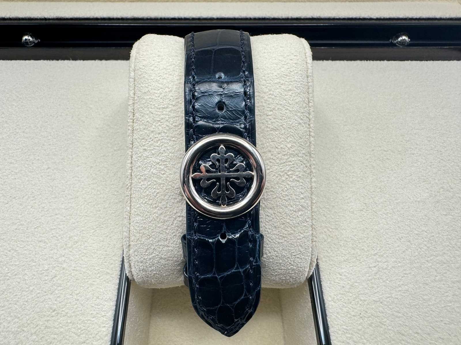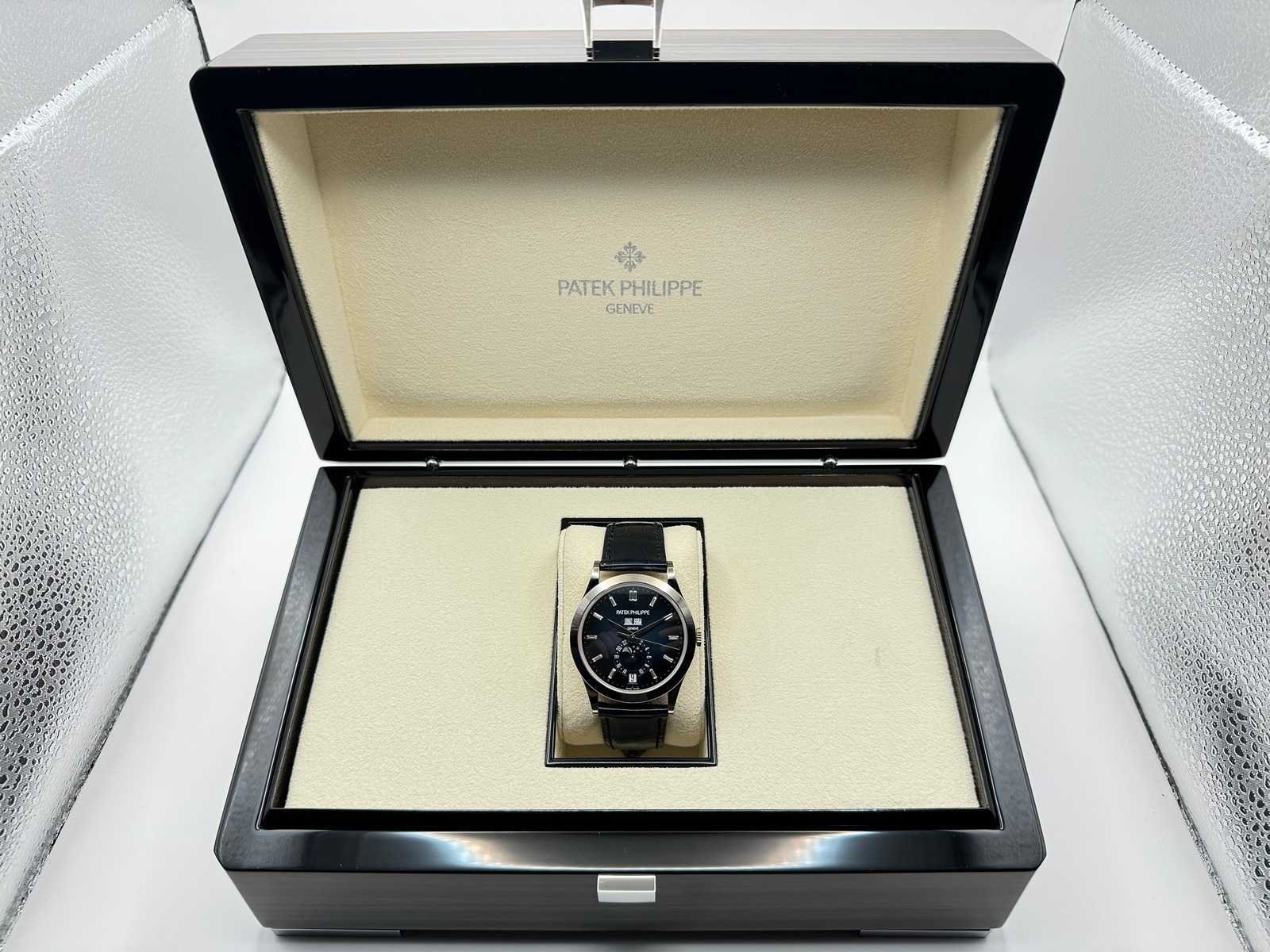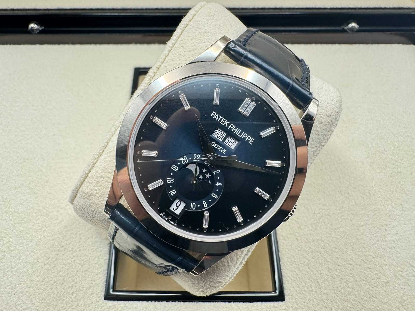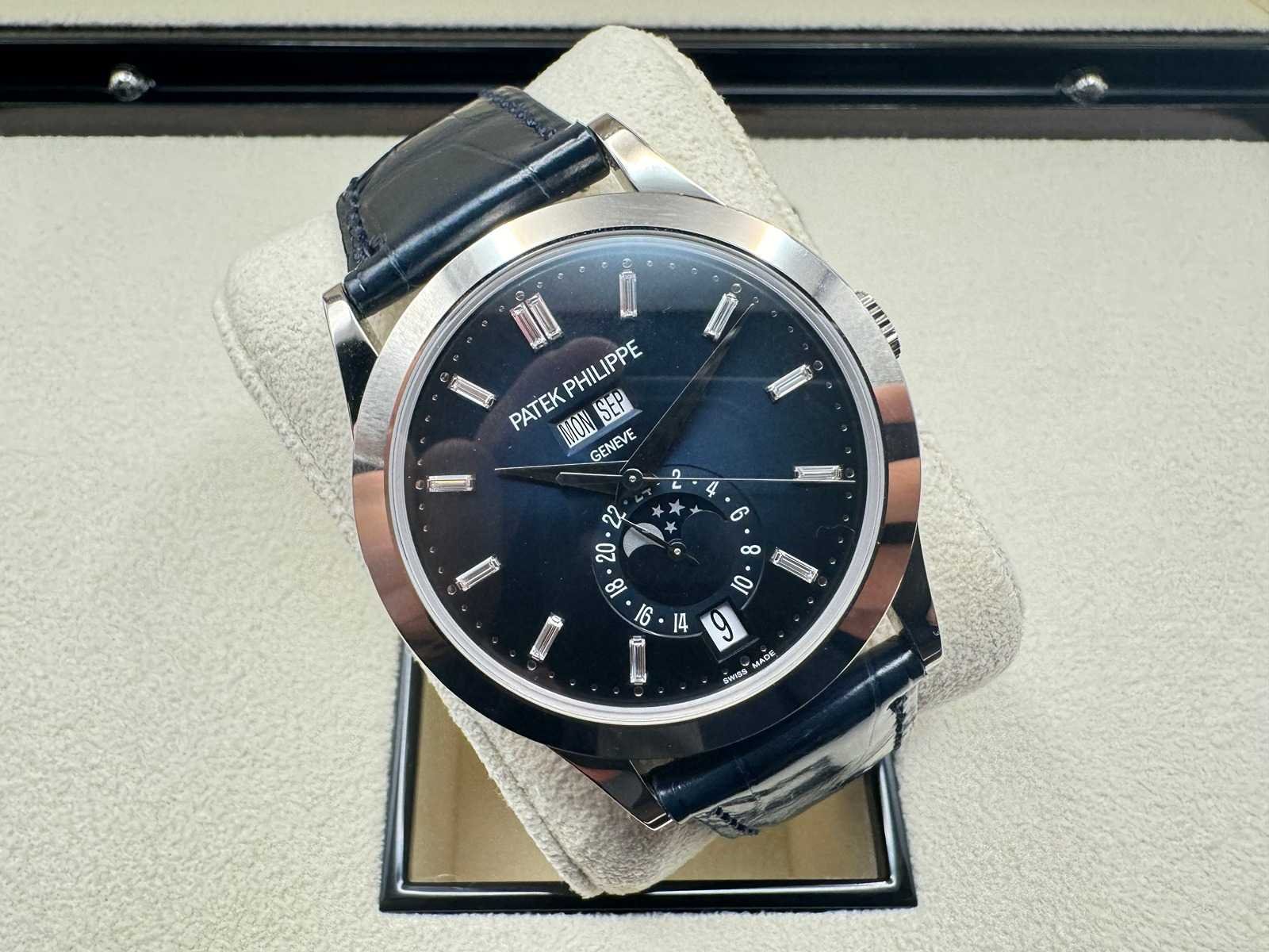 Like new Patek Philippe Annual Calendar 5396G-017, a stunning embodiment of horological excellence. Featuring a captivating blue sunburst dial with applied gold hour markers, elegantly housed in a 38.5mm white gold case, this timepiece is the pinnacle of timeless sophistication. The annual calendar complication and moonphase display highlight Patek Philippe’s legendary craftsmanship and innovation. Condition: Like new, slightly worn Set: Full set – includes original box, papers, Patek Philippe certificate, manuals, and all accessories Model: Annual Calendar (5396G-017), 38.5mm white gold case Features: Blue sunburst dial, annual calendar complication, moonphase display, day and month in twin apertures, and automatic movement Warranty: Full international Patek Philippe warranty The Patek Philippe 5396G-017 with its mesmerizing blue dial is a harmonious blend of tradition and modernity, designed for discerning collectors and enthusiasts. Complete with a full set and Patek Philippe warranty, this iconic timepiece is ready to adorn the wrist of its new owner. Don’t miss your opportunity to own this extraordinary creation from one of the world’s most prestigious watchmakers! Merk: Patek Philippe Model: Annual Calendar Bouwjaar: 2024 Referentienummer: 5369G-017 Materiaal kast: White Gold Materiaal sluiting: White Gold Wijzerplaat: Blue Kastmaat: 38MM