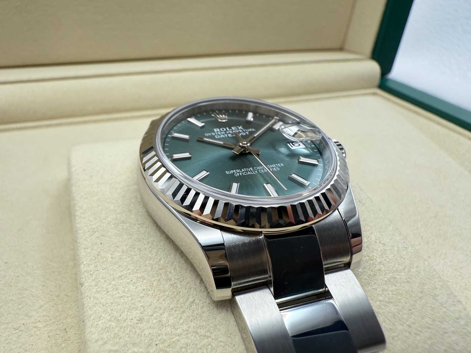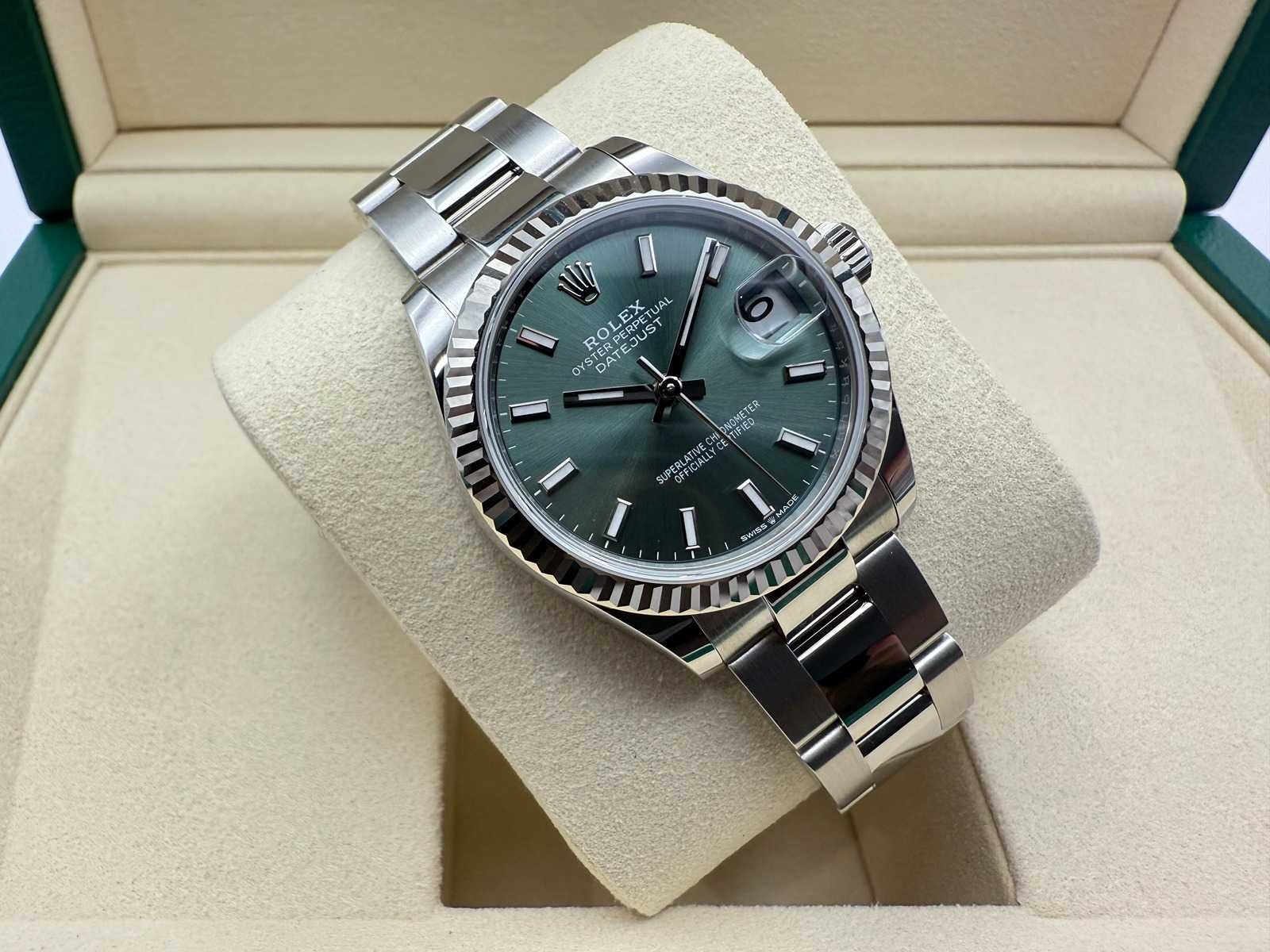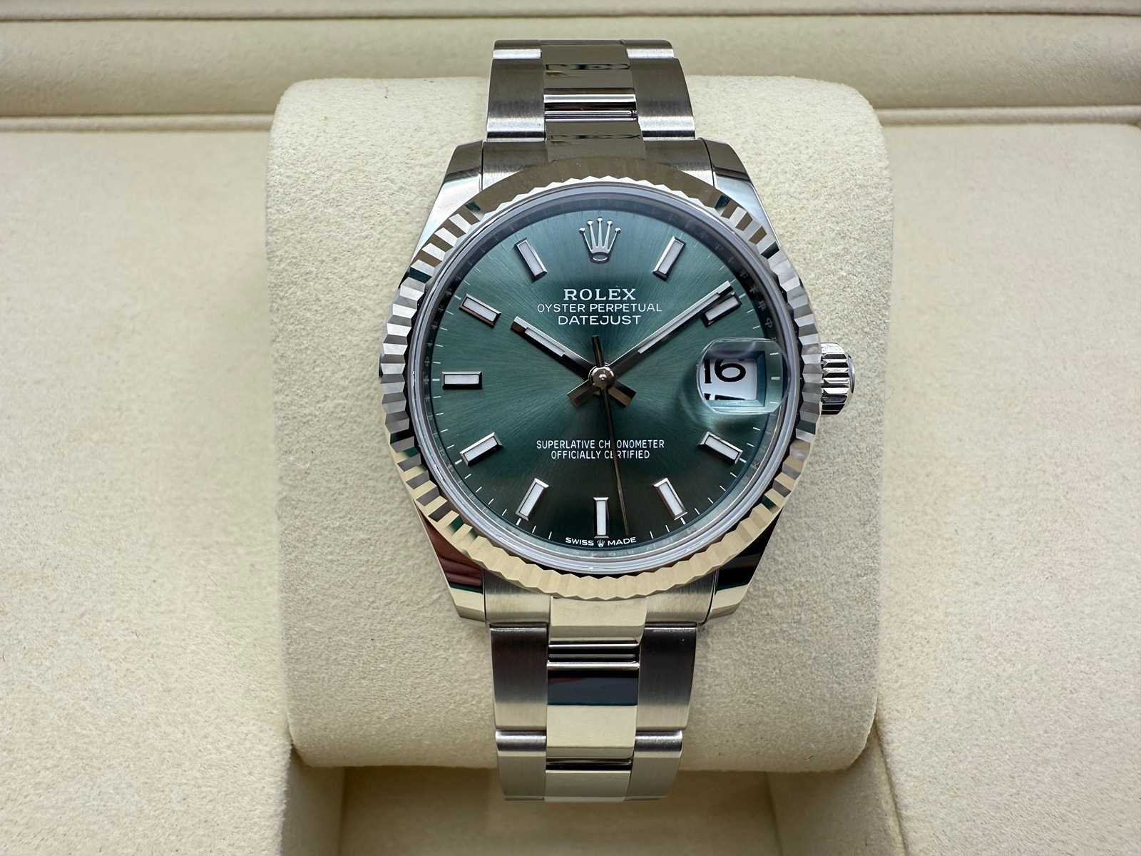Up for sale is this brand-new and unworn Rolex Datejust 31, reference 278274, crafted in stainless steel with an elegant 18k white gold fluted bezel and fitted on the classic Oyster bracelet. The standout feature of this timepiece is its highly desirable mint green dial, a fresh and modern color that has quickly become one of the most sought-after options in the Datejust collection. The combination of the vibrant dial with the refined case and bracelet makes this watch both contemporary and timeless. Backed by a 5-year international Rolex warranty, this watch is offered as a complete full set, including the original Rolex box, warranty card, booklets, cardholder, and Rolex tag. Key Features: Model: Rolex Datejust 31 Reference: 278274 Condition: Brand new, unworn Material: Stainless steel with 18k white gold fluted bezel Dial: Mint Green Bracelet: Oyster (stainless steel) Movement: Automatic Warranty: 5-year international Rolex warranty Set: Full set – Rolex box, warranty card, booklets, cardholder, and tag A fresh and elegant Rolex configuration that combines modern style with timeless design — the perfect everyday luxury watch. Merk: Rolex Model: Datejust 31 Bouwjaar: 2025 Referentienummer: 278274 Materiaal kast: Steel Materiaal horlogeband: Steel Oyster Materiaal sluiting: Steel Wijzerplaat: Mint Green Kastmaat: 31 mm