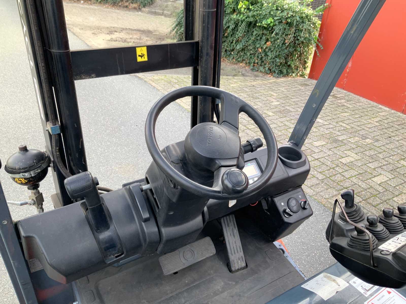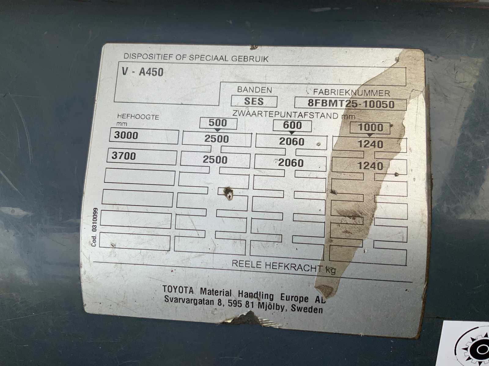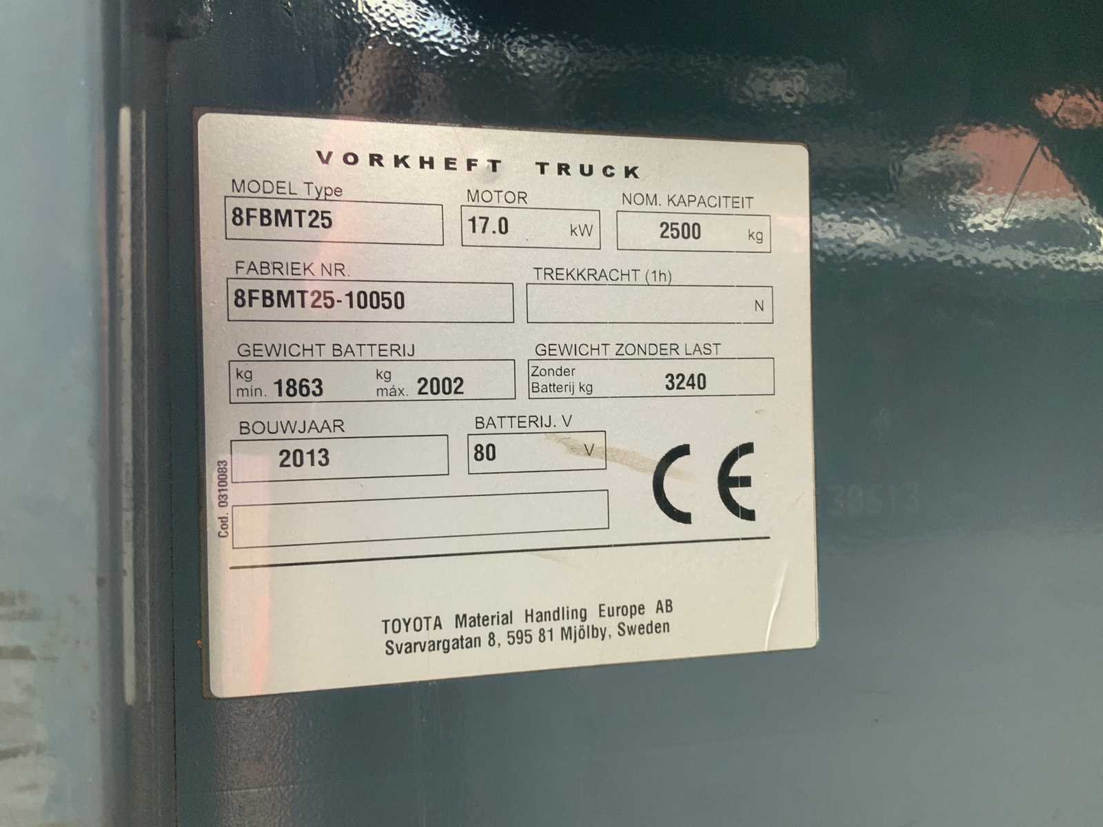 Uitgevoerd met accumulator voor schok dempende werking van het te tillen gewicht, twee werklampen voor en met Autofill systeem, zonder acculader. Heftruck heeft dienst gedaan bij pallethandel en daarvoor extra valbeveiliging rek op dak deze is eenvoudig te demonteren. Merk: Toyota Type: 8FBMT25 Bouwjaar: 2013 Serienummer: 8FBMT25-10050 Brandstof: Elektrisch Mast: Duplex Soort band: Volrubber banden Aantal wielen: 4 Afgelezen urenstand: 2567 Side-shift: true Duplex mast: true Eigen gewicht: 5103kg Hefvermogen: 2500kg Lepellengte: 1000mm Max. hefhoogte: 3700mm Vol rubber banden: true Minimale doorrijhoogte: 2620mm Totale afmeting L: 3500mm Totale afmeting Breedte: 1200mm Totale afmeting Hoogte: 2620mm
