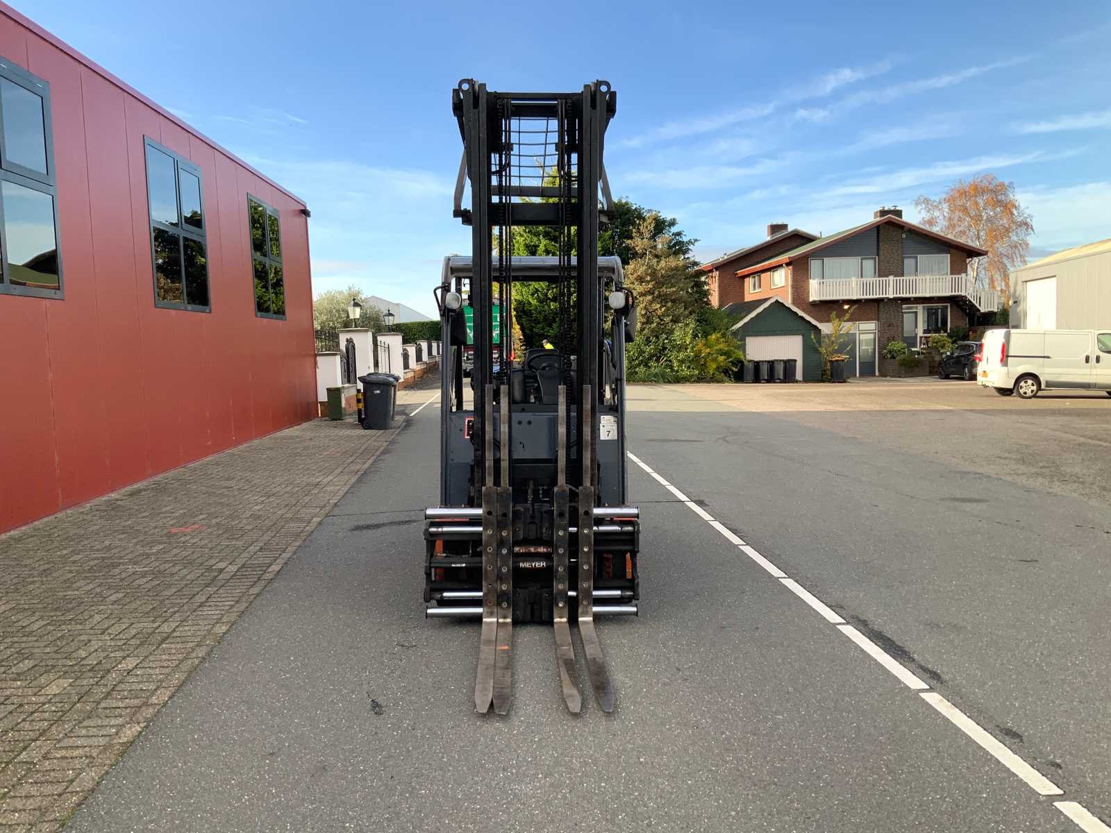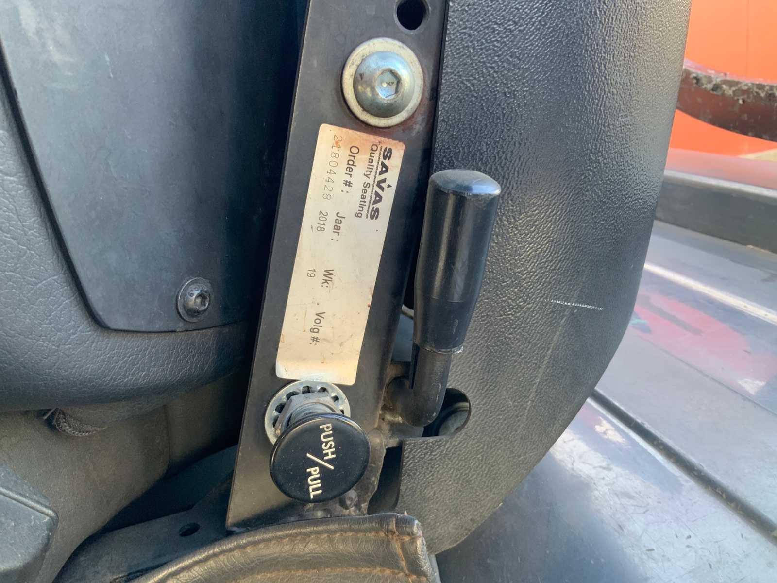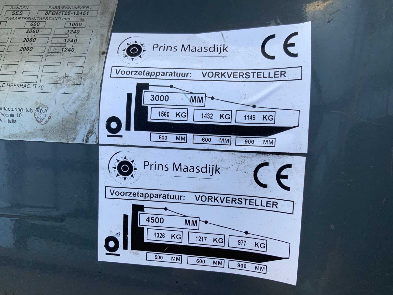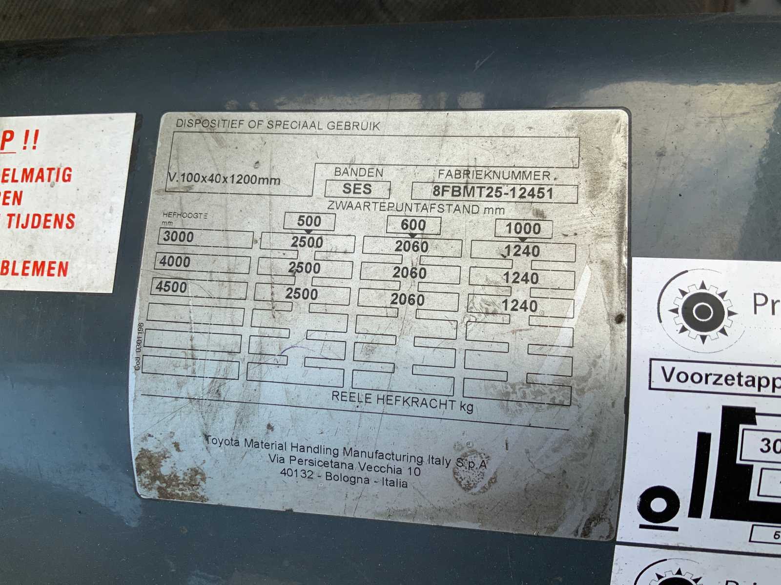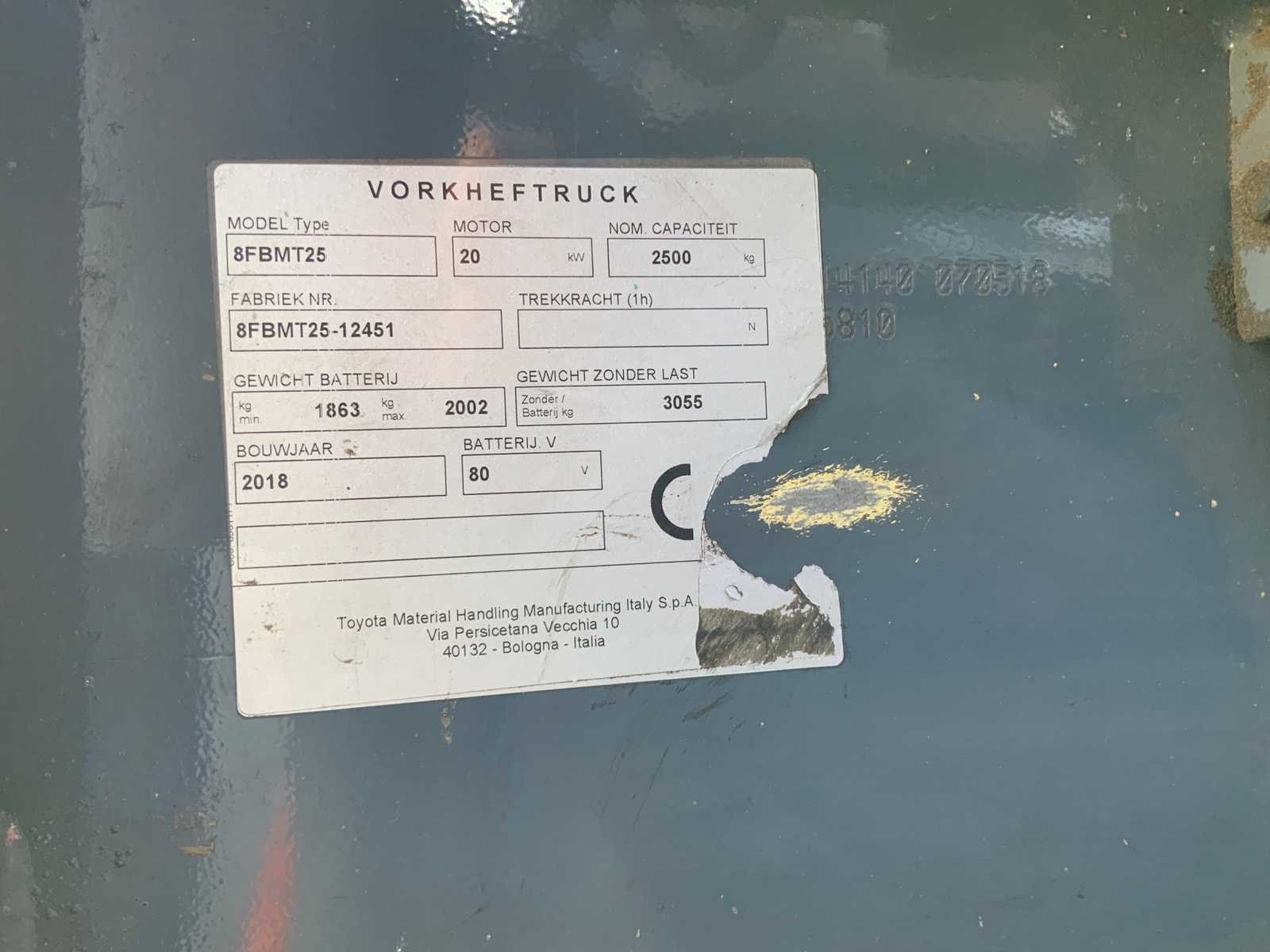 Uitgevoerd met Meyer multi pallet handler systeem, IWS Pilot Protector veiligheidssysteem, Savas ergonomische stoel, twee werklampen voor + combinatie verlichting en met Autofill systeem, zonder acculader. Heftruck heeft dienst gedaan bij pallethandel en daarvoor extra valbeveiliging rek op dak deze is eenvoudig te demonteren. Merk: Toyota Type: 8FBMT25 Bouwjaar: 2018 Serienummer: 8FBMT25-12451 Brandstof: Elektrisch Mast: Duplex Soort band: Volrubber banden Aantal wielen: 4 Afgelezen urenstand: 6660 Side-shift: true Hydraulisch verstelbare lepels: true Duplex mast: true Eigen gewicht: 4918kg Hefvermogen: 2500kg Lepellengte: 1200mm Max. hefhoogte: 4500mm Vol rubber banden: true Minimale doorrijhoogte: 3080mm Totale afmeting L: 3800mm Totale afmeting Breedte: 1200mm Totale afmeting Hoogte: 3080mm