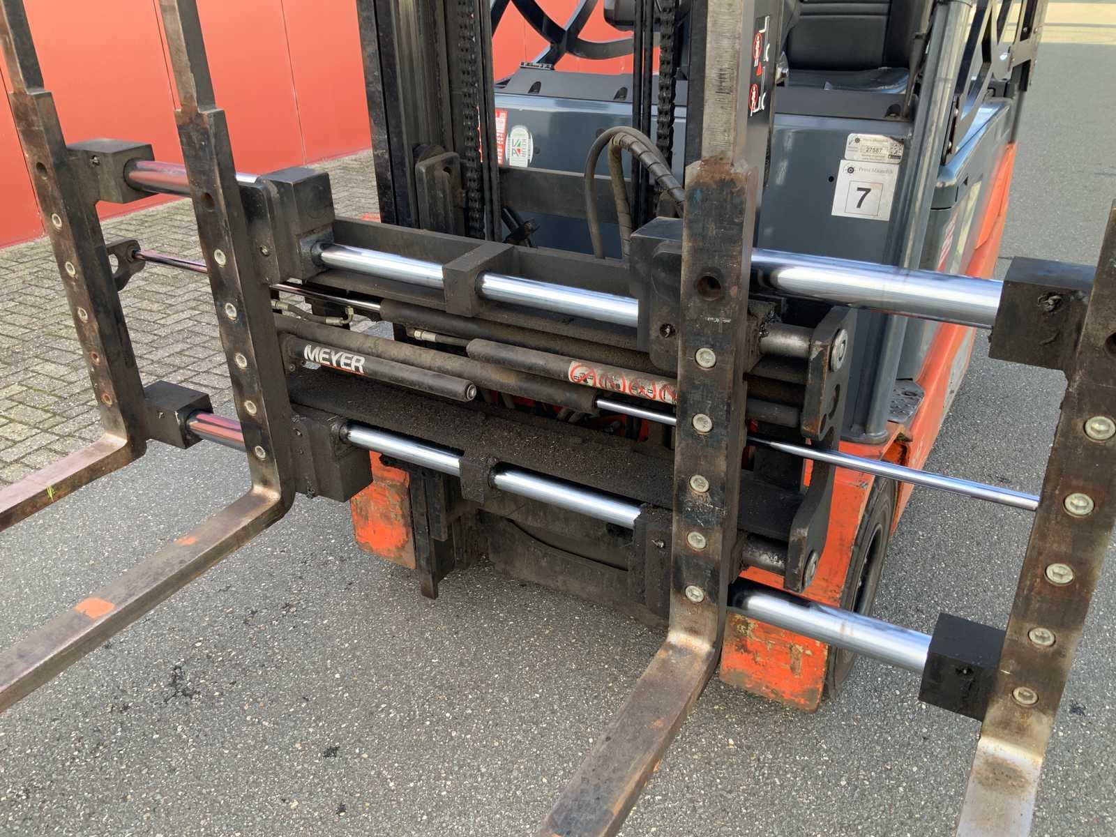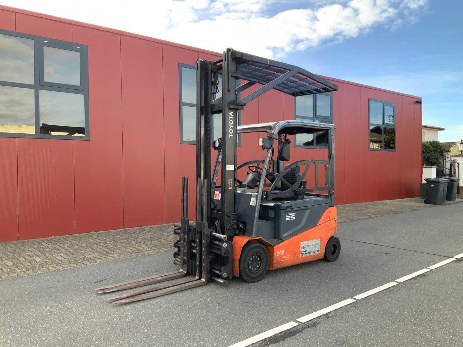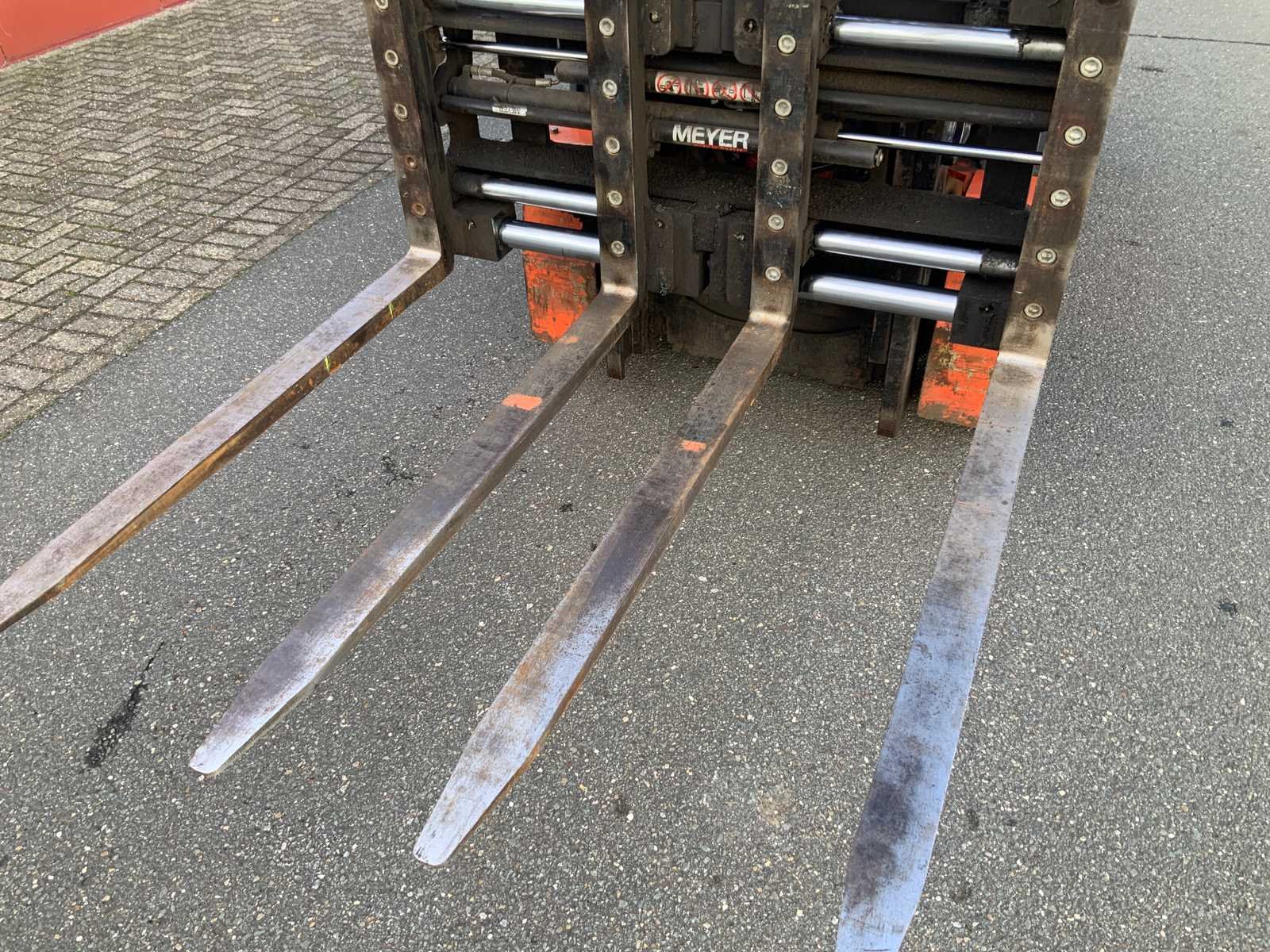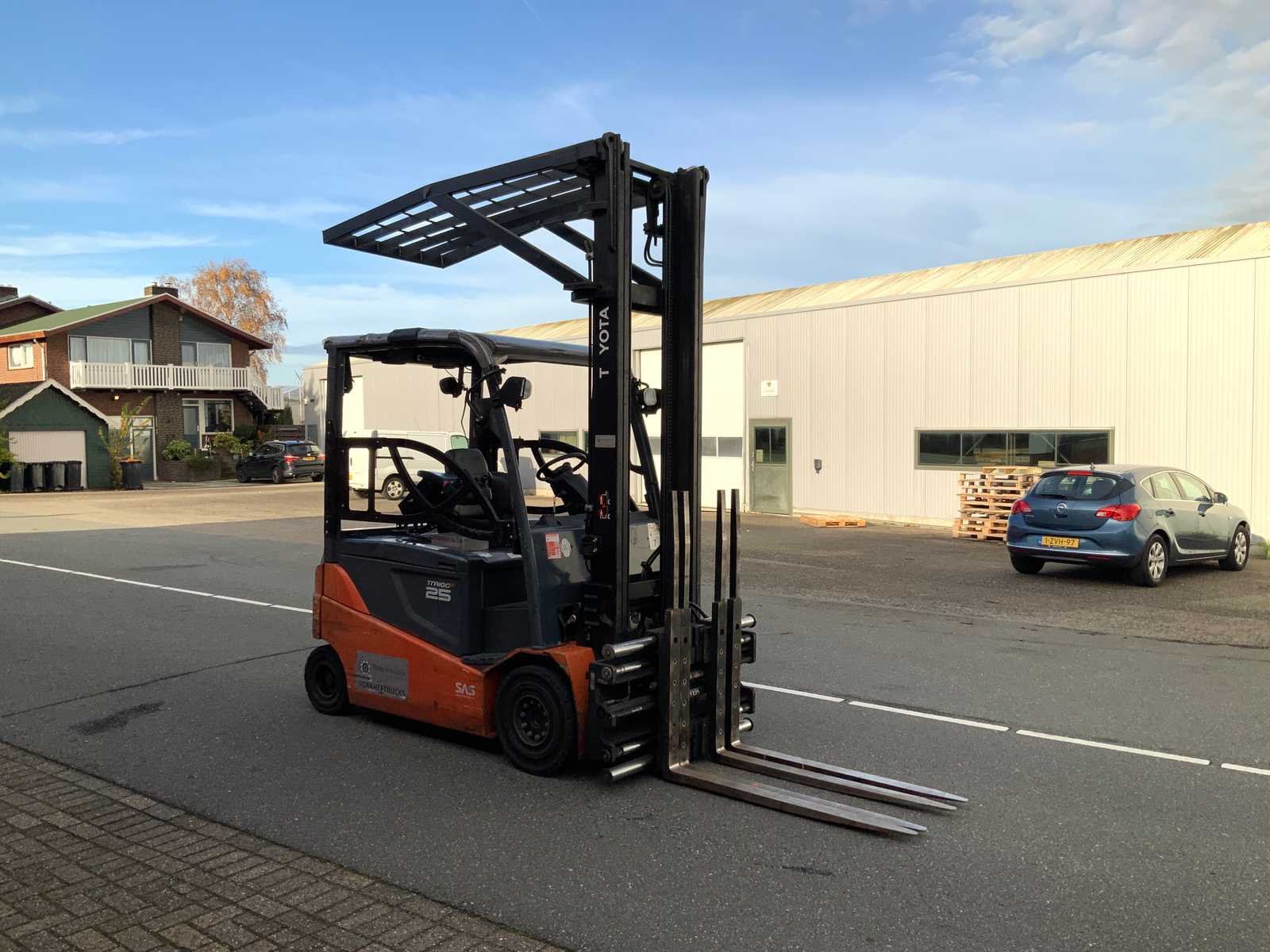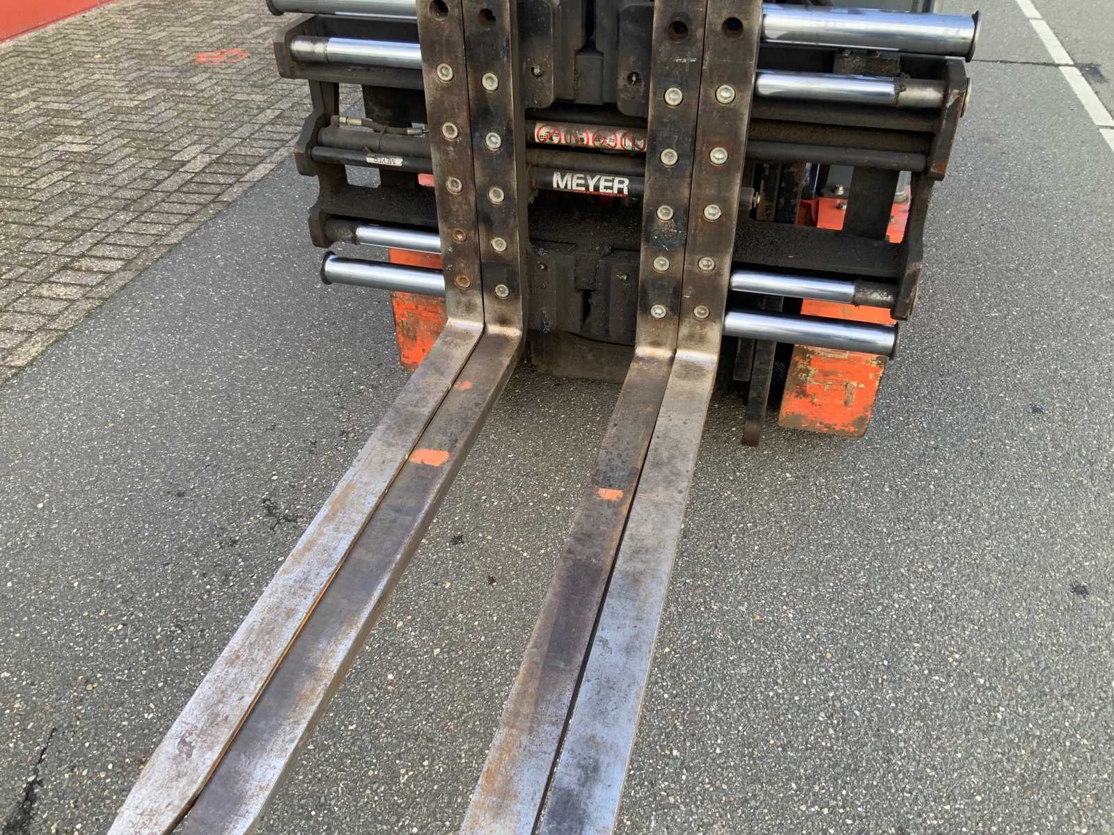 Uitgevoerd met Meyer multi pallet handler systeem, IWS Pilot Protector veiligheidssysteem, Savas ergonomische stoel, twee werklampen voor + combinatie verlichting en met Autofill systeem, zonder acculader. Heftruck heeft dienst gedaan bij pallethandel en daarvoor extra valbeveiliging rek op dak deze is eenvoudig te demonteren. Merk: Toyota Type: 8FBMT25 Bouwjaar: 2018 Serienummer: 8FBMT25-12451 Brandstof: Elektrisch Mast: Duplex Soort band: Volrubber banden Aantal wielen: 4 Afgelezen urenstand: 6660 Side-shift: true Hydraulisch verstelbare lepels: true Duplex mast: true Eigen gewicht: 4918kg Hefvermogen: 2500kg Lepellengte: 1200mm Max. hefhoogte: 4500mm Vol rubber banden: true Minimale doorrijhoogte: 3080mm Totale afmeting L: 3800mm Totale afmeting Breedte: 1200mm Totale afmeting Hoogte: 3080mm