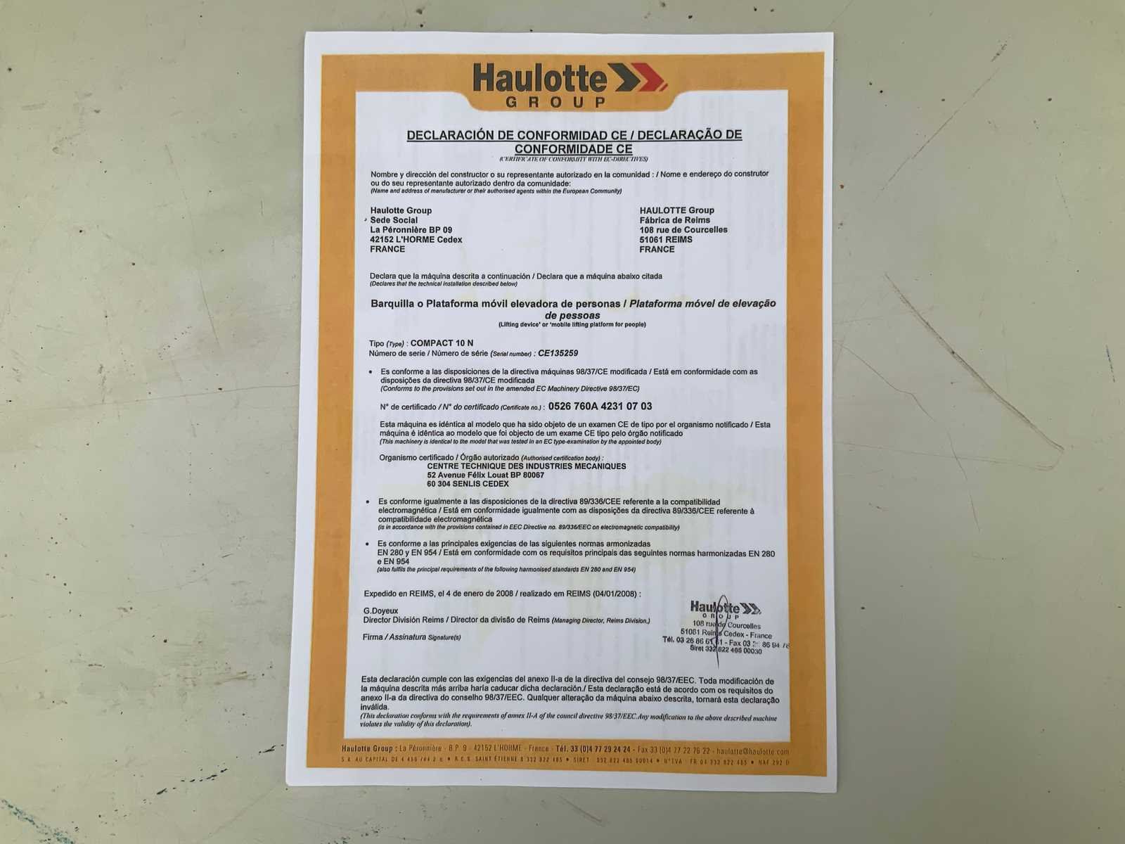 Met declaration of conformity Merk: Haulotte Type: Compact10N Bouwjaar: 2005 Serienummer: CE135259 Elektrisch: true Schaarhoogwerker: true Werkhoogte: 10000mm Plateau afm. l: 3400mm Plateau afm. b: 810mm Platform capaciteit: 230kg Accu lader: true Afgelezen urenstand: 155 Eigen gewicht: 2150kg Totale afmeting L: 2500mm Totale afmeting Breedte: 810mm Totale afmeting Hoogte: 2180mm