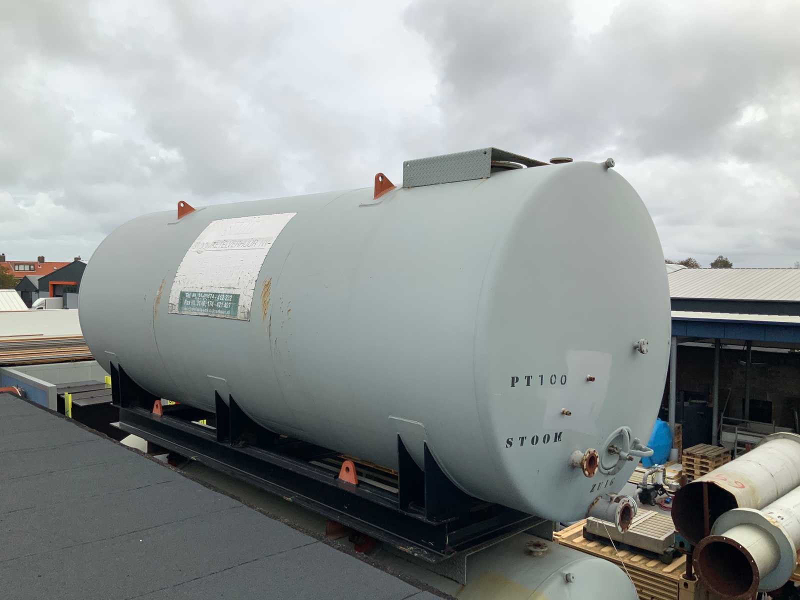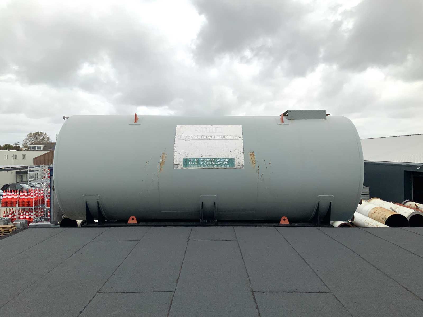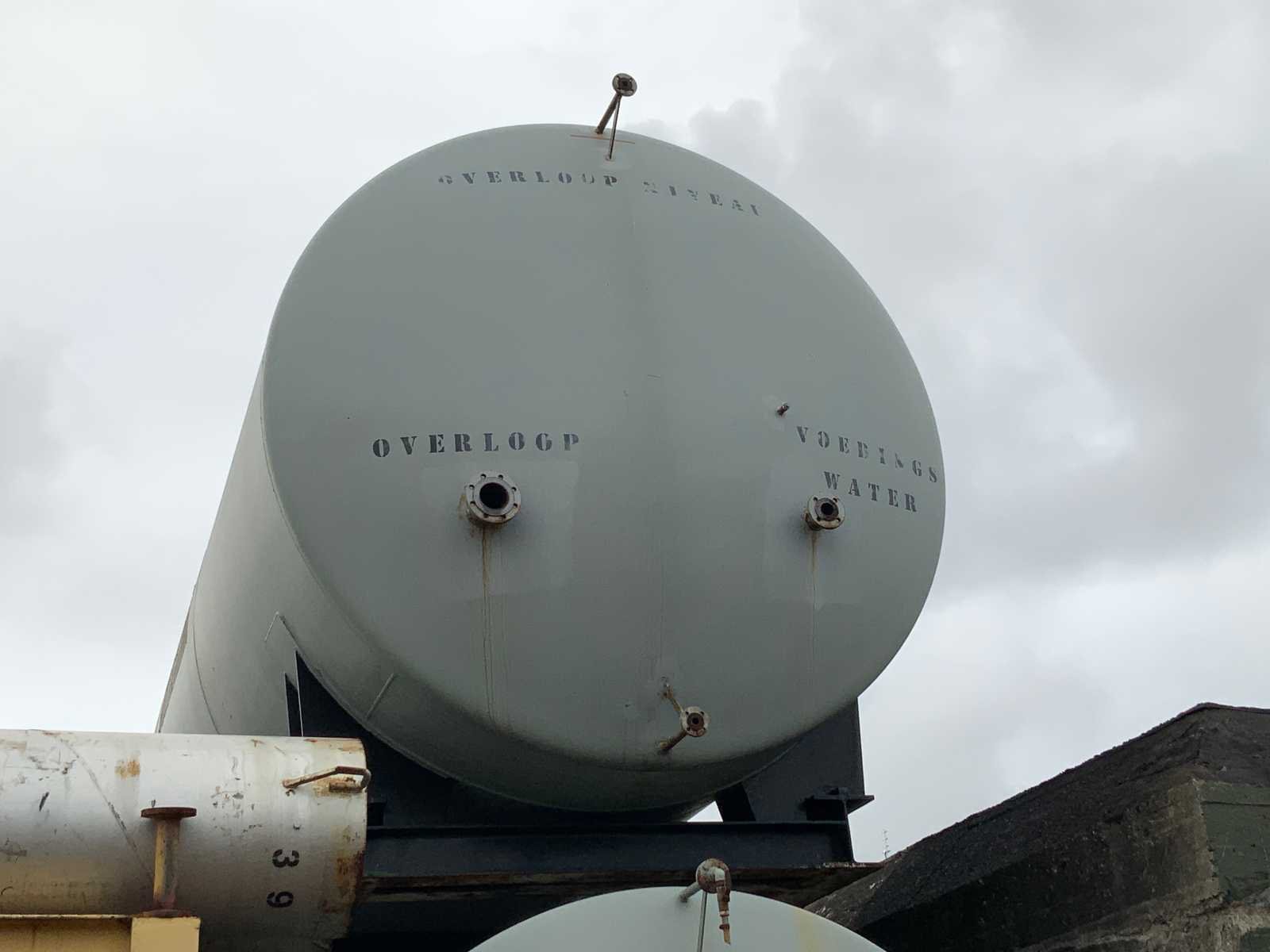 Stalen tank is gemonteerd op frame en binnenzijde tank is geëmailleerd afmeting lengte x dia: ca 850x300 cm en inhoud ca 55-60 M3 eigen gewicht ca 11.000 kg, assistentie met laden en heftruck 16T beschikbaar. Staal: true