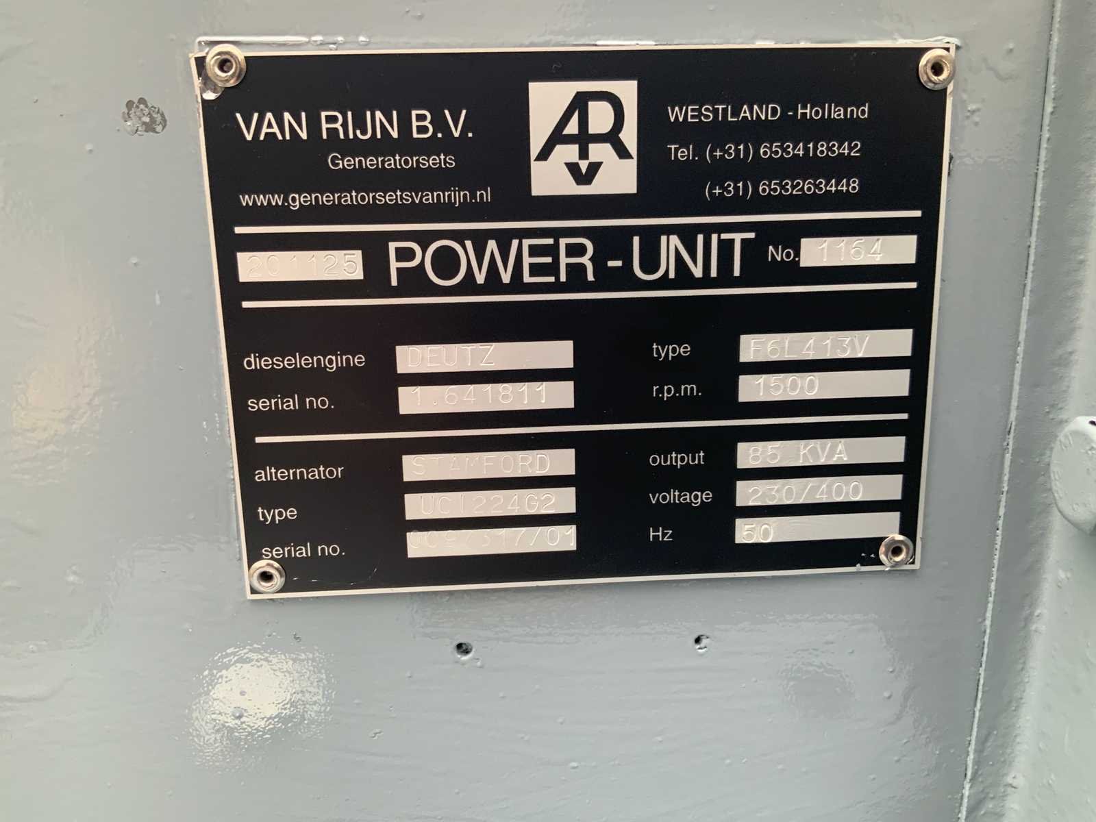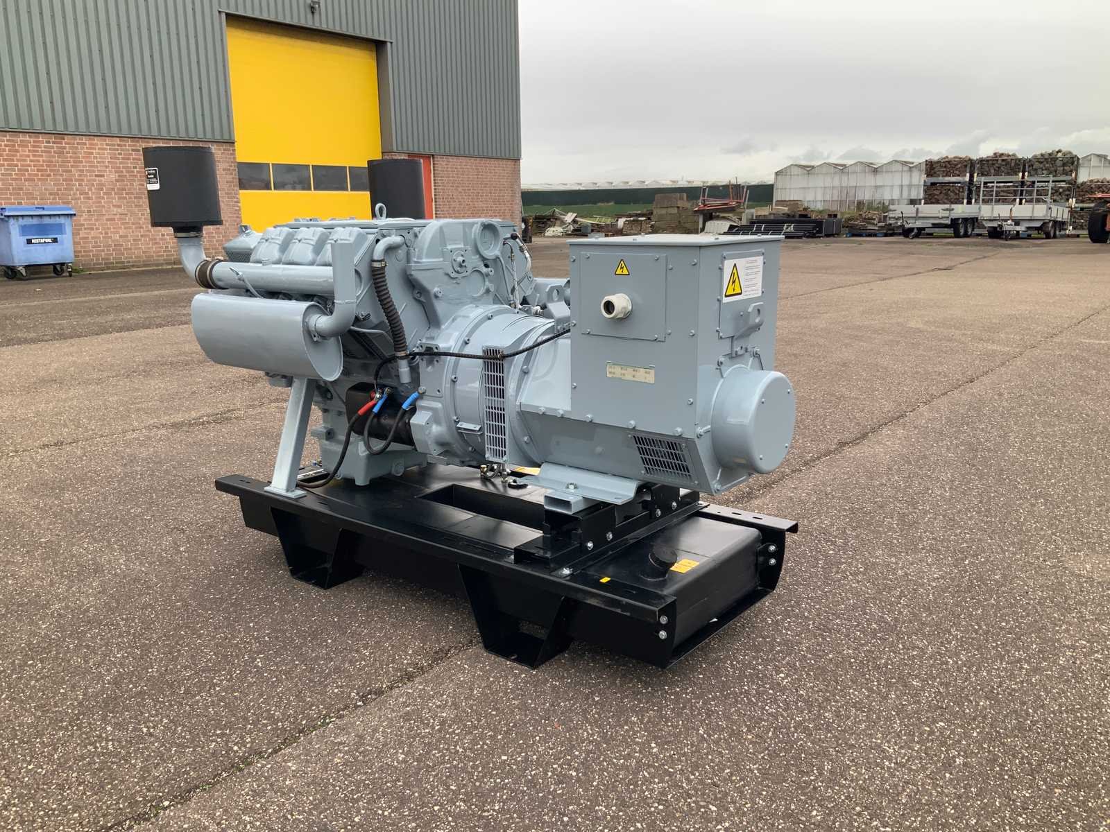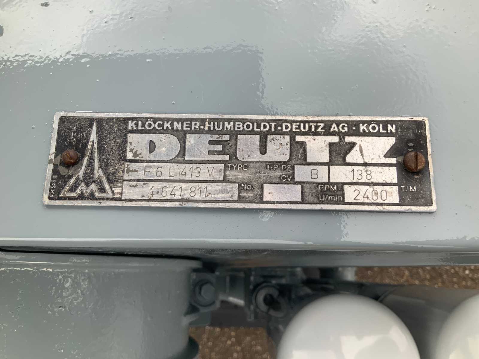 Generator is gebouwd op tankfundatie met een inhoud van 140 liter, elektrisch gestart 24 V met twee nieuwe accu’s, capaciteit 85 KVA bij 1500 r.p.m. spanning 230/400 V set is belast getest en verkeerd in uitstekende staat. Merk: Deutz/Stamford Type: F6L413V Serienummer: 1641811 Capaciteit.: 85kVA Aansluiting: 400V Motor merk: Deutz Generator merk: Stamford Generator type: UCI224G2 Totale afmeting L: 2000mm Totale afmeting Breedte: 1150mm Totale afmeting Hoogte: 1420mm
