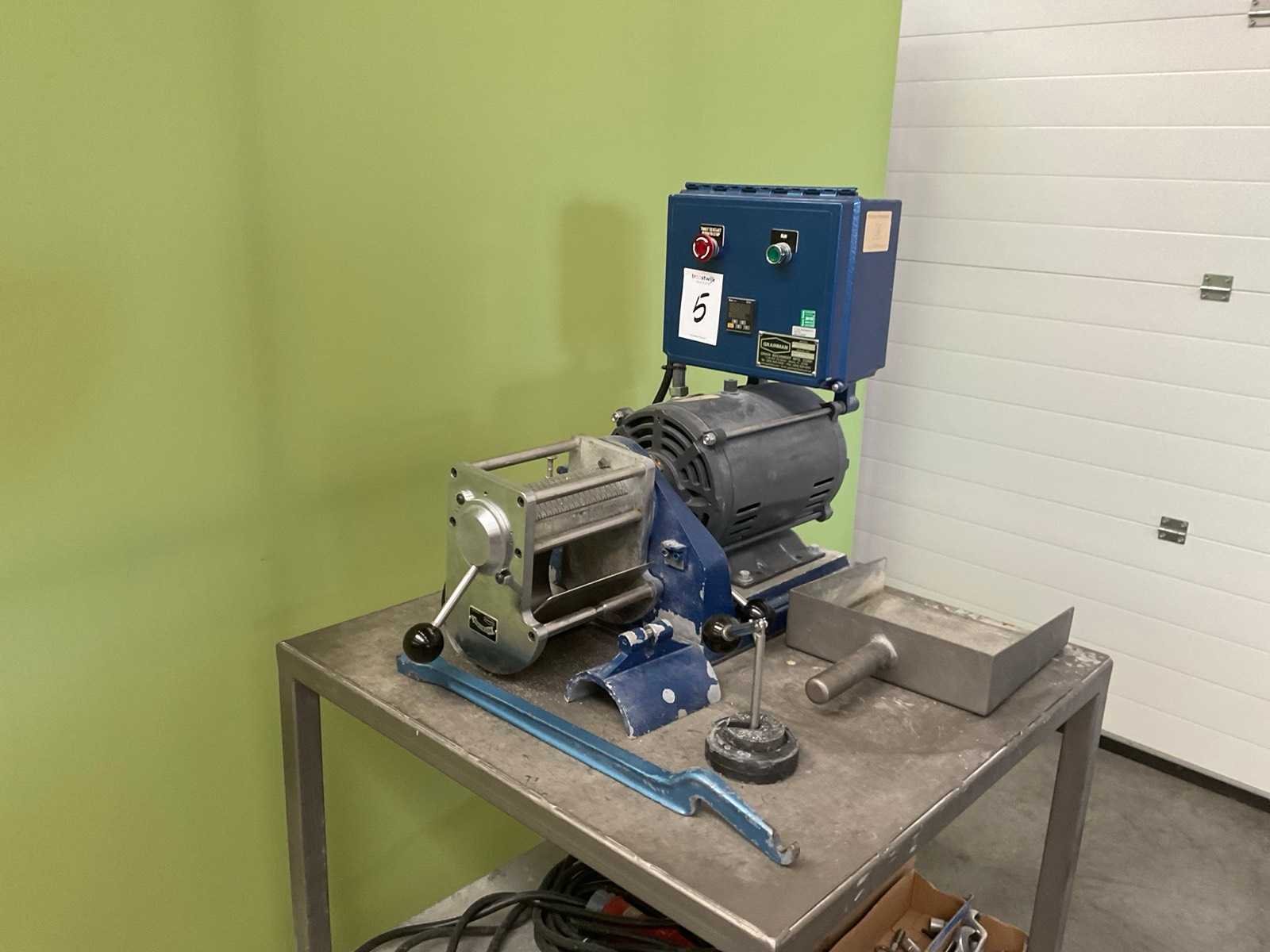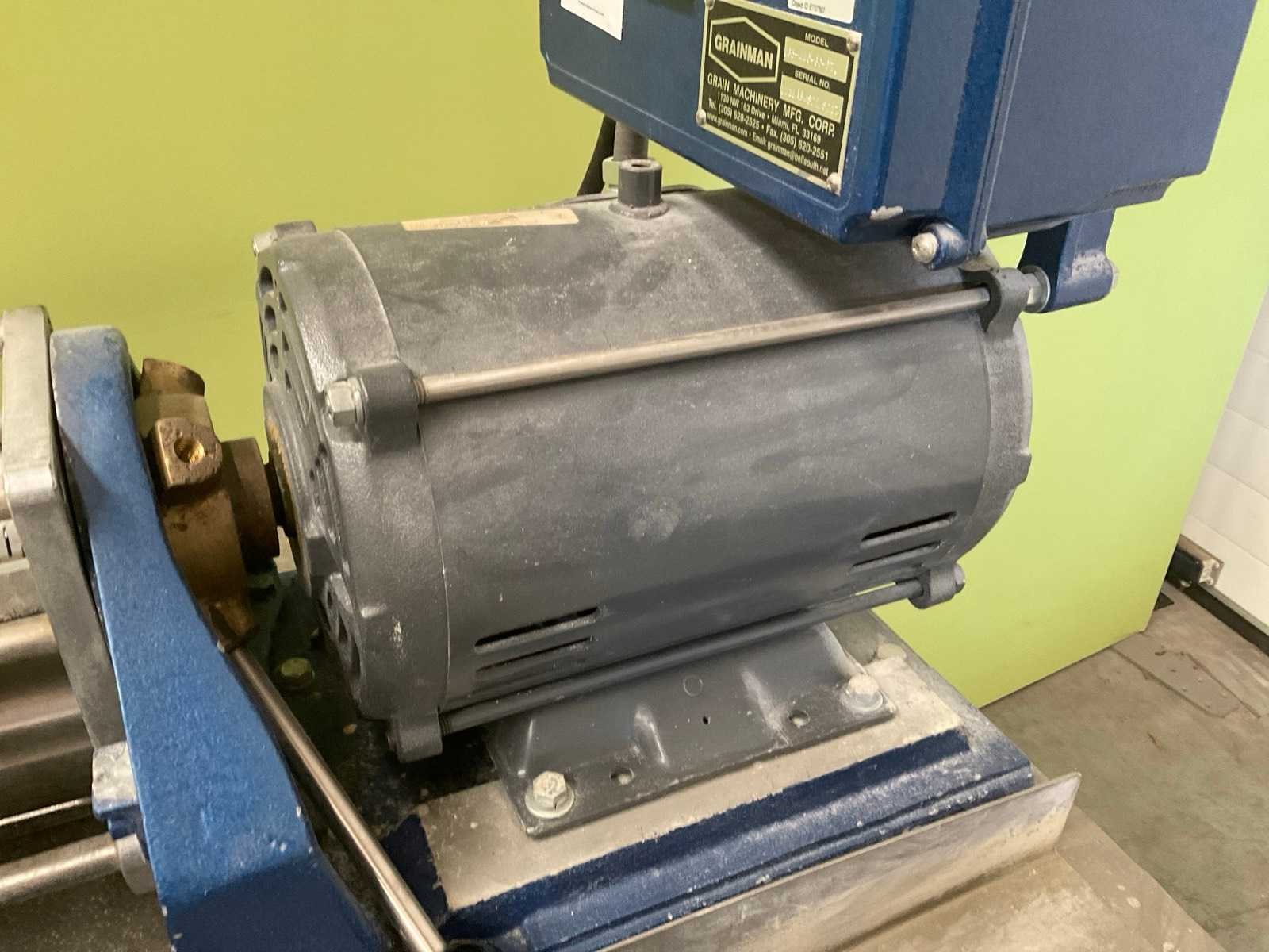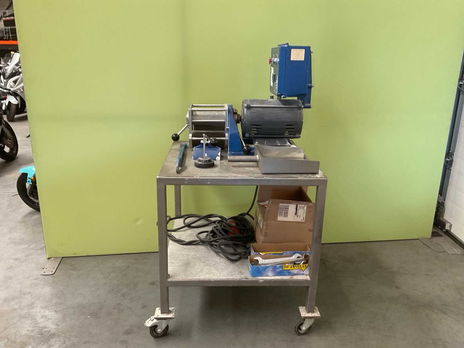 Inclusief: mobiel onderstel. Merk: Grainman Type: 65-440-60-DT Serienummer: 11LAB4822/8217 Werkbreedte: 150mm Aansluiting: 400V Totale afmeting L: 800mm Totale afmeting Breedte: 800mm Totale afmeting Hoogte: 1500mm