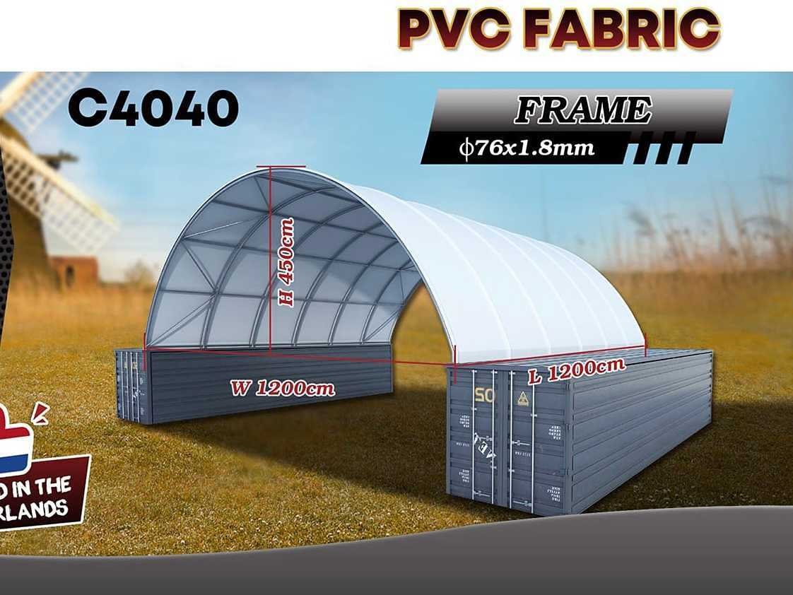 Voorzien van opslagtent / opslag shelter; singel trussen-/buizensysteem; gegalvaniseerd; beide uiteinden een deur; materiaal 300 gram PVC cover; kleur wit; inclusief montage handleiding; ongebruikt in metalen kist (transport afmetingen 243x75x118 cm) Merk: Rhino-Cross-Shelter Type: C4040 - 12x12x4,5 m Bouwjaar: 2025 Eigen gewicht: 980kg Totale afmeting L: 12000mm Totale afmeting Breedte: 12000mm Totale afmeting Hoogte: 4500mm