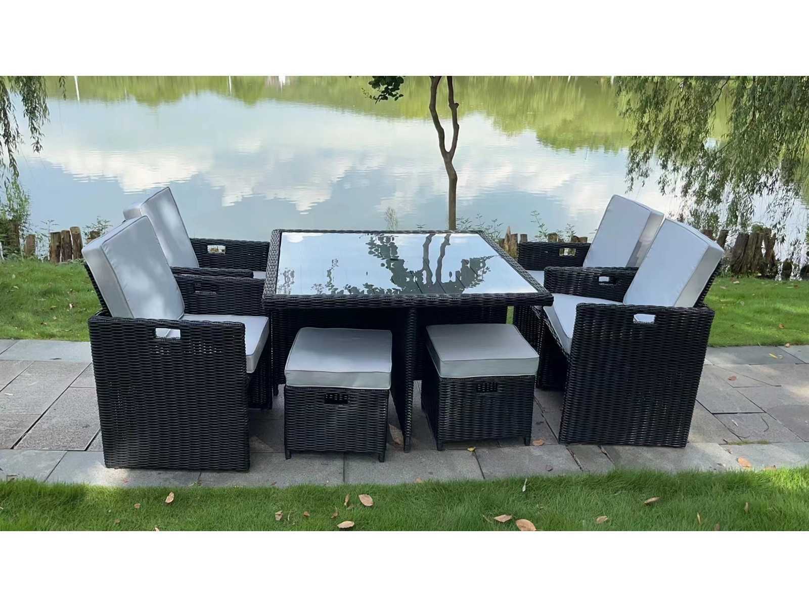 Type: NEVADA-26-BL. Kleur: Black wicker, witte kussens. Model: 9-delige diningset. Afmetingen 9-delige set: 1* tafel 125*125*75cm, 4* stoel 60*60*68/93cm, 4* ottoman 45*45*36cm. Frame: Gepoedercoat aluminium frame - garandeert een langere levensduur. Voorzien van: weerbestendig vlechtwerk Merk: VONATO Model: Modern Brown Product type: 9-delig Kussens: wit Stapelbaar: Nee Vorm: vierkant Kleur: zwart Hoogte: 75cm Materiaal: Gepoedercoat aluminium frame