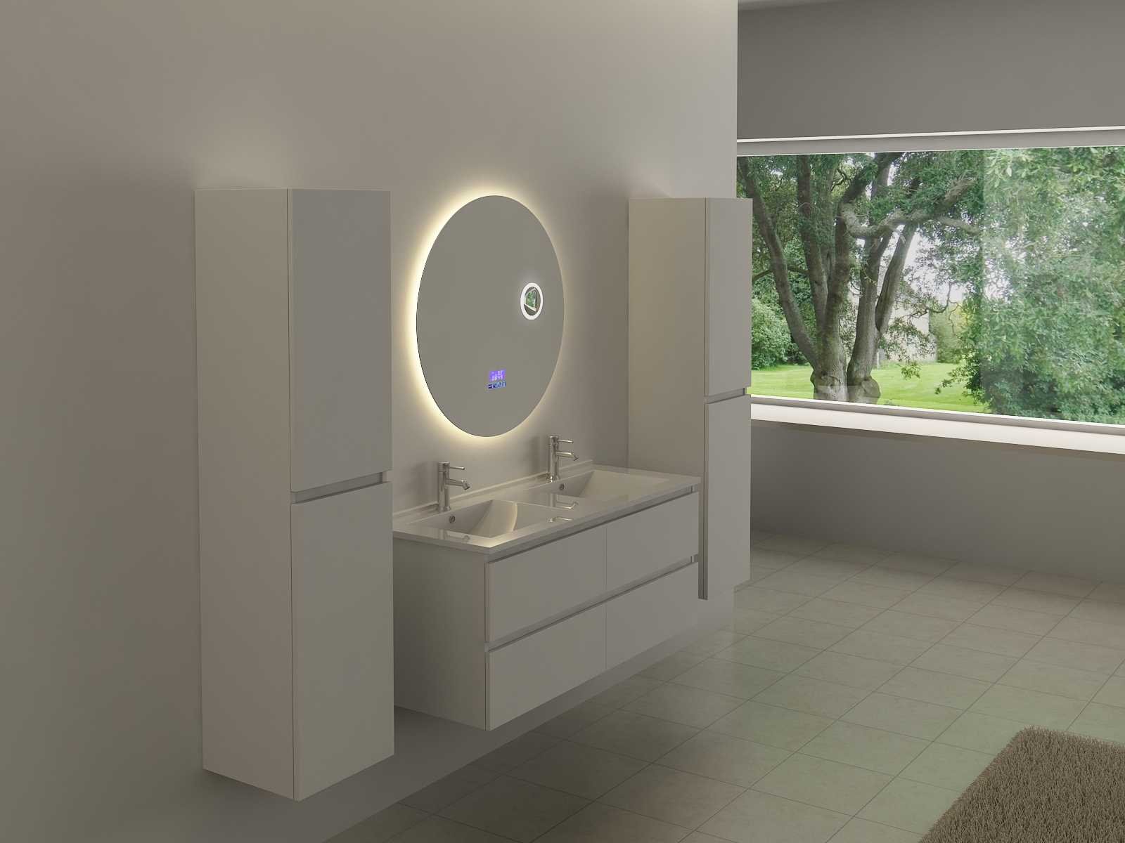 Type: RNLM-80 Model: Ronde spiegel met LED verlichting Afmetingen: Ø80 cm, dikte: 0,5 cm Kleur: LED verlichting in 3 kleuren; geel, blauw en wit Voorzien van: Touch bediening via digitaal display – LED verlichting in 3 kleuren, dimbaar – Bluetooth & speakers – Digitale klok – Digitale temperatuurmeter – 220 volt aansluiting – Anti-fog technologie door verwarming in de spiegel – Vergrootglas (vergroot 3x) in de spiegel Ø10 cm - Kopervrije spiegel - 1,5mm explosieveilige laag aan de achterkant. Merk: Vonato Model: Corviano Product type: met LED verlichting Kleur: LED verlichting in 3 kleuren; geel, blauw en wit