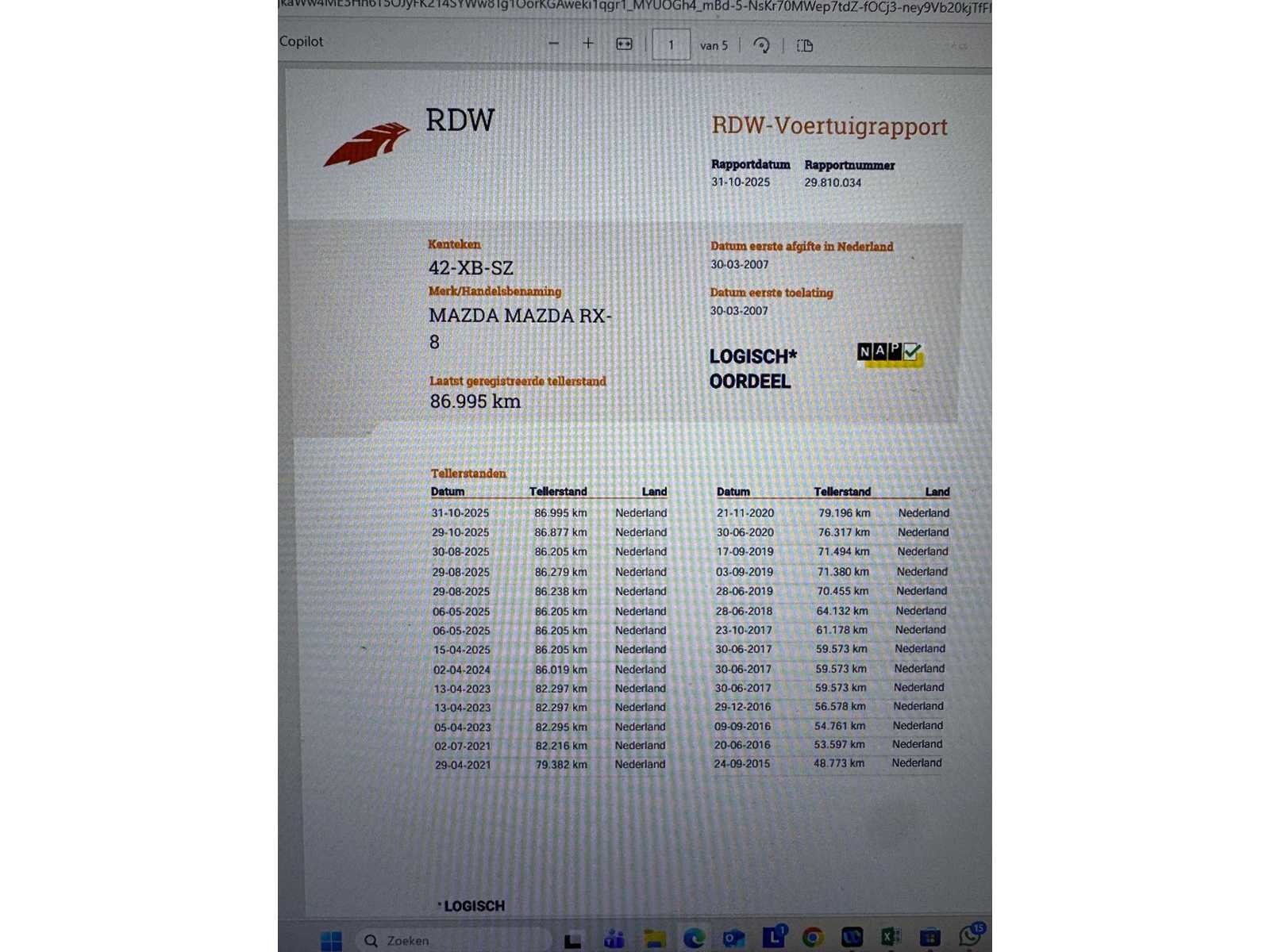 Mazda RX-8 1.3 Renesis 86000km Org Nederlands Unieke auto Omdat dit kavel niet in Spijkenisse staat moet u ons een mail sturen dan krijgt u van ons het adres. Vermeld wel het veilingnummer en kavelnummer zodat het voor ons makkelijker zoeken is. Kenteken: 42-XB-SZ Merk: Mazda Model: RX-8 Type: 1.3 Renesis Afgelezen kilometerstand: 86996km Cilinderinhoud: 1308cc Vermogen (kW): 141kW Brandstof: Benzine Chassisnummer: JMZSE17N250125260 Laadvermogen: 0kg NAP status: Logisch Datum eerste toelating: 2007-03-30 Datum eerste toelating (NL): 2007-03-30 APK vervaldatum: 2026-08-29 Aantal zitplaatsen: 4 Kleur: grijs Stuurwiel: links Emissieklasse: 4 Aantal deuren: 4 Ledig gewicht: 1290kg Bruto BPM (NL): 8292€ Carrosserie: sedan Nationaliteit documenten: Nederland Onderhoudshistorie: Ja gedeeltelijk Carfax Link: https://was.carfax.eu/v0/api/ccdid/5100016408/svc/201/vinreg/42XBSZ/checksum/eyJhbGciOiJIUzI1NiIsInR5cCI6IkpXVCJ9.eyJleHAiOjE3Njc0Mzc4MDR9.Y_YyReN7tkz9EldzKBXsJiZpdutjFun_zC3nP9u-Yig startinformatie : Start en rijdt Airconditioning: true Navigatie: true Xenon verlichting: true Leder bekleed: true
