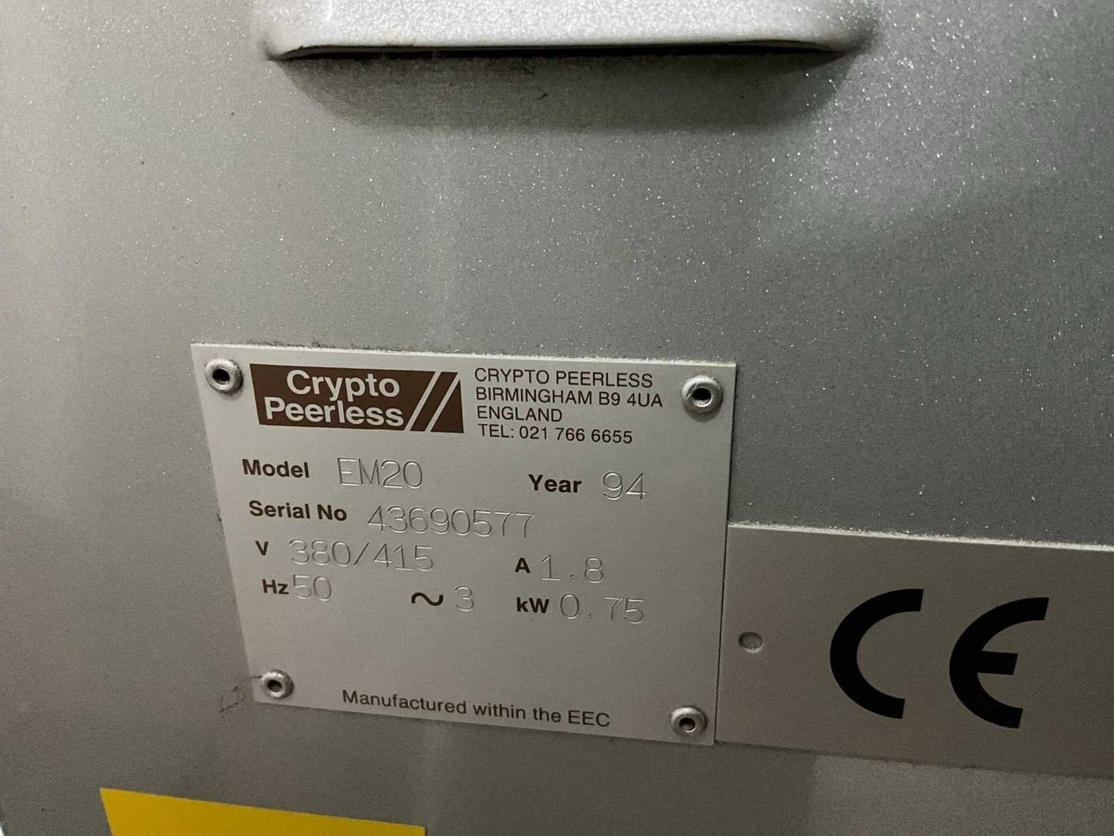 1,8 KW Merk: Cryprto Peerless Type: Em20 Aansluiting: 400V Totale afmeting L: 55cm Totale afmeting Breedte: 65cm Totale afmeting Hoogte: 153cm
