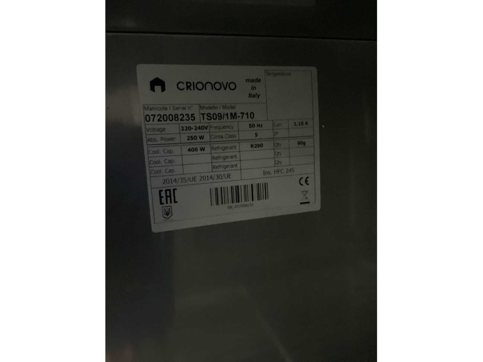 250 watt. Merk: Crionovo Type: TS09/1M-710 Totale afmeting L: 224cm Totale afmeting Breedte: 70cm Totale afmeting Hoogte: 90cm Materiaal: rvs Ingebouwde koelcompressor: true Rvs: true Aansluiting: 230V Lengte: 87cm Breedte: 70cm Hoogte: 90cm
