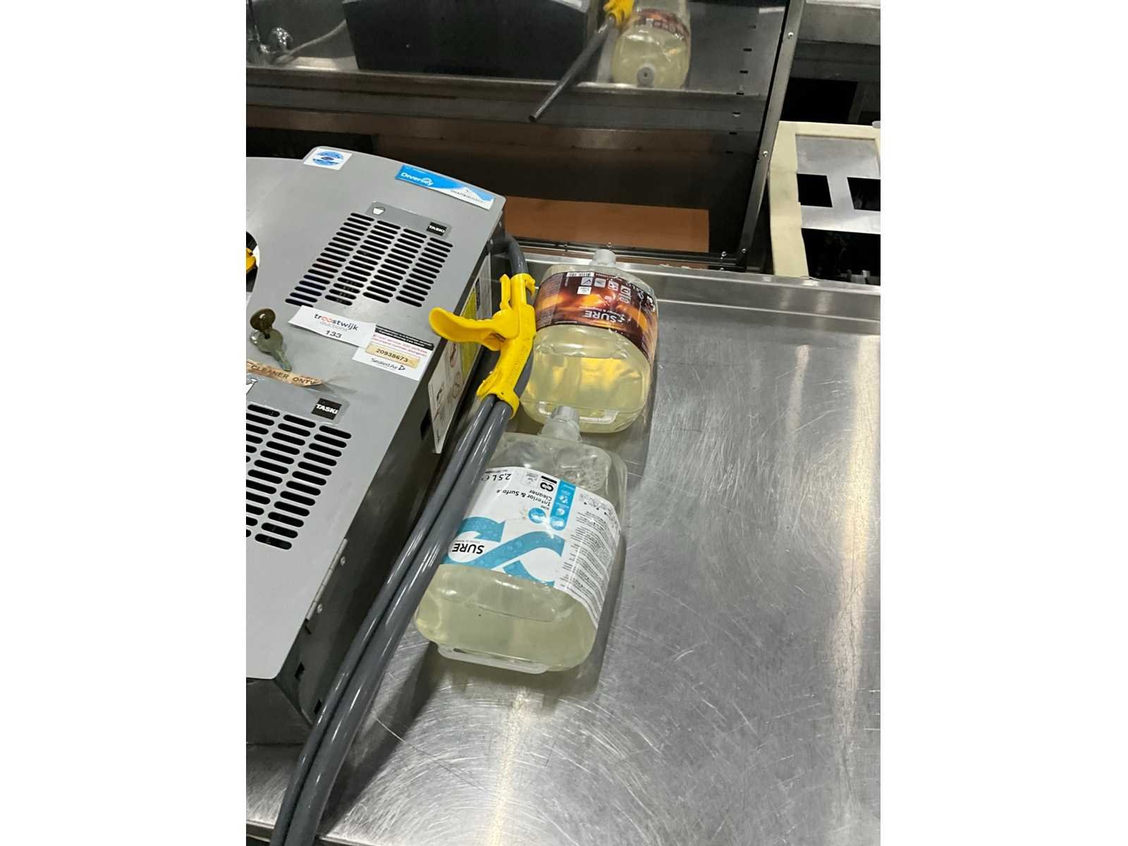 Verdunnings station voor reinigingsmiddel.; inclusief vloeistof. Merk: Taski Model: Quatro Select Lengte: 48cm Breedte: 16cm Hoogte: 60cm