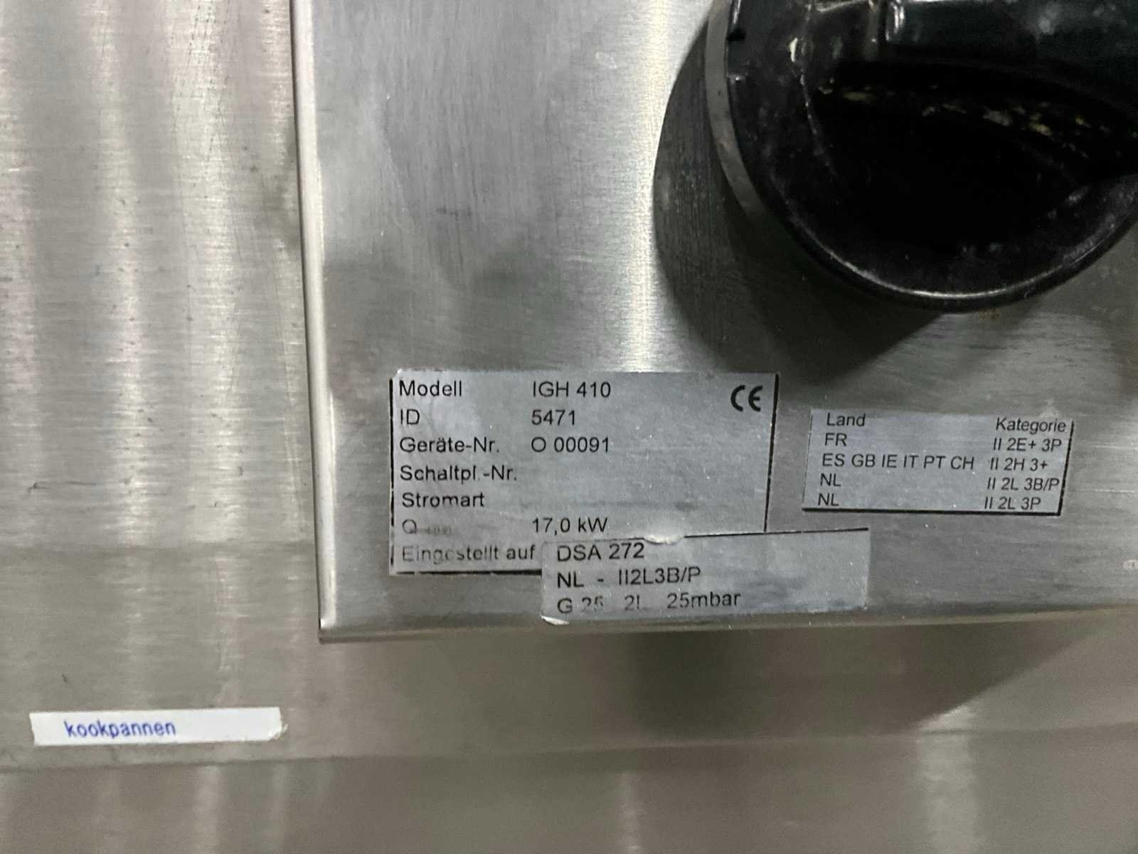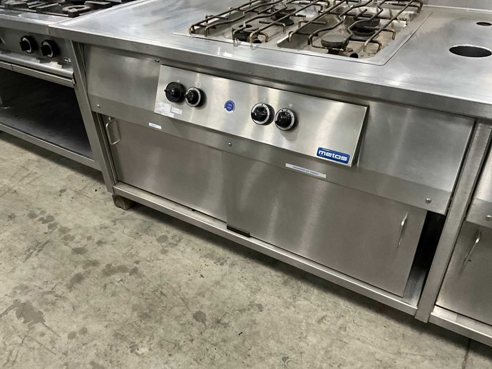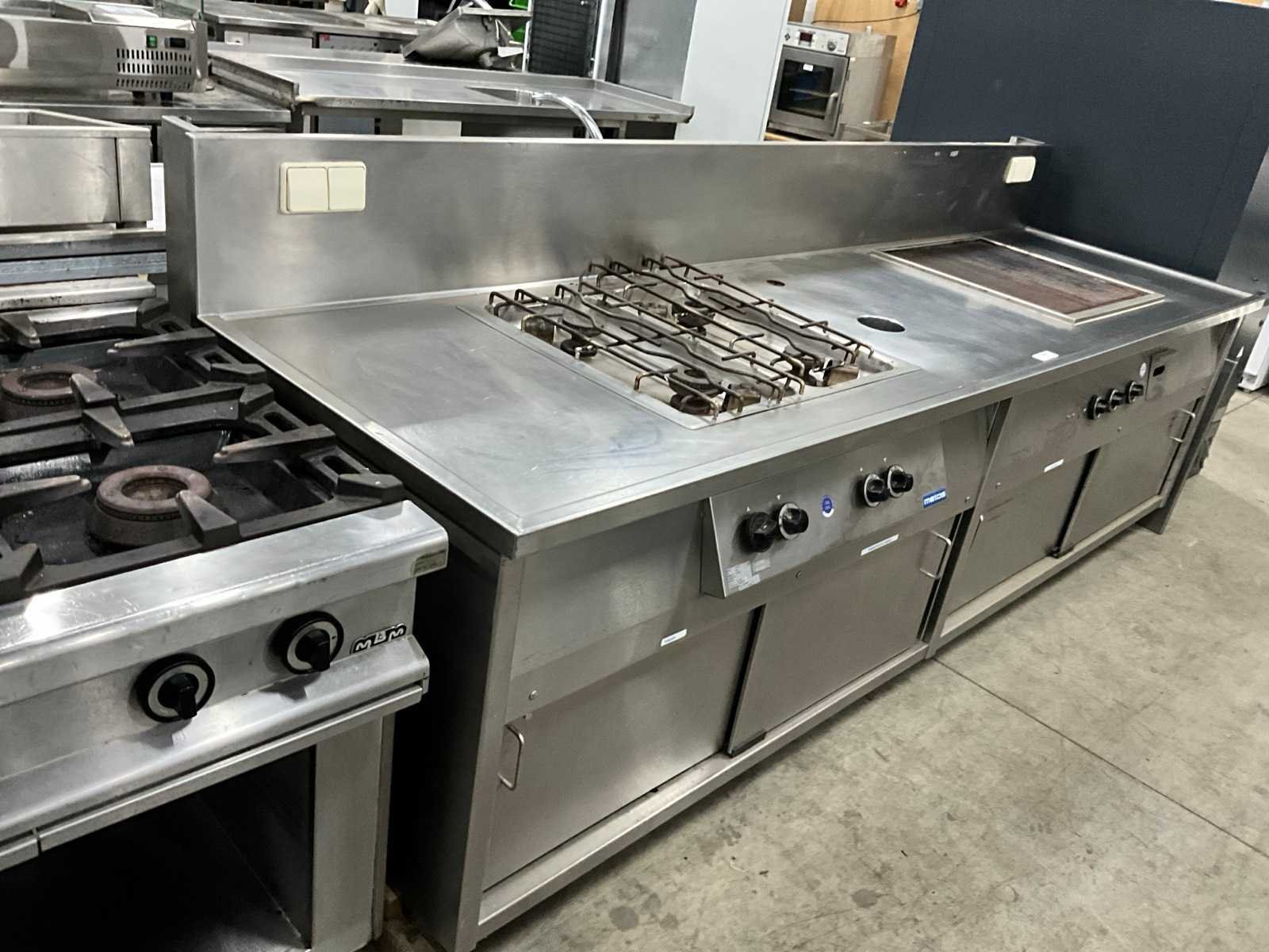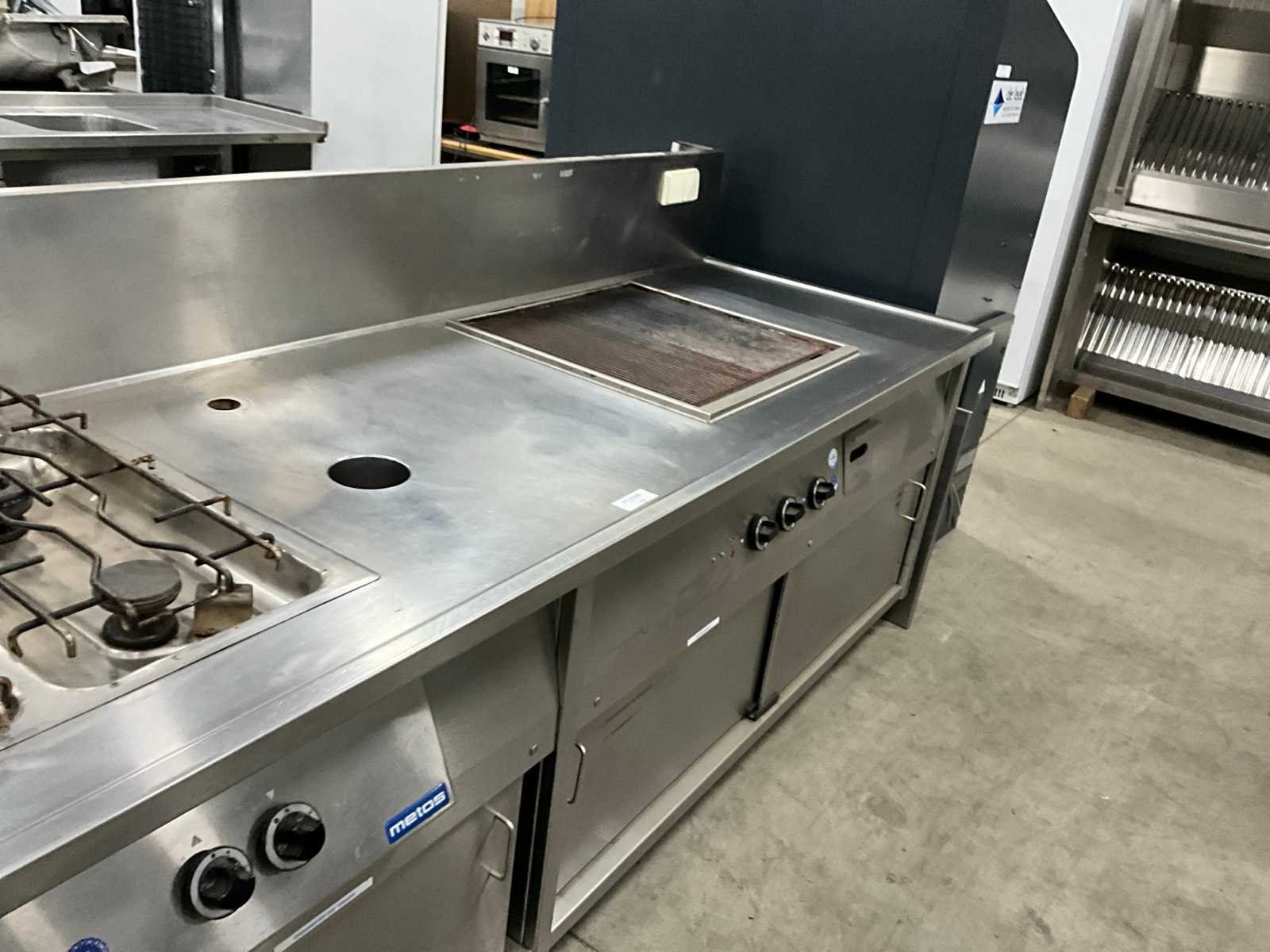 Voorzien van 4-pits gaskookplaat en elektrische bakplaat.; 17 kw. Merk: Metos Model: IGH 410 Totale afmeting Breedte: 2980mm Totale afmeting L: 960mm Totale afmeting Hoogte: 1150mm