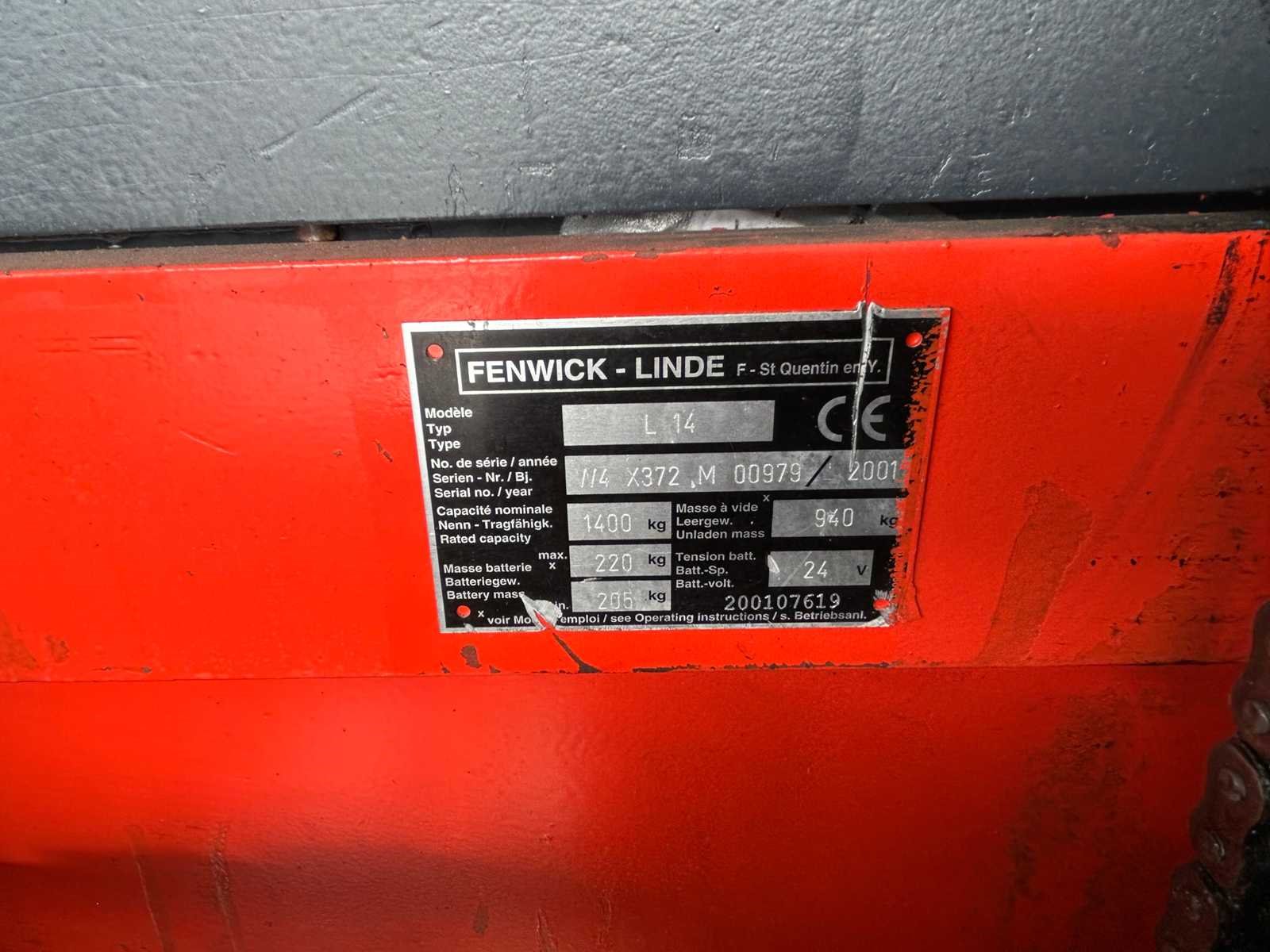 Acculader uit 2021, rijdt soms niet. Vorkbreedte 55cm Merk: Linde Type: L14 Bouwjaar: 2001 Hefvermogen: 1400kg Hefhoogte: 2500mm Minimale doorrijhoogte: 1700mm Totale afmeting L: 2150mm Totale afmeting Breedte: 830mm Accu lader: true