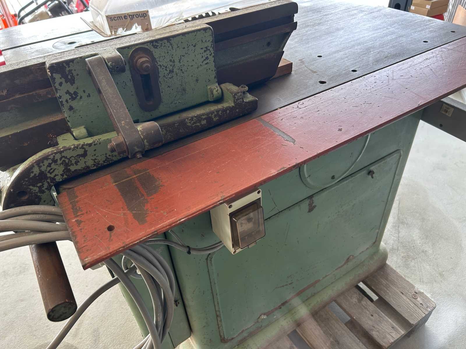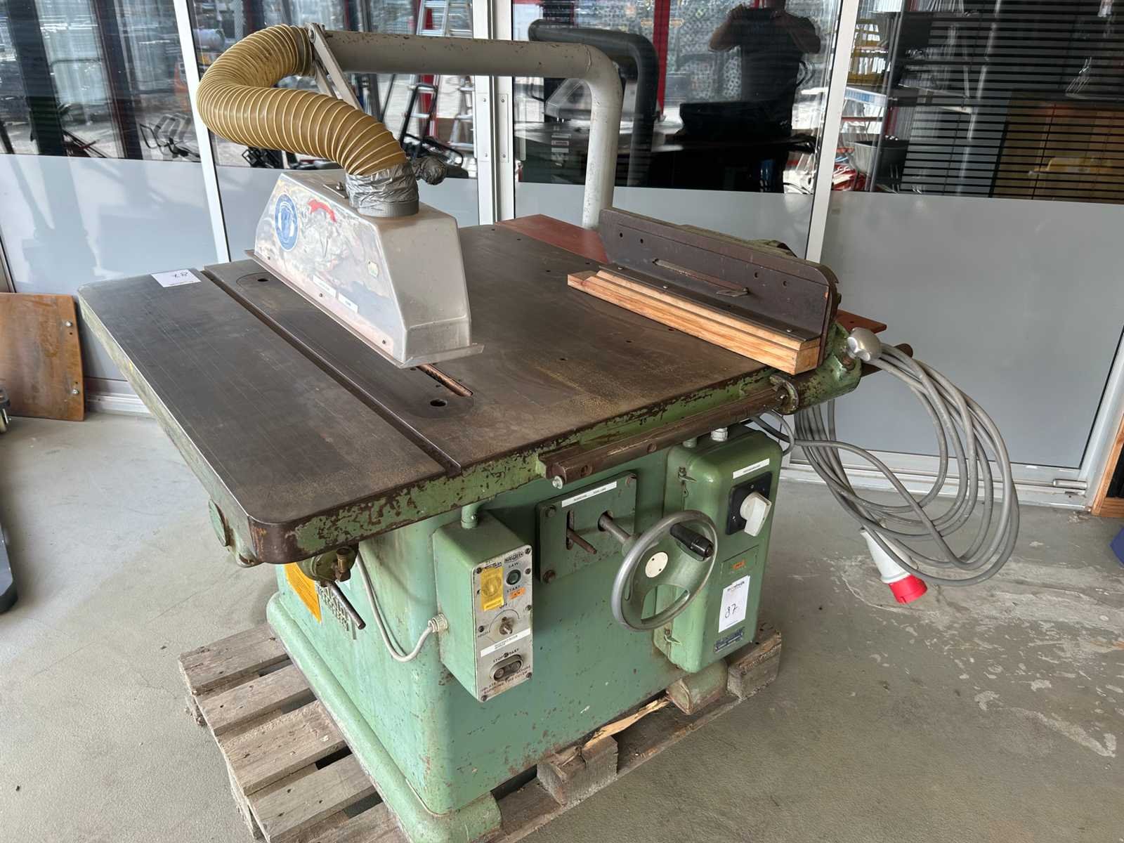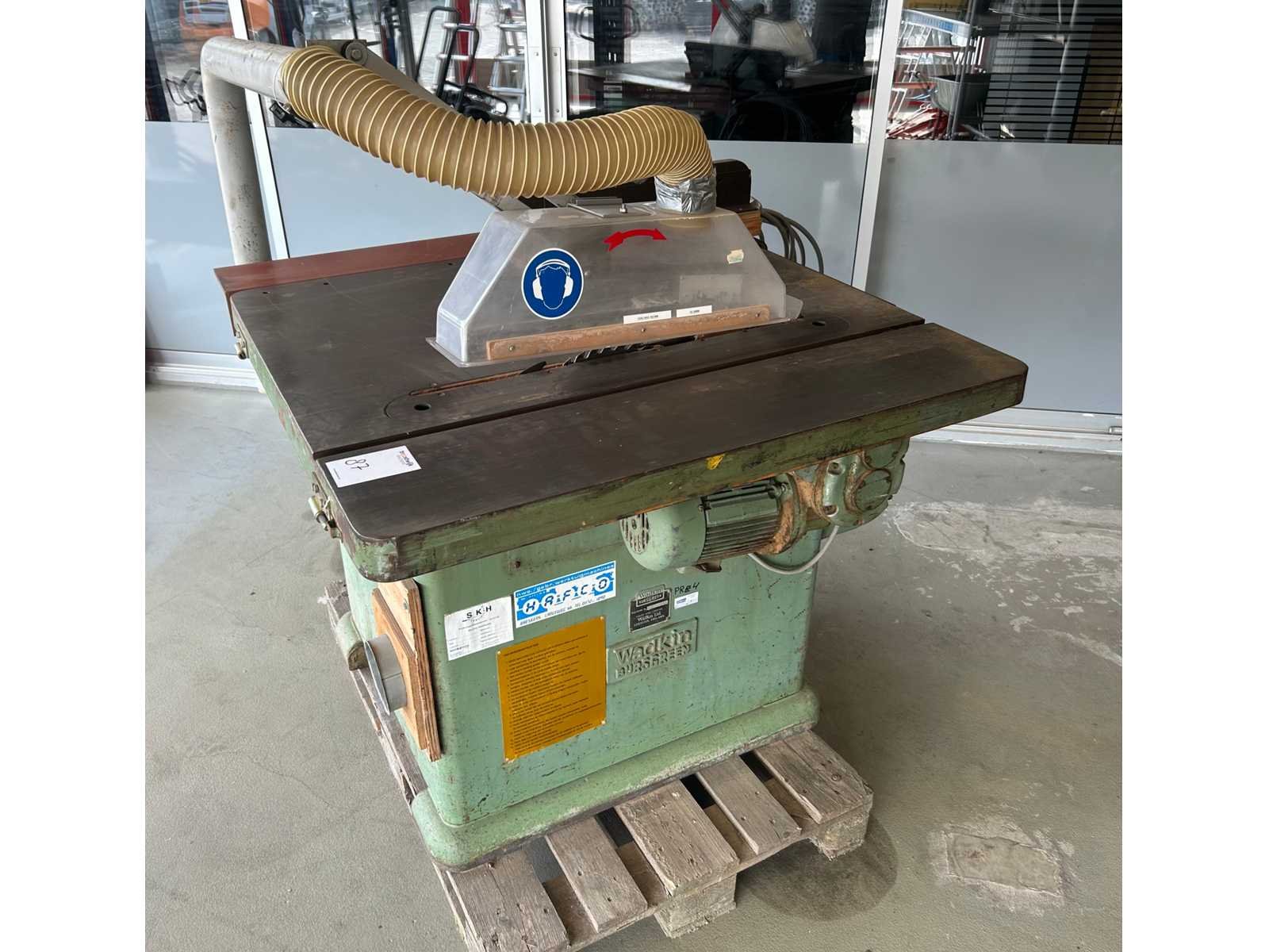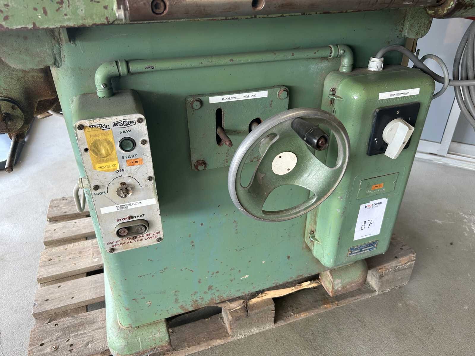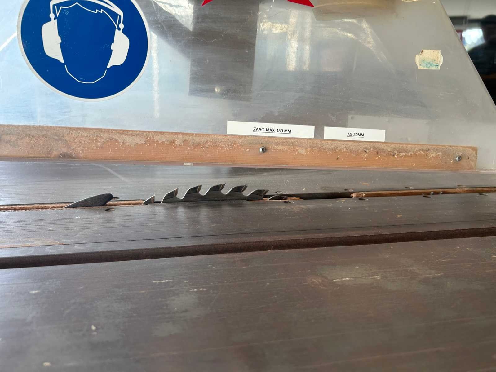 Voorzien van doorvoerwals, asgat 30mm, zaaghoogte: 120 mm. Merk: Wadkin Model: Bursgreen Spanning: 400V Diameter zaagblad: 450 Lengte: 1300mm Breedte: 1150mm Hoogte: 1500mm