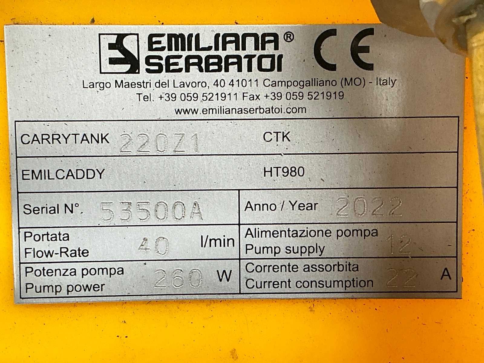 Tank inhoud ca 220L; Pomp 260W / 12V, 40 liter p/min Merk: EMILIANA SERBATOI Bouwjaar: 2022 Serienummer: 53500A Afmeting l: 880mm Afmeting b: 590mm Afmeting h: 670mm
